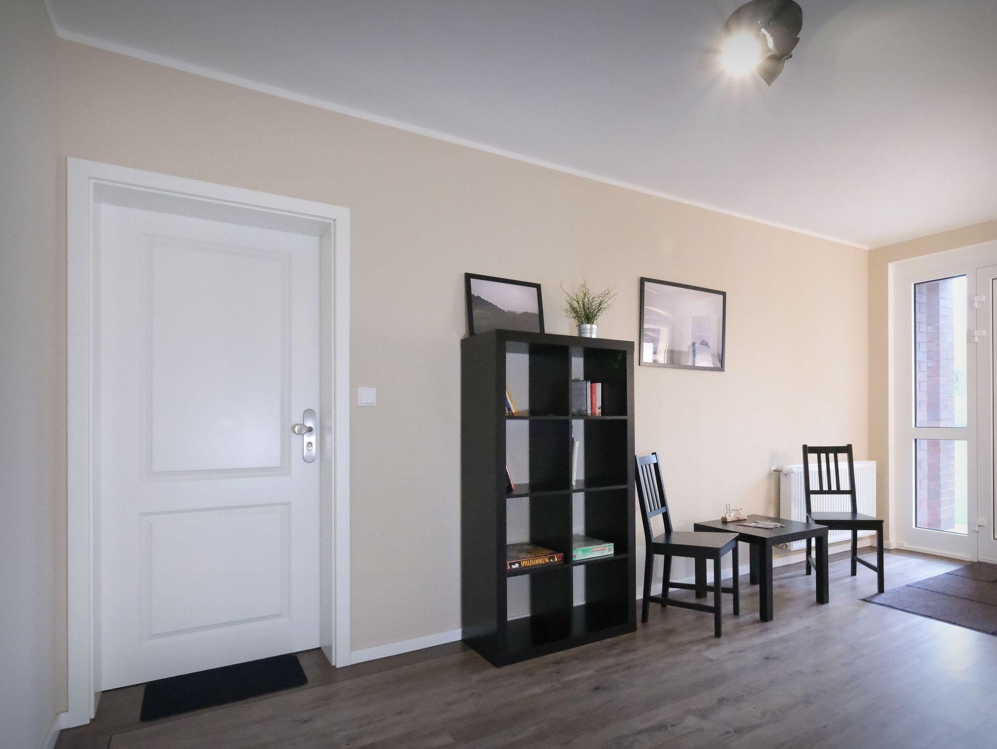 Die Wohnung Nr. 2 im Friesenhuus Carolinensiel verfügt über einen geräumigen Flur mit Garderobe und gewährt Zutritt zum modernen Badezimmer mit WC, Waschtisch, bodengleicher Dusche und Fön. Den Mittelpunkt der Wohnung stellt der offen gestalte Wohn- und Essbereich mit großer Fensterfront zu Terrasse und Garten dar. Hier lädt eine gemütliche Couch-Ecke mit Sessel zum Verweilen ein. Für die passende Unterhaltung sorgen Gesellschaftsspiele, ein Flachbild-TV mit Smart-TV, Blu-ray-Player und Hi-Fi-System. Die hochwertige Küchenzeile ist voll ausgestattet und verfügt über eine Spülmaschine, einen Backofen mit Cerankochfeld, eine Mikrowelle, einen großen Kühlschrank mit separatem Gefrierfach, eine Kaffeemaschine (wahlweise Pad oder Filter), einen Wasserkocher, Toaster u.v.m. Am Esstisch finden bis zu 5 Personen Platz.