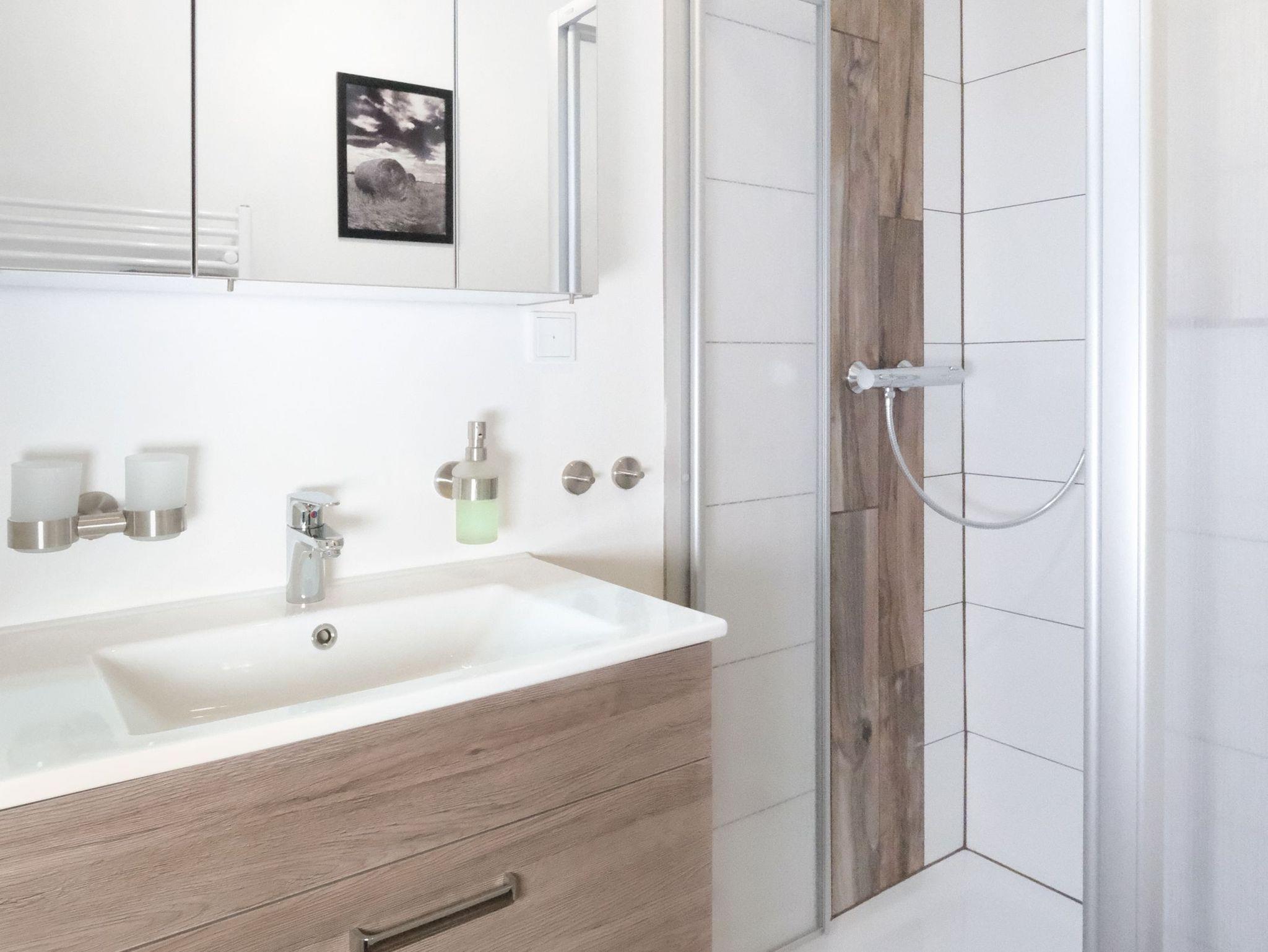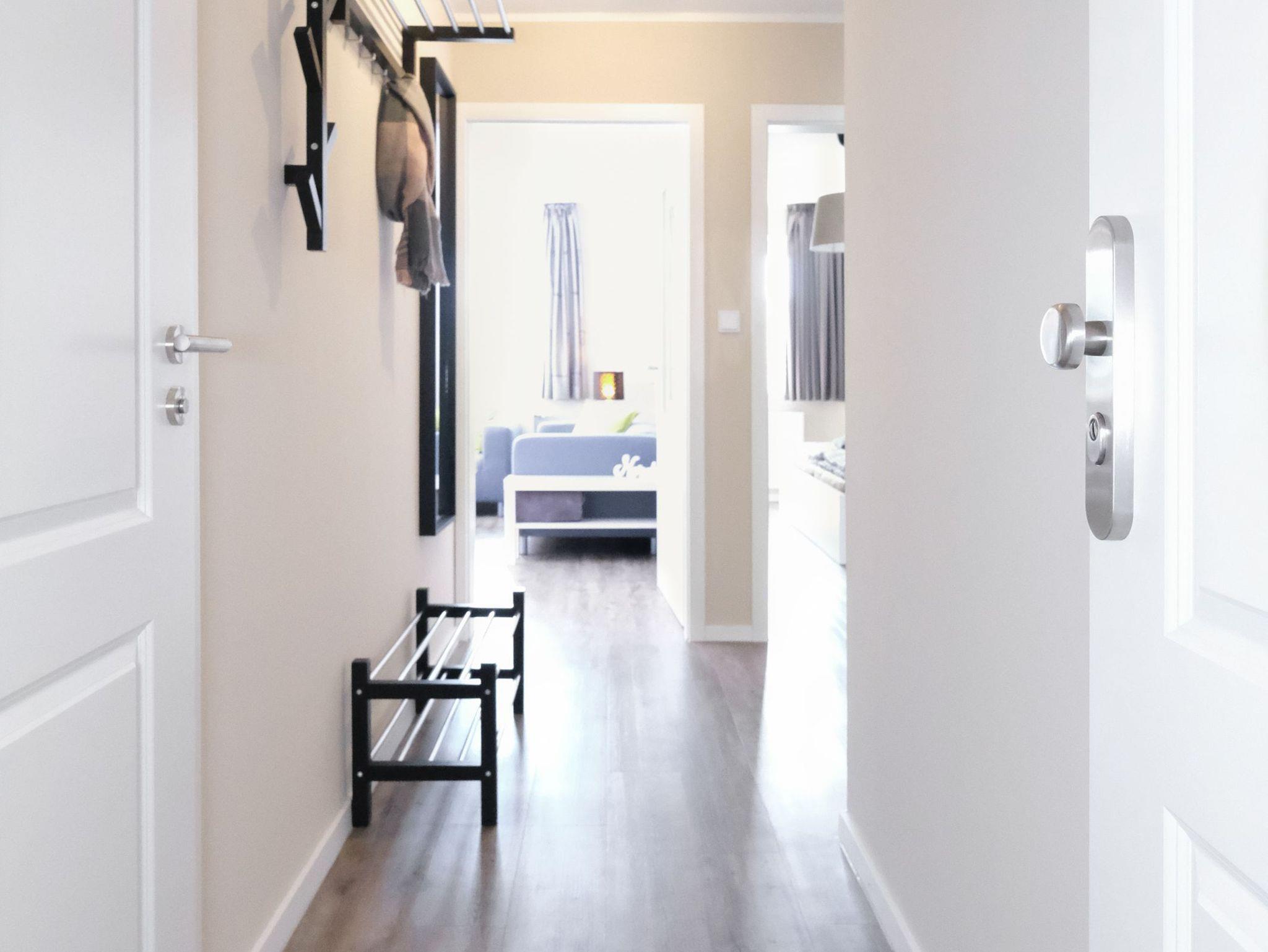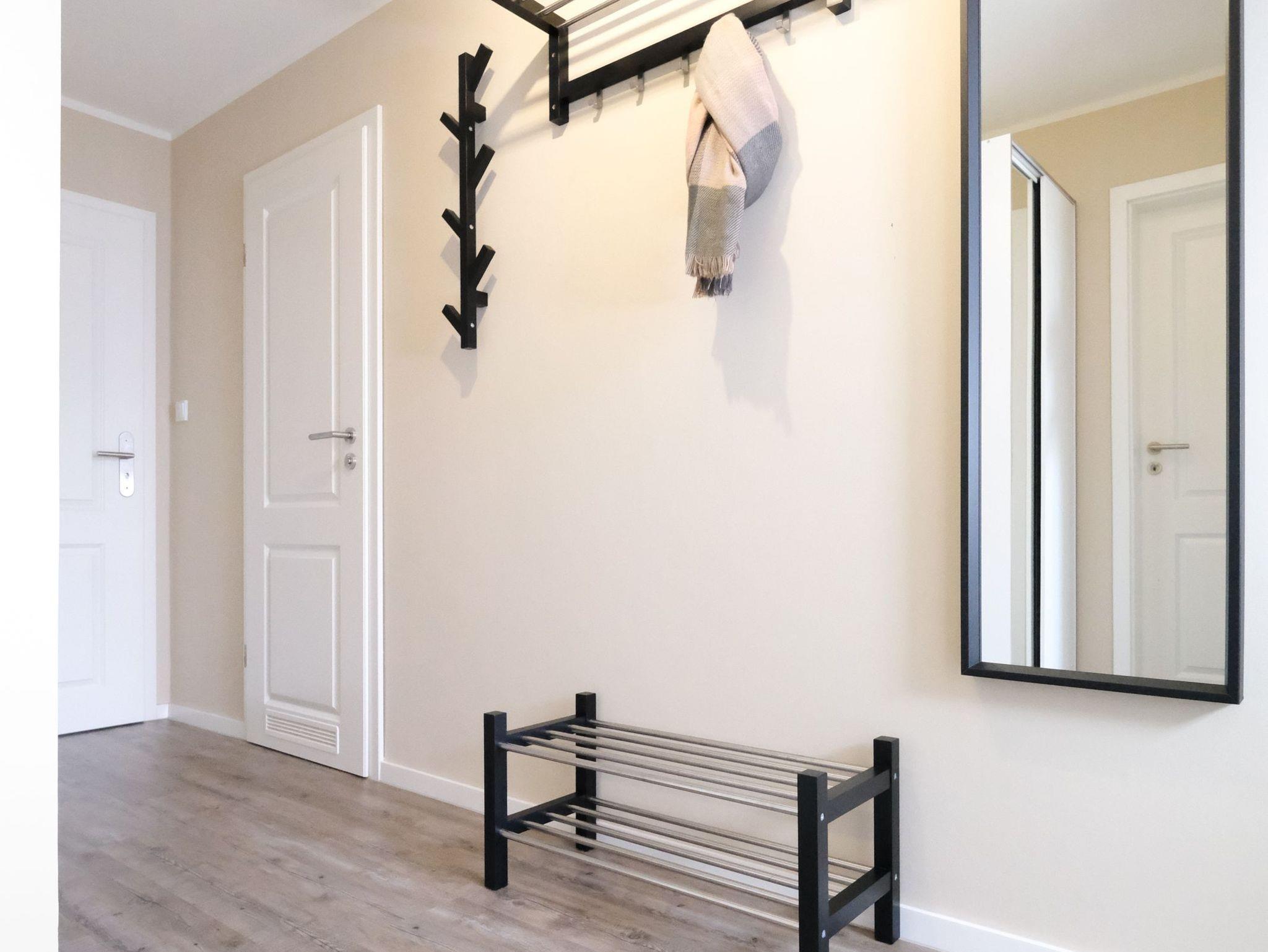 Im großzügig geschnittenen Flur steht für Sie ein geräumiger Spiegelschrank und eine Garderobe bereit. Von hier aus gelangen Sie in das moderne Badezimmer mit WC, Waschtisch, bodengleicher Dusche und Fön.