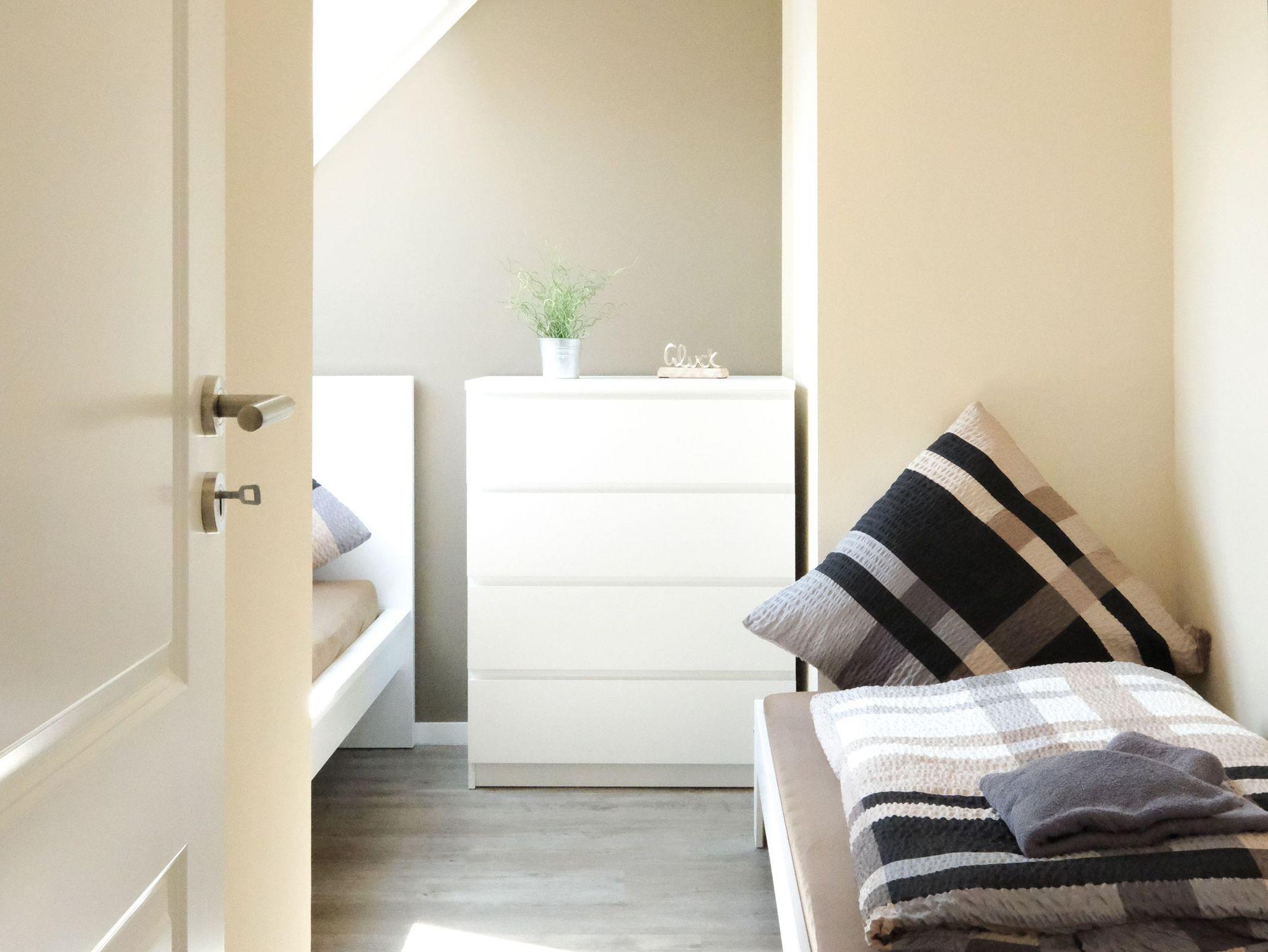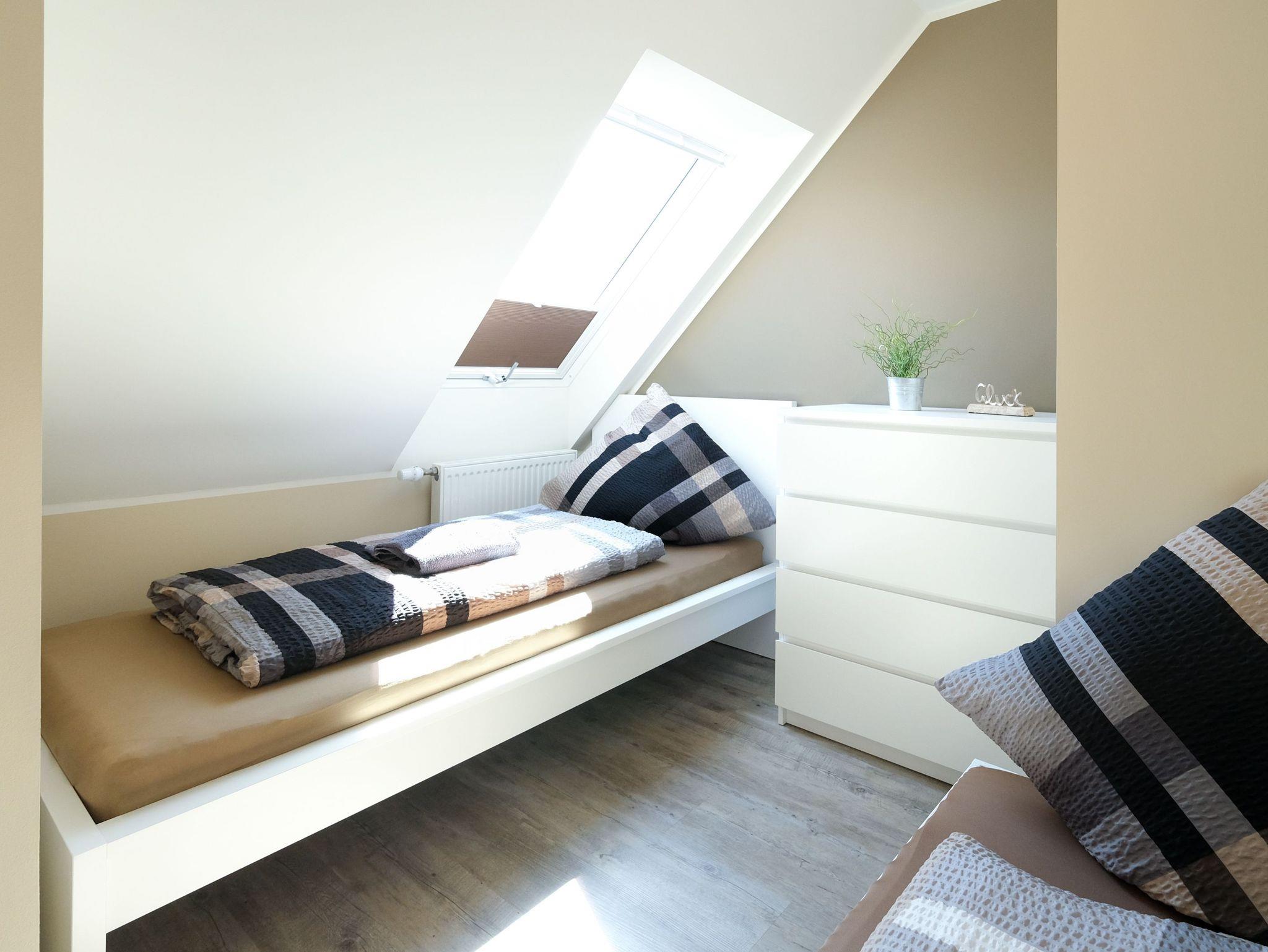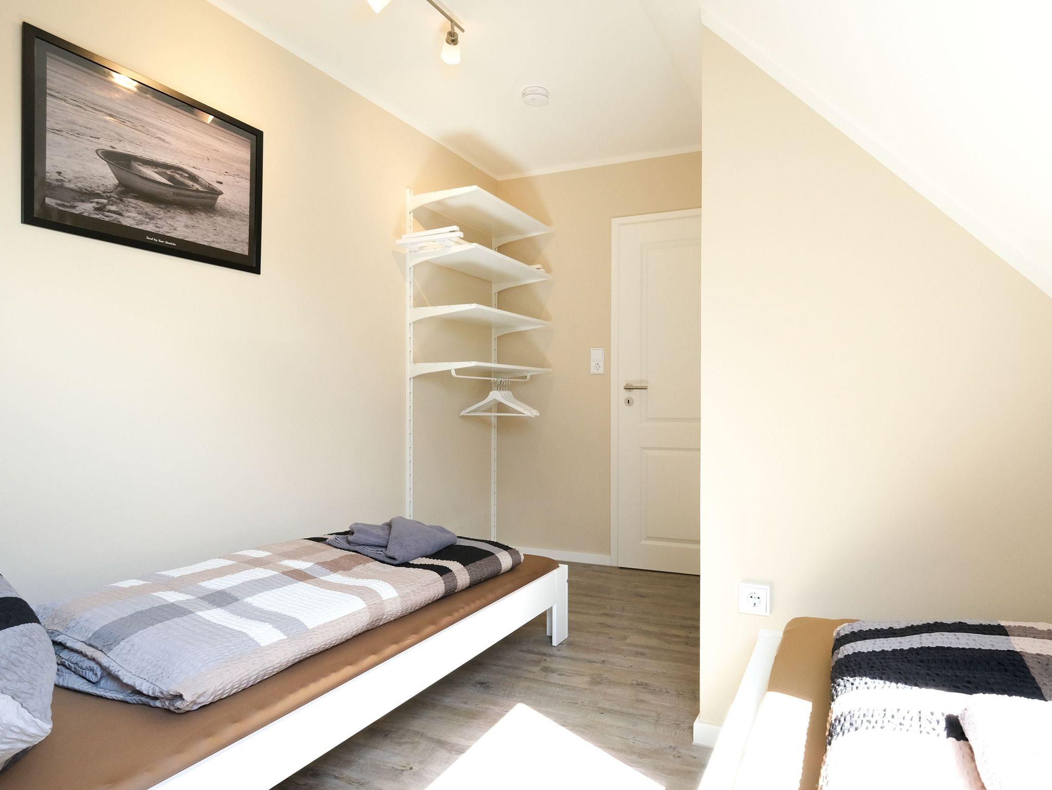 Das Elternschlafzimmer ist in Richtung Süden ausgerichtet und bietet ausreichend Platz für ein Beistellbett für Babys. Es ist mit einem Doppelbett (180x200) mit offenem Fußende, Wandschrank und Verdunkelungsmöglichkeit ausgestattet. Im zweiten Schlafzimmer stehen Ihnen zwei getrennte Betten (90x200) und ein Wandschrank zur Verfügung. Ein großes Dachflächenfenster ermöglicht den Blick zu den Sternen und verfügt über ein Verdunklungsrollo.