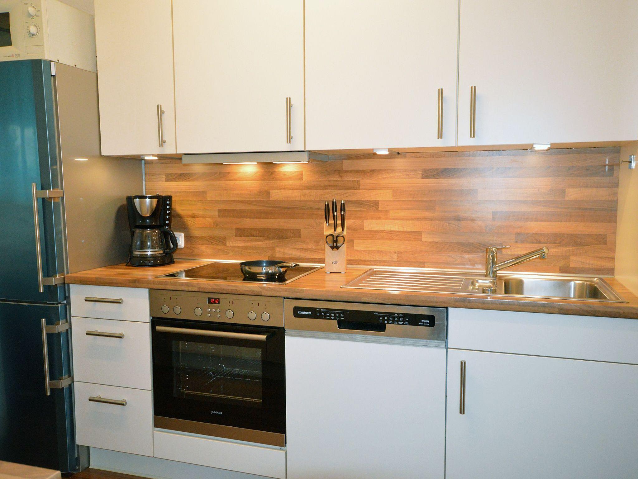Die separate Küche mit komplett eingerichteter Küchenzeile, Cerankochfeld, Backofen, Microwelle, Spülmaschine und Kühlschrank und unten runter Gefrierschrank.