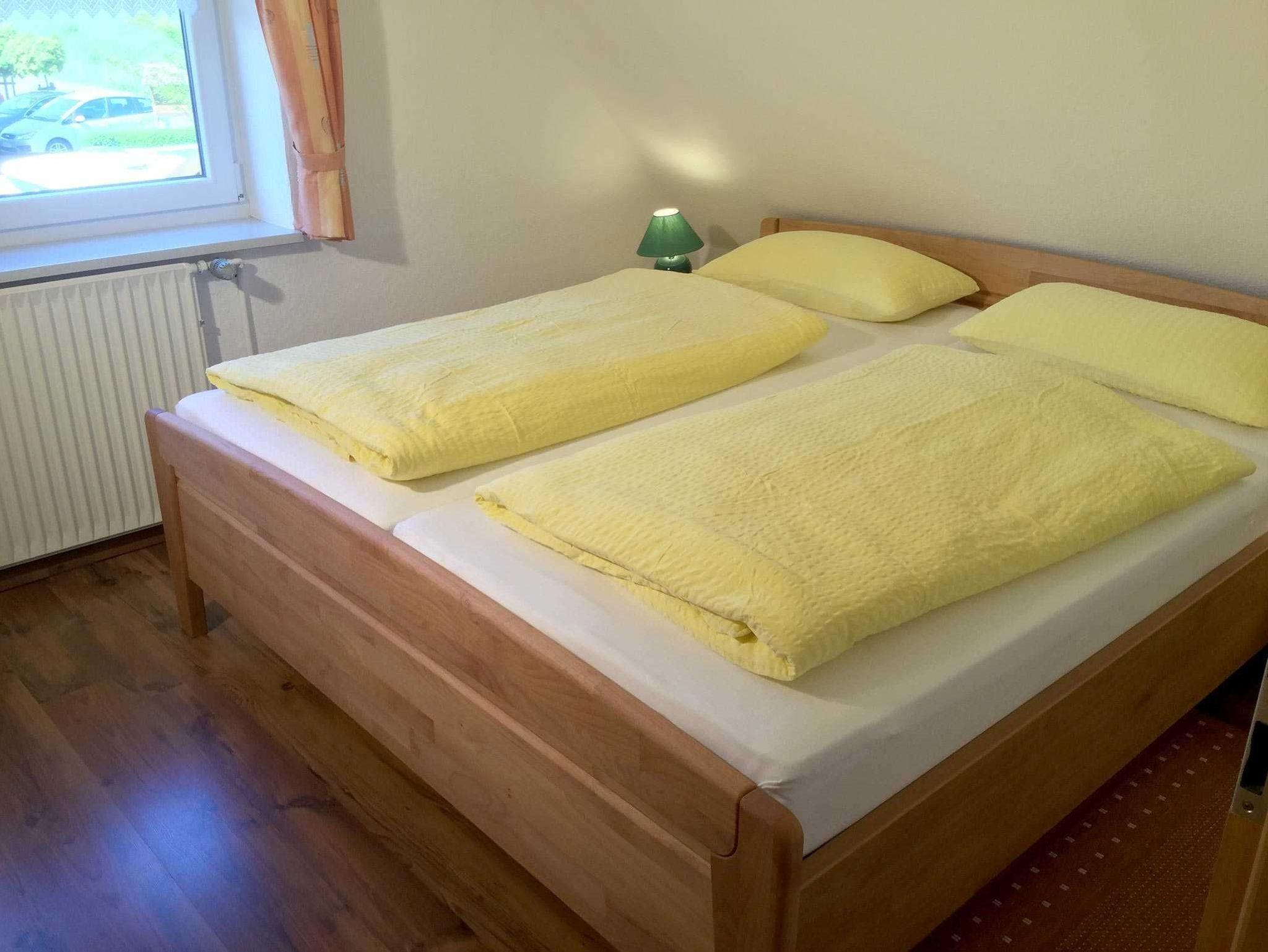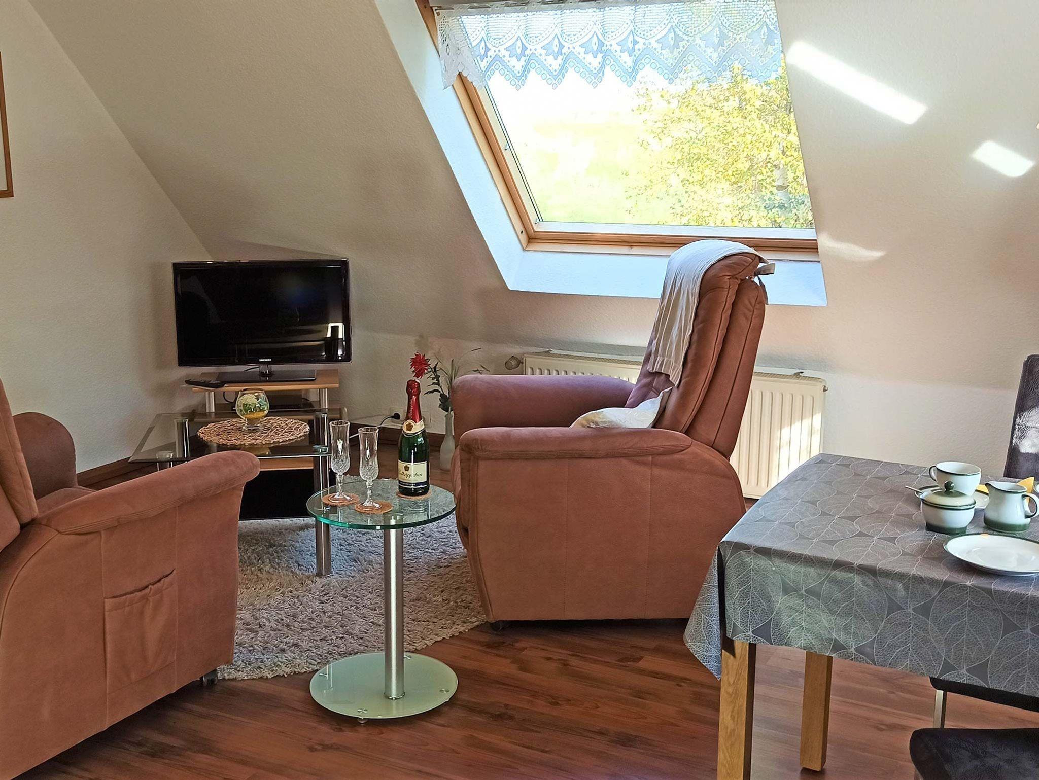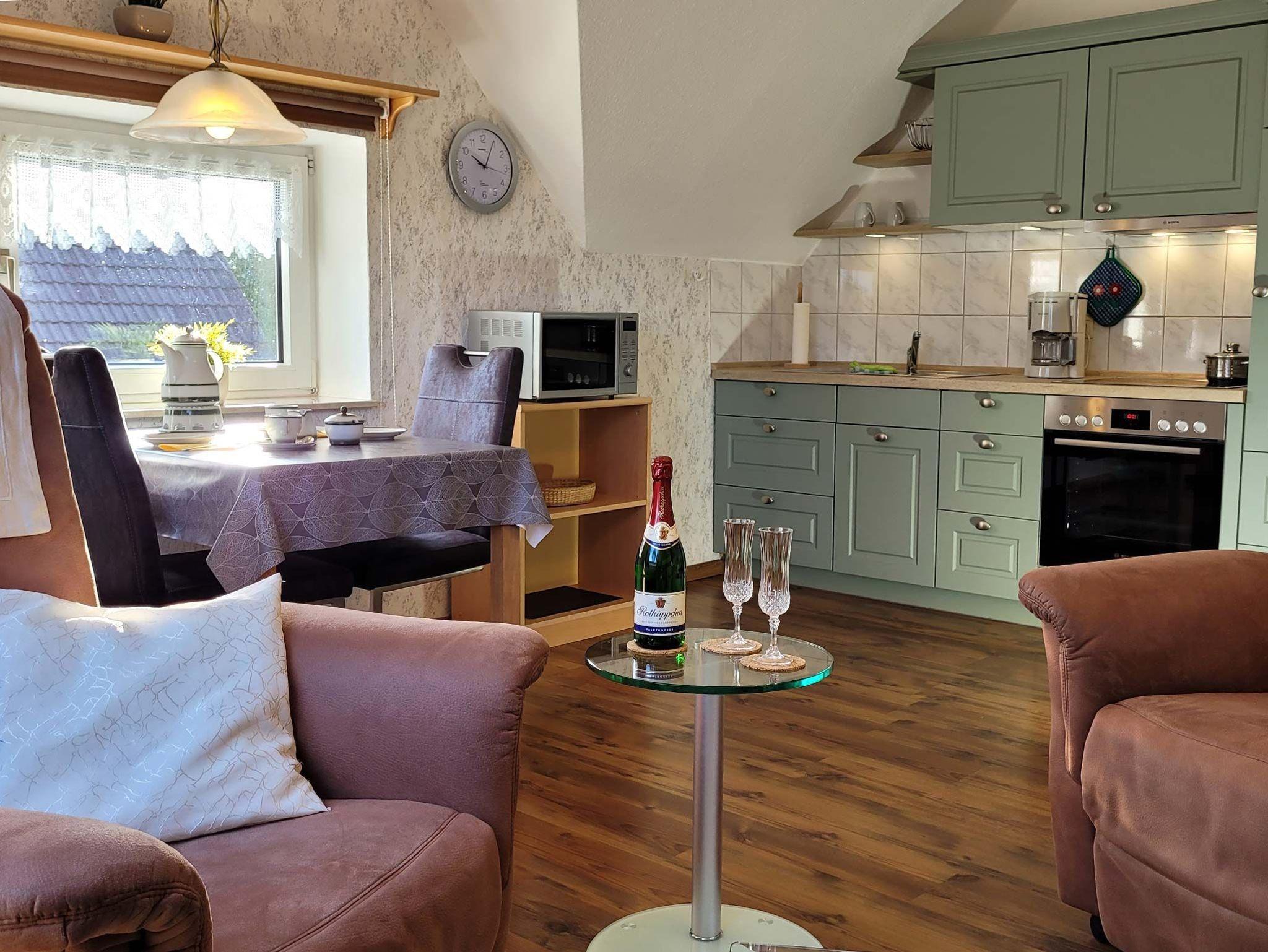 Großzügige und komfortabel eingerichtete Oberwohnung (ca. 45 qm) für 2 Personen, die folgendermaßen ausgestattet ist: Wohnküche mit komplett eingerichteter Küchenzeile, Essecke, 2 TV-Sessel, Sat-HDTV, DVD, Internetradio, kostenloses WLAN. Schlafraum mit Doppelbett, Bettwäsche und Handtücher-Erstausstattung inklusive. Bad mit Dusche und WC, Flur. Fliegengitter vorhanden. Eigene Terrasse im Garten. Für Ihren Pkw steht ein Carport zur Verfügung. Nichtraucherwohnung!