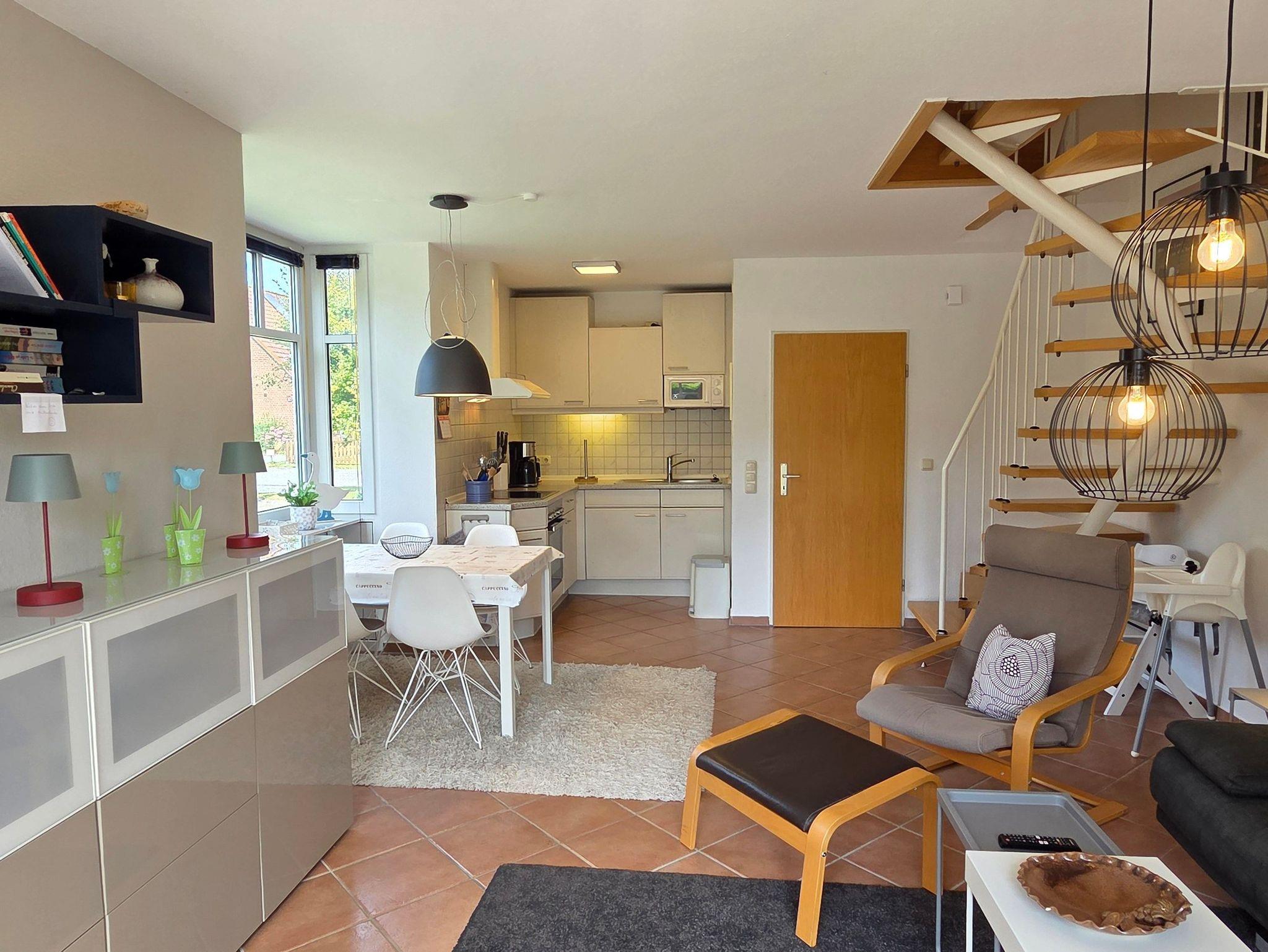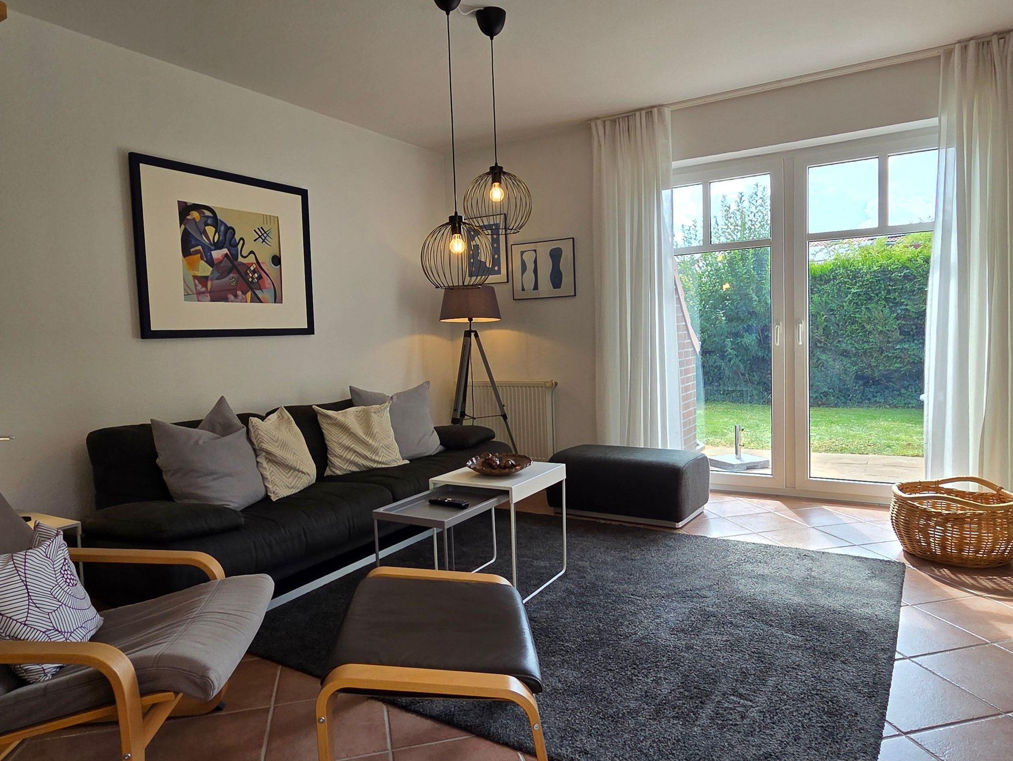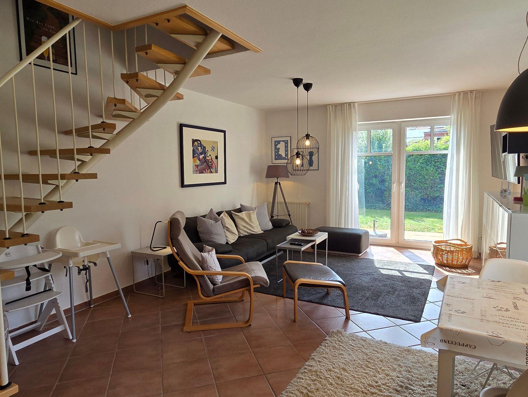 Das Reihenendhaus bietet auf ca. 70m² ausreichend Platz für 4 Personen und ein Baby/Kleinkind. Im Erdgeschoss befindet sich ein großzügiger und lichtdurchfluteter Wohn- und Essbereich mit einer offenen Küche, sowie ein Gäste-WC. Vom Wohnraum aus führt eine offene Treppe ins Obergeschoss, hier stehen ein Schlafzimmer mit einem Doppelbett, ein Schlafzimmer mit zwei Einzelbetten und ein Duschbad mit WC zur Verfügung. In allen Räumen sind Fliesen bzw. Laminat verlegt. WLAN steht Ihnen kostenlos zur Verfügung.