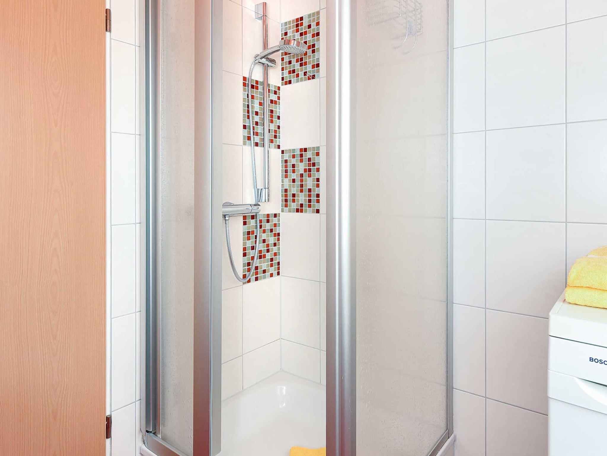 Badezimmer mit Dusche, Waschtisch und WC