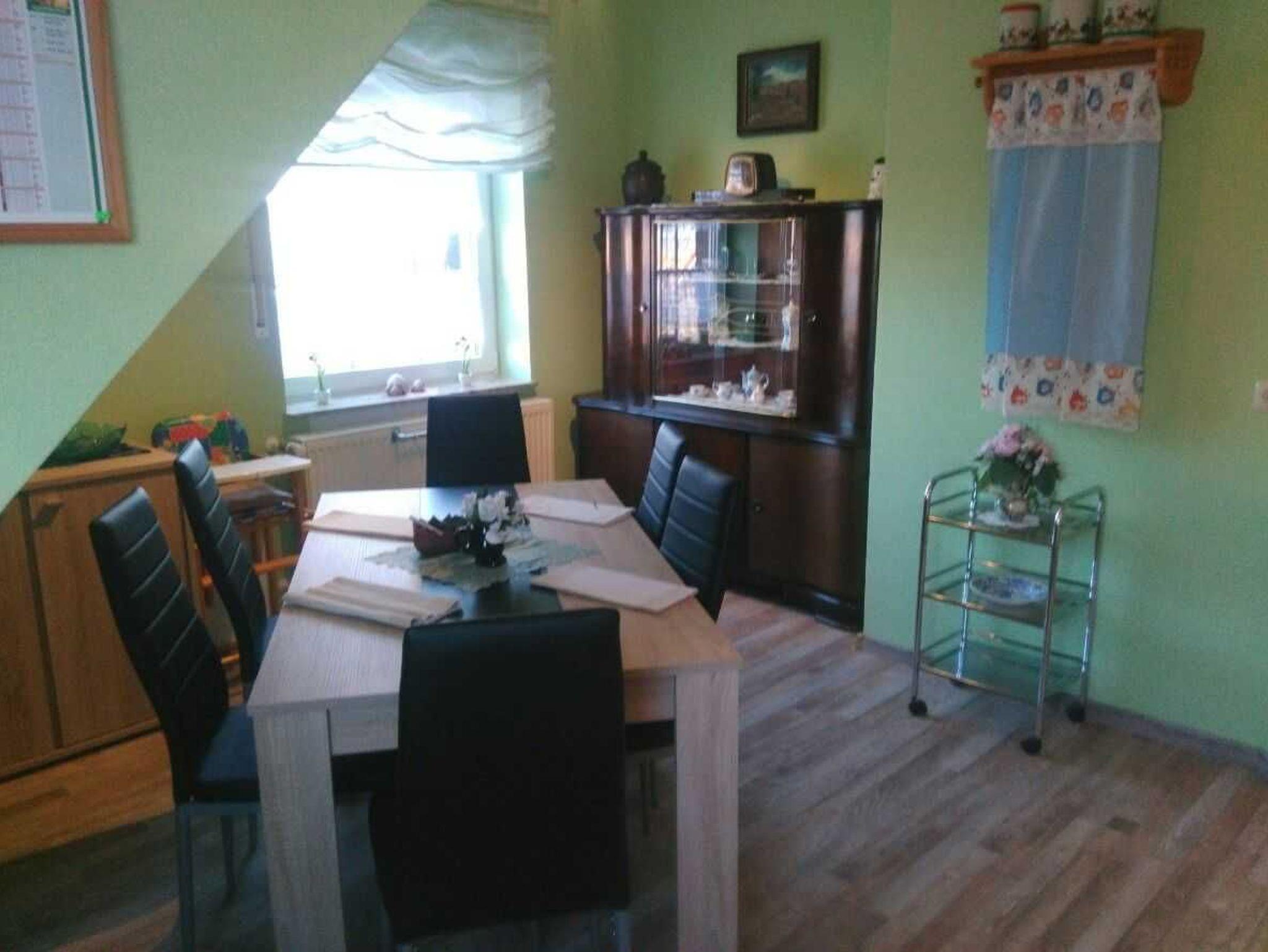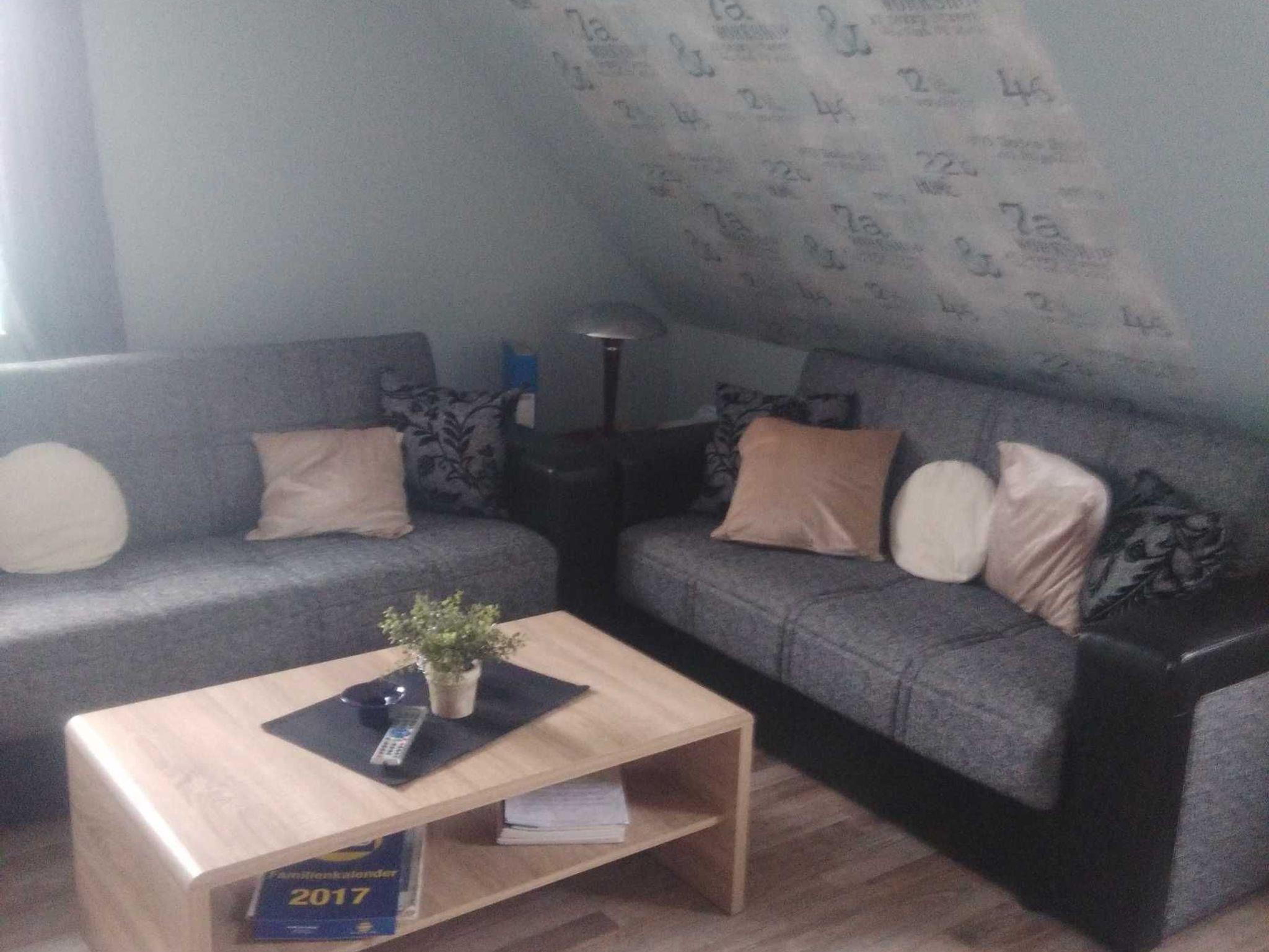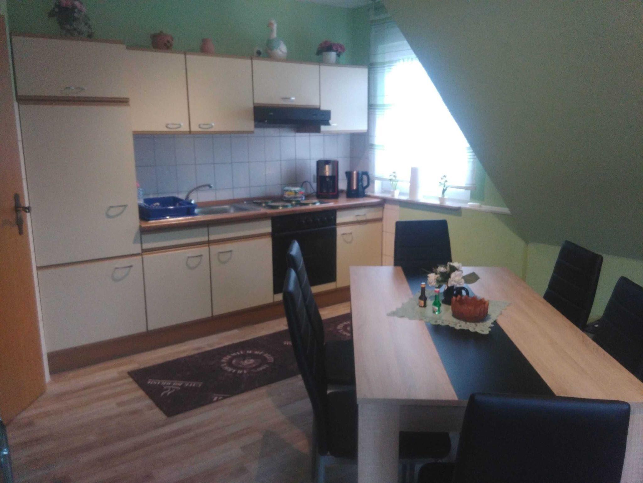 Küche: komplett eingerichtete Einbauküche mit E.-Herd + Backofen, Kühlschrank, Toaster, Eierkocher, Kaffeemaschine, Bügeleisen, Bügelbrett,Tisch + 6 Stühlen, Kinderhochstuhl. Wohnzimmer: gemütliche 2er und 3er Couch, Sat-TV, Anbauschrankwand. Schlafzimmer 1: Doppelbett, Nachtschränke, Kleiderschrank; Schlafzimmer 2. Doppelbett, Nachtschränke, Kleiderschrank, Kindergitterbett oder Reisebett kann bei Bedarf aufgebaut werden. Das Bad mit Dusche, Waschtisch, WC und Kindertöpfchen liegt direkt neben dem Elternschlafzimmer. Nichtraucherwohnung.Unten im Garten eine eigene Terrasse.