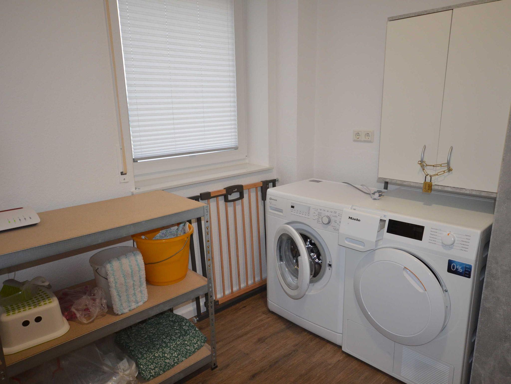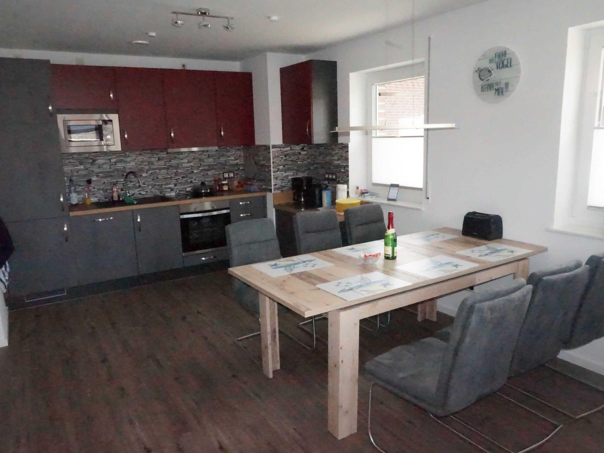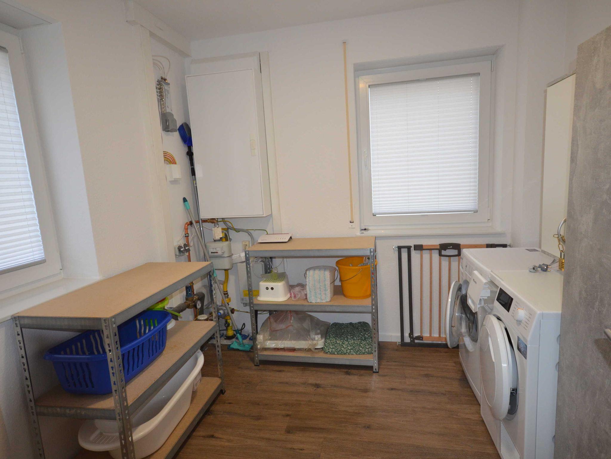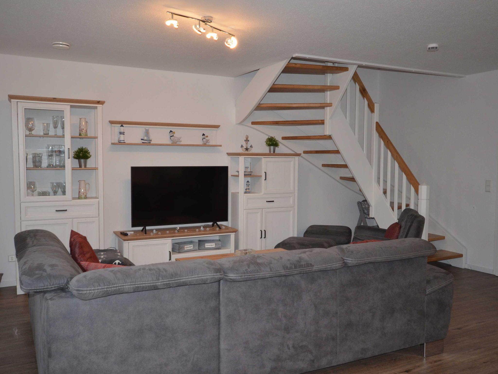 In der unteren Etage ist der großzügige Wohn- und Essbereich mit moderner offener Küchenzeile. Sowohl im Wohn- als auch im Essbereich ist ausreichend Platz für alle Gäste. Auch in diesem Raum befindet sich ein großer Flachbildfernseher. Eine Auswahl an Gesellschaftsspielen und Büchern stehen Ihnen genauso zur Verfügung wie kostenloses WLAN. Außerdem befindet sich in dieser Etage ein geräumiger Abstellraum. Die große, sonnige Terrasse mit bequemen Gartenmöbeln lädt zum Verweilen und Sonnen ein. Da die Terrasse komplett umzäunt ist, können Sie auch Ihre kleinen Kinder gefahrlos auf dem Rasen der Terrasse spielen lassen und müssen Sie nicht jede Sekunde im Auge haben. In unserem Fahrradschuppen steht Ihnen auch ein Bollerwagen zur Verfügung.