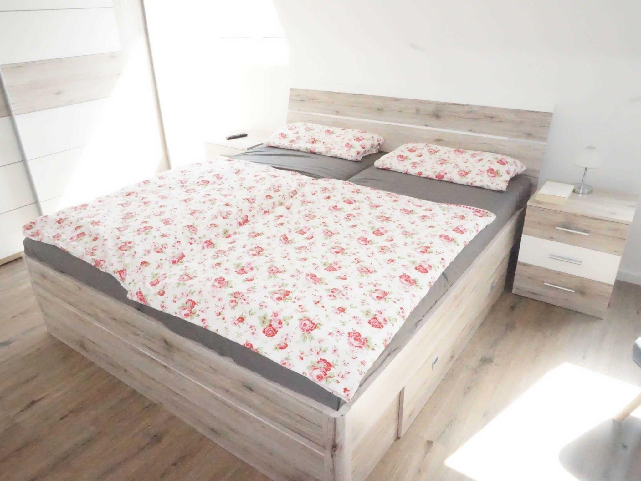 • Schlafzimmer 1 verfügt über ein Doppelbett (Maße: 1,80 x 2,00 Meter) und viel Platz für Ihren Kofferinhalt. In dem geräumigen Zimmer ist außerdem ausreichend Platz für das vorhandene Reisebett.