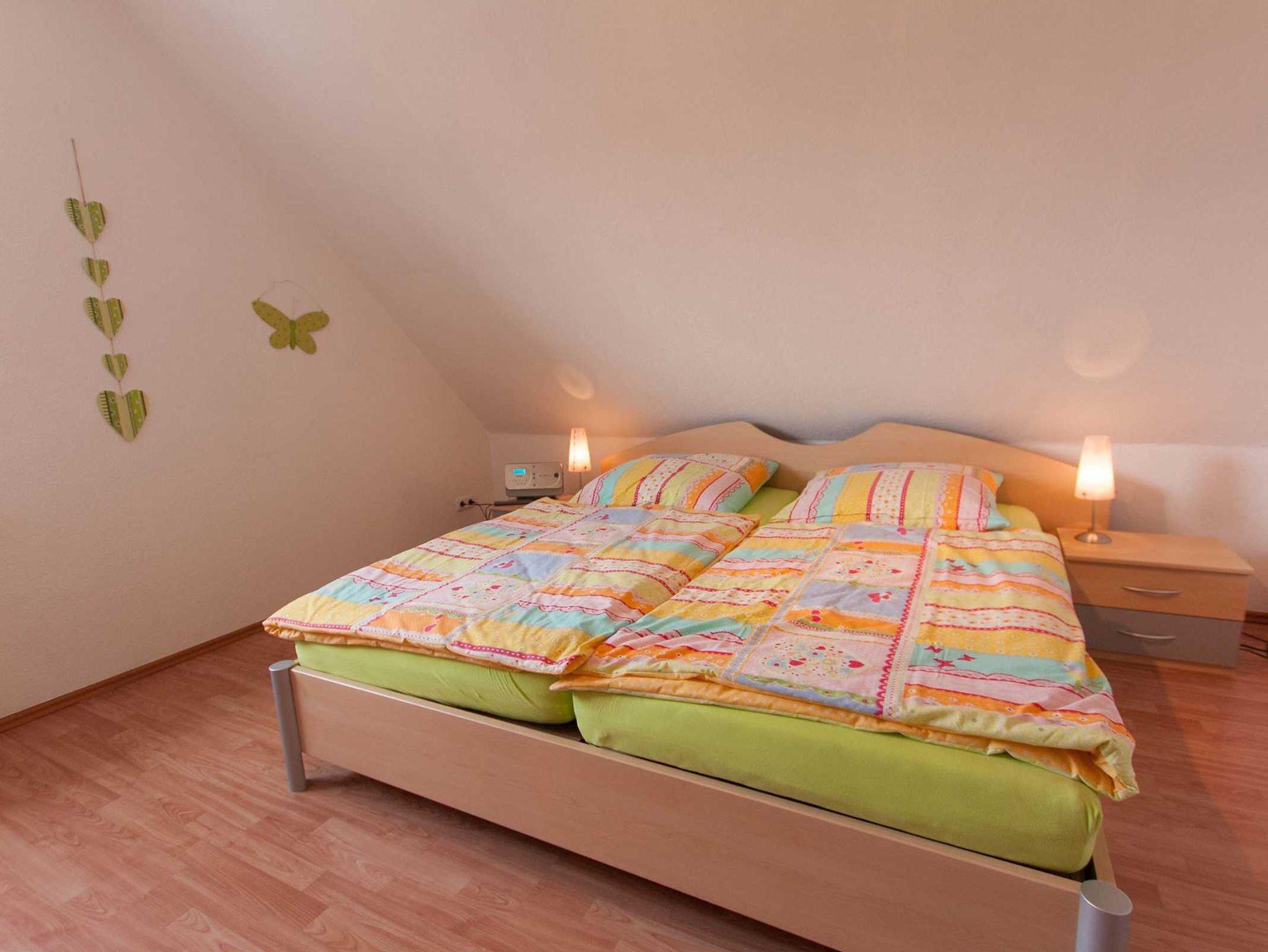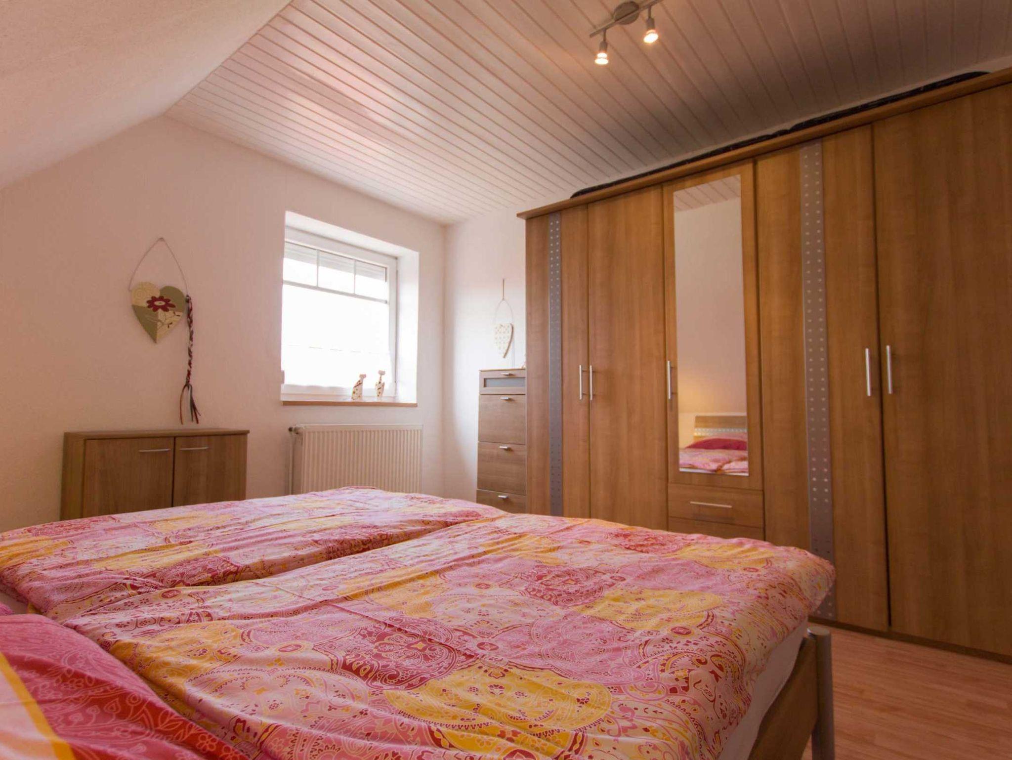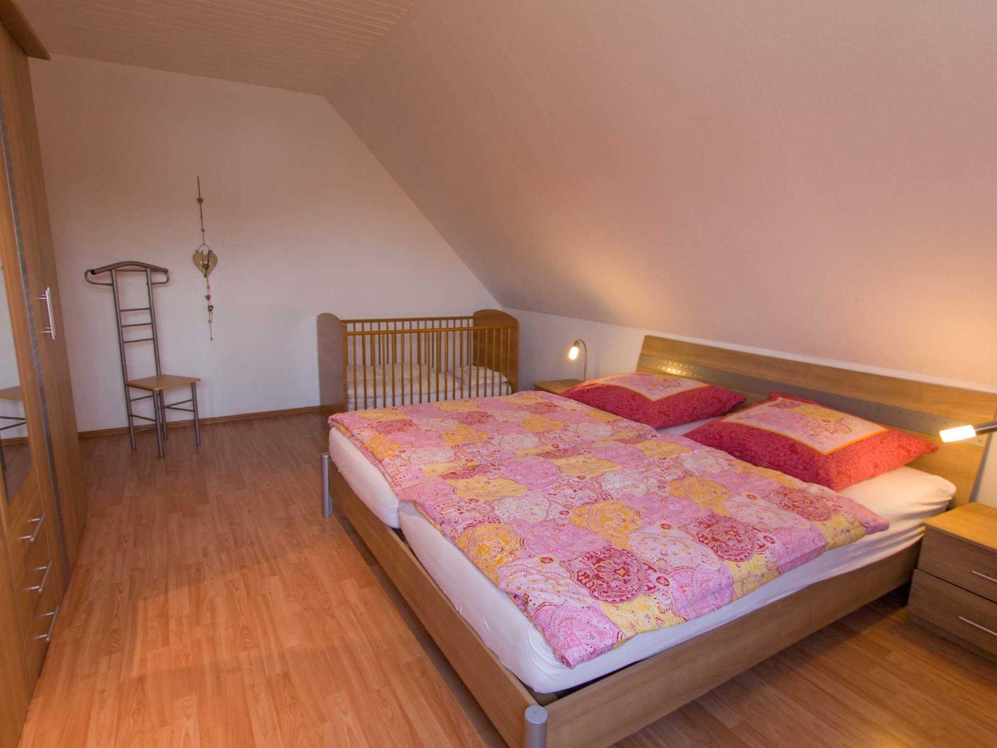Schöne, ca. 70qm große Nichtraucher-Ferienwohnung im Obergeschoss, geeignet für 4 Personen und 1 Kleinkind. Große (ca. 16qm) Dachterrasse mit Gartenmöbeln. Großzügiger, offener Wohn- und Küchenbereich mit gemütlicher Sitzgruppe, SAT-TV, Essecke, Spülmaschine, Backofen usw. Duschbad mit Dusche/WC. 2 Schlafzimmer mit Doppelbett, für 1 Kleinkind sind Kinderbett und Hochstuhl vorhanden. Waschmaschine zur gemeinsamen Nutzung. Haustiere sind nicht erlaubt. W-Lan kostenlos!