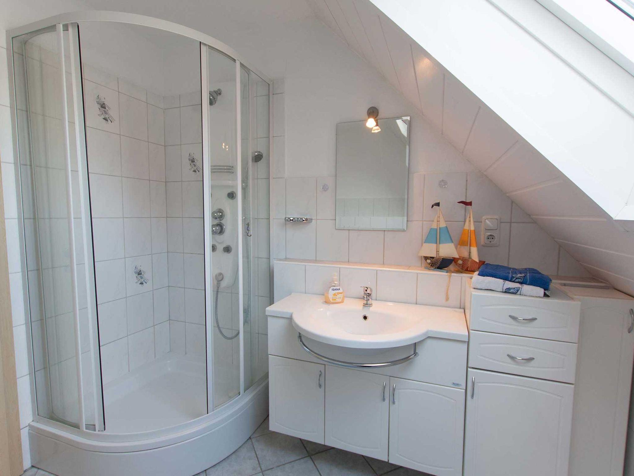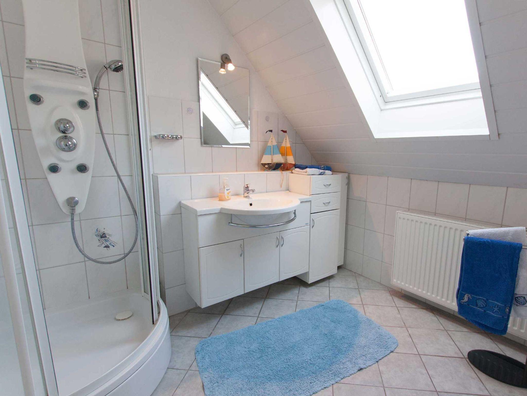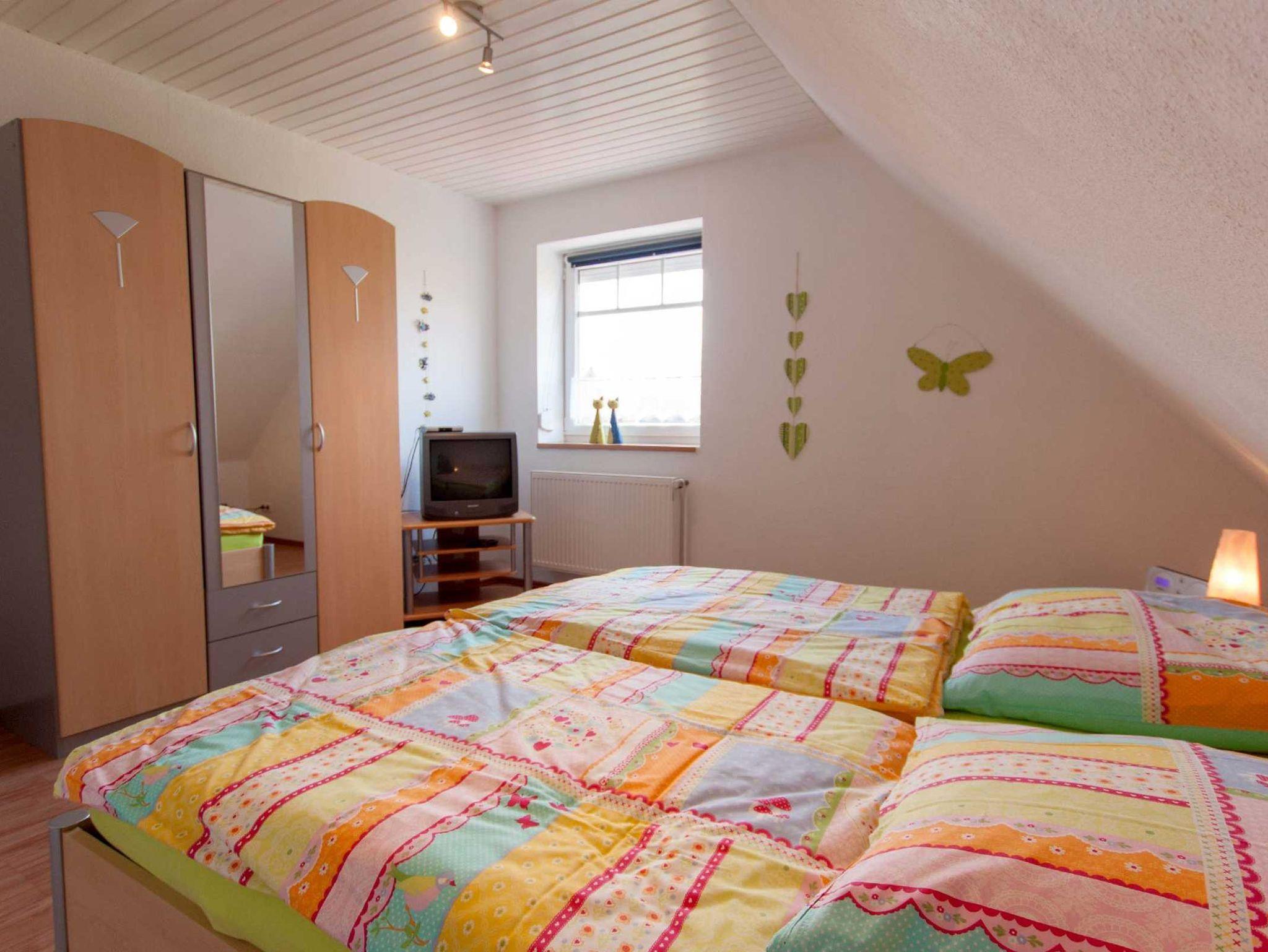 Schöne, ca. 70qm große Nichtraucher-Ferienwohnung im Obergeschoss, geeignet für 4 Personen und 1 Kleinkind. Große (ca. 16qm) Dachterrasse mit Gartenmöbeln. Großzügiger, offener Wohn- und Küchenbereich mit gemütlicher Sitzgruppe, SAT-TV, Essecke, Spülmaschine, Backofen usw. Duschbad mit Dusche/WC. 2 Schlafzimmer mit Doppelbett, für 1 Kleinkind sind Kinderbett und Hochstuhl vorhanden. Waschmaschine zur gemeinsamen Nutzung. Haustiere sind nicht erlaubt. W-Lan kostenlos!