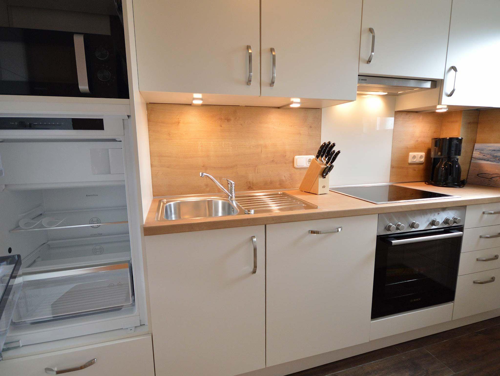 Die sep. Küche mit komplett eingerichteter Küchenzeile, Cerankochfeld,Backofen, Spülmaschine, Microwelle, Kühlschrank mit Gefrierfach etc. Das Schlafzimmer ist mit einem Doppelbett und einem Einzelbett ausgestattet. Das moderne Bad ist mit Dusche/WC,Fön und ein Fenster ausgestattet. Die komplette Ferienwohnung hat Außenrollos. Nichtraucherwohnung!