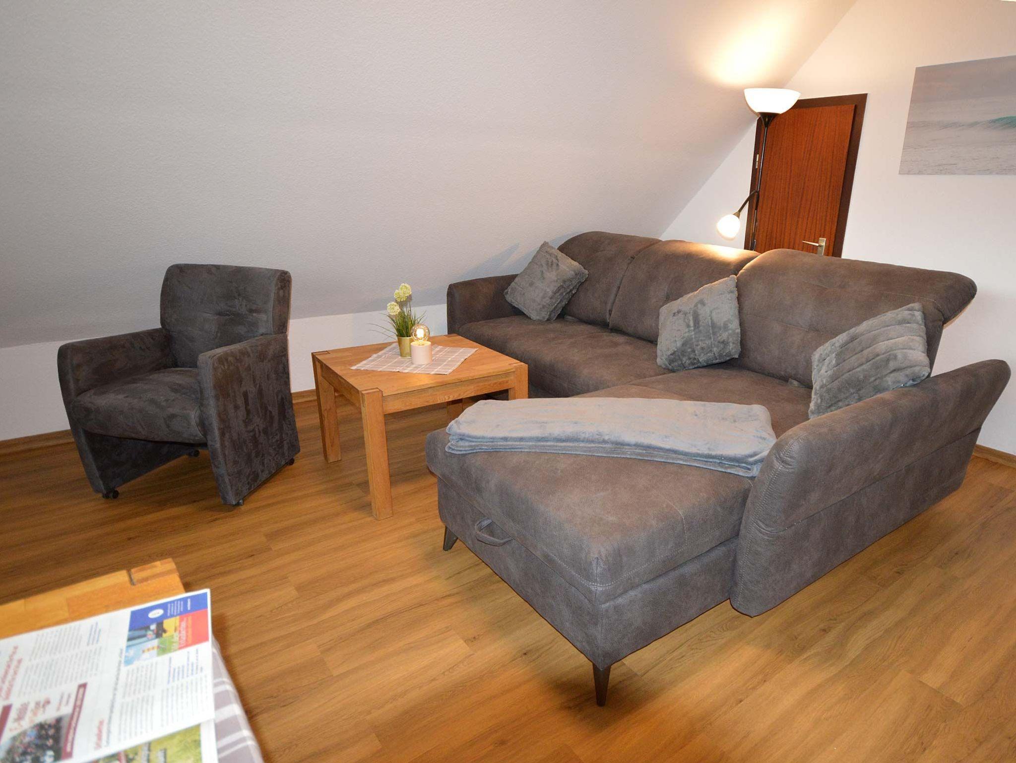 Die helle und gemütlich eingerichtete Ferienwohnung für bis 3 Personen in der 1. Etage mit separatem Eingang. Ein Wohnzimmer mit Couchgarnitur, Essecke, SAT-TV Flachbildschirm und Radio.