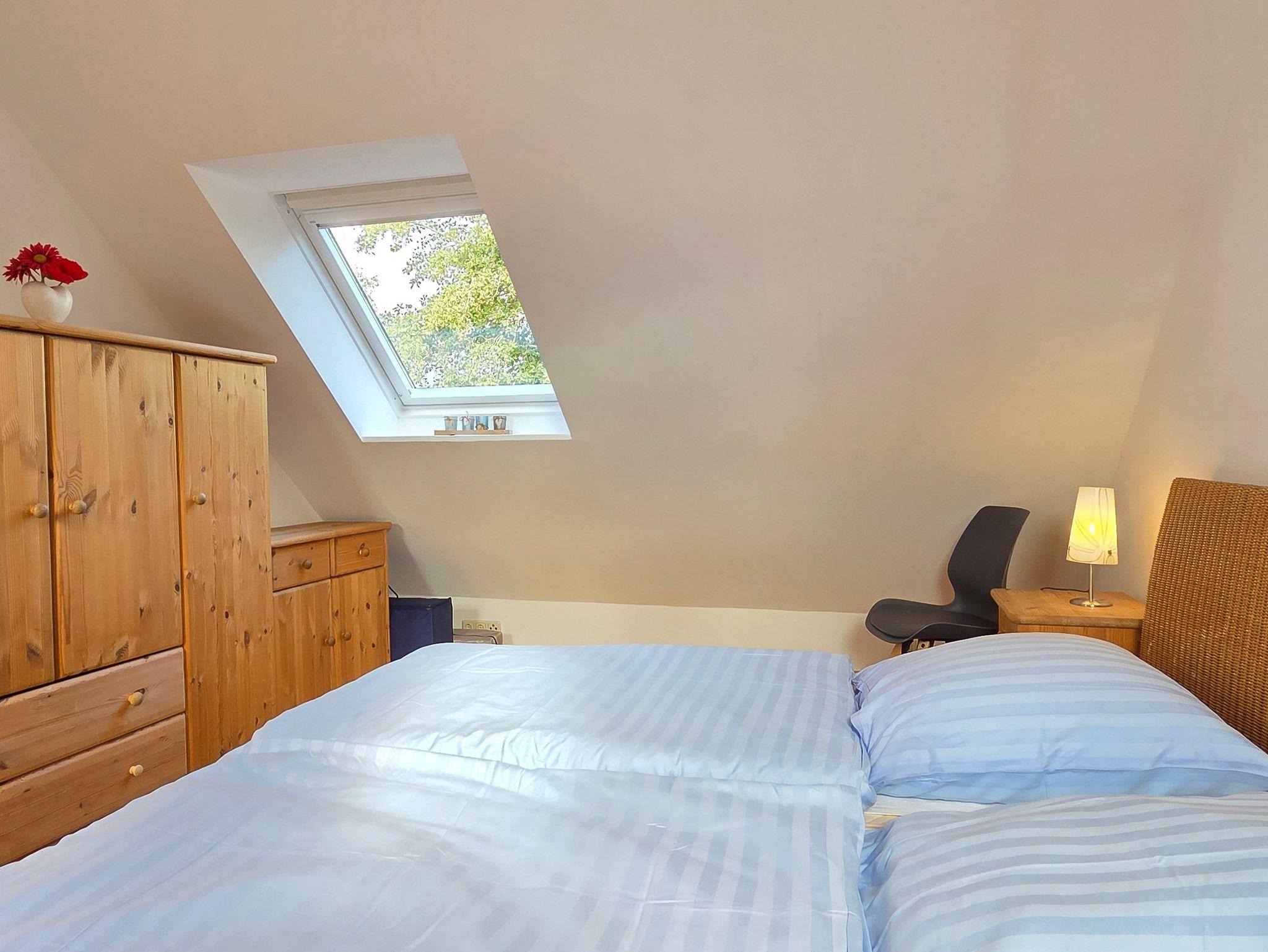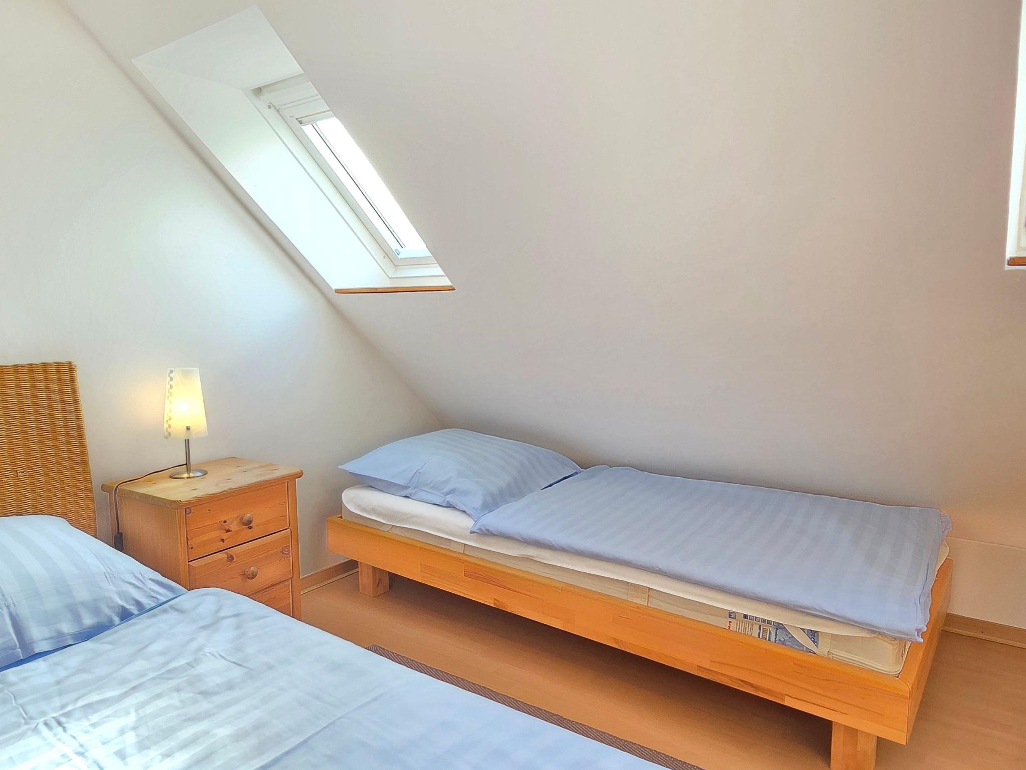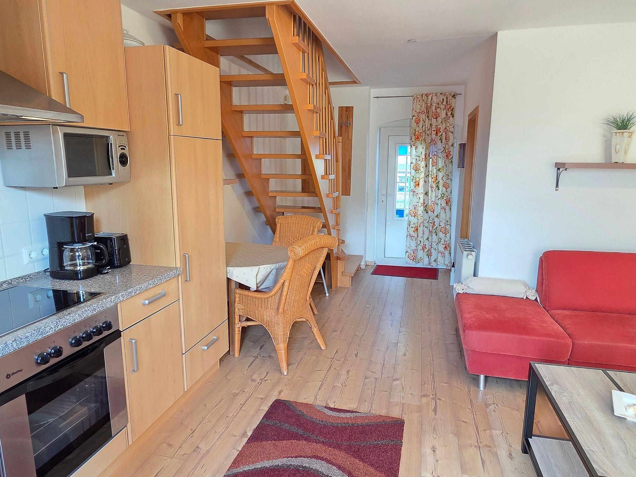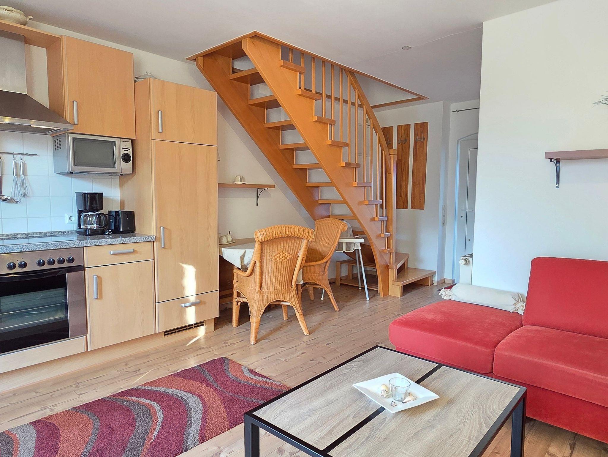 Die 42m² große Ferienwohnung befindet sich in einem Nebenteil des Hauses und verfügt über einen separaten Eingang. Die Wohnung ist der ideale Rückzugsort für Paare oder kleine Familien, die Erholung suchen und bietet einen offenen Wohn- und Essbereich mit eigener Terrasse ? perfekt für ein Frühstück an der frischen Luft oder entspannte Abende im Freien. Das separate Schlafzimmer im Obergeschoss ist mit einem Doppelbett sowie einem Einzelbett ausgestattet und sorgt für erholsame Nächte.