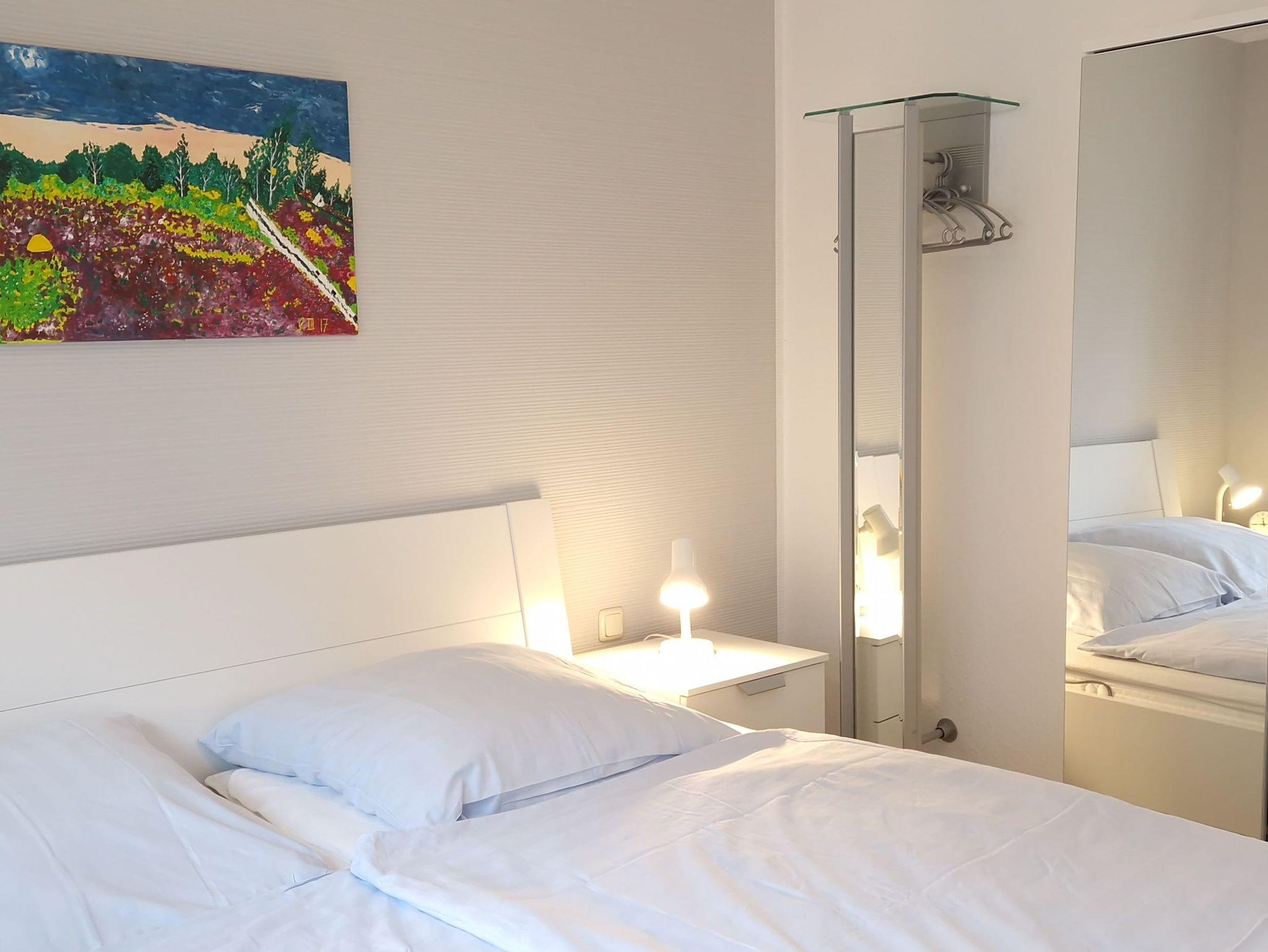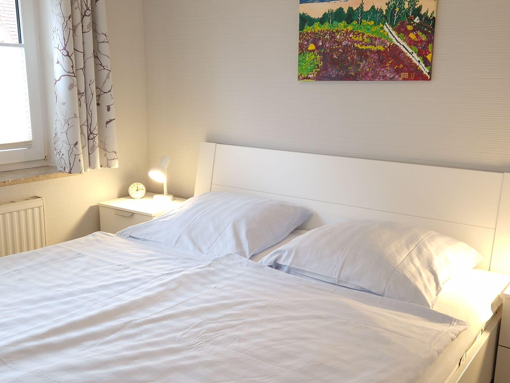 Die modernisierte Ferienwohnung bietet auf ca. 58m² Wohnfläche einen offenen Wohn- und Essbereich mit einer vollausgestatteten Küche. Darüber hinaus stehen Ihnen 2 Schlafzimmer (1 Schlafzimmer mit Doppelbett, 1 Schlafzimmer mit Etagenbett) sowie ein komfortables Badezimmer mit Dusche zur Verfügung. Die Fenster sind mit Rollläden, die Böden mit Vinyl bzw. Fliesen ausgestattet. WLAN steht Ihnen kostenfrei zur Verfügung.