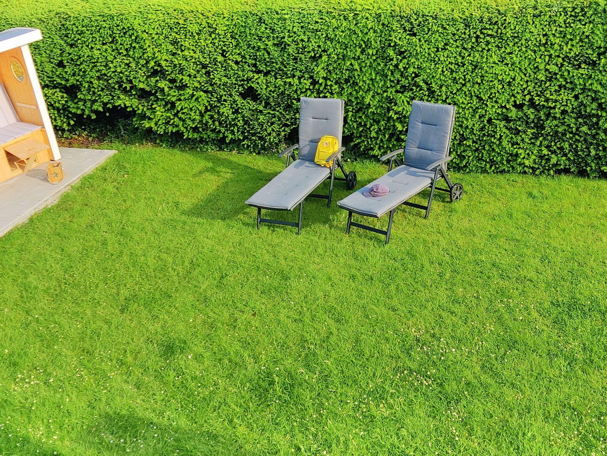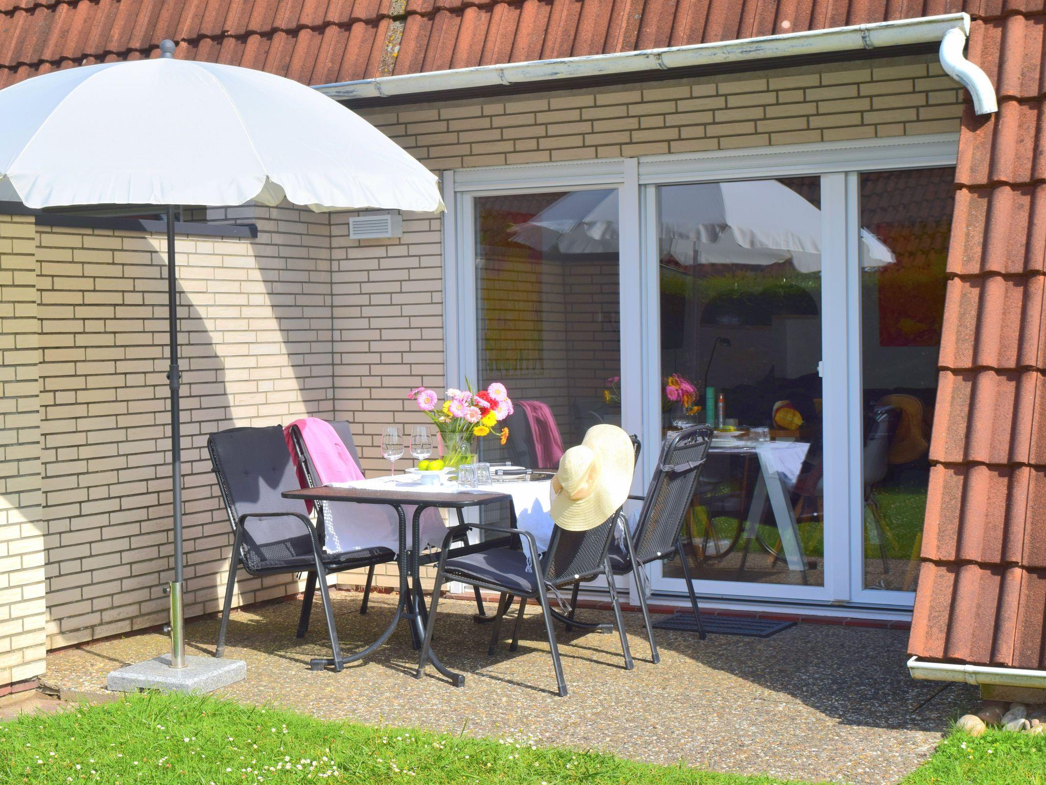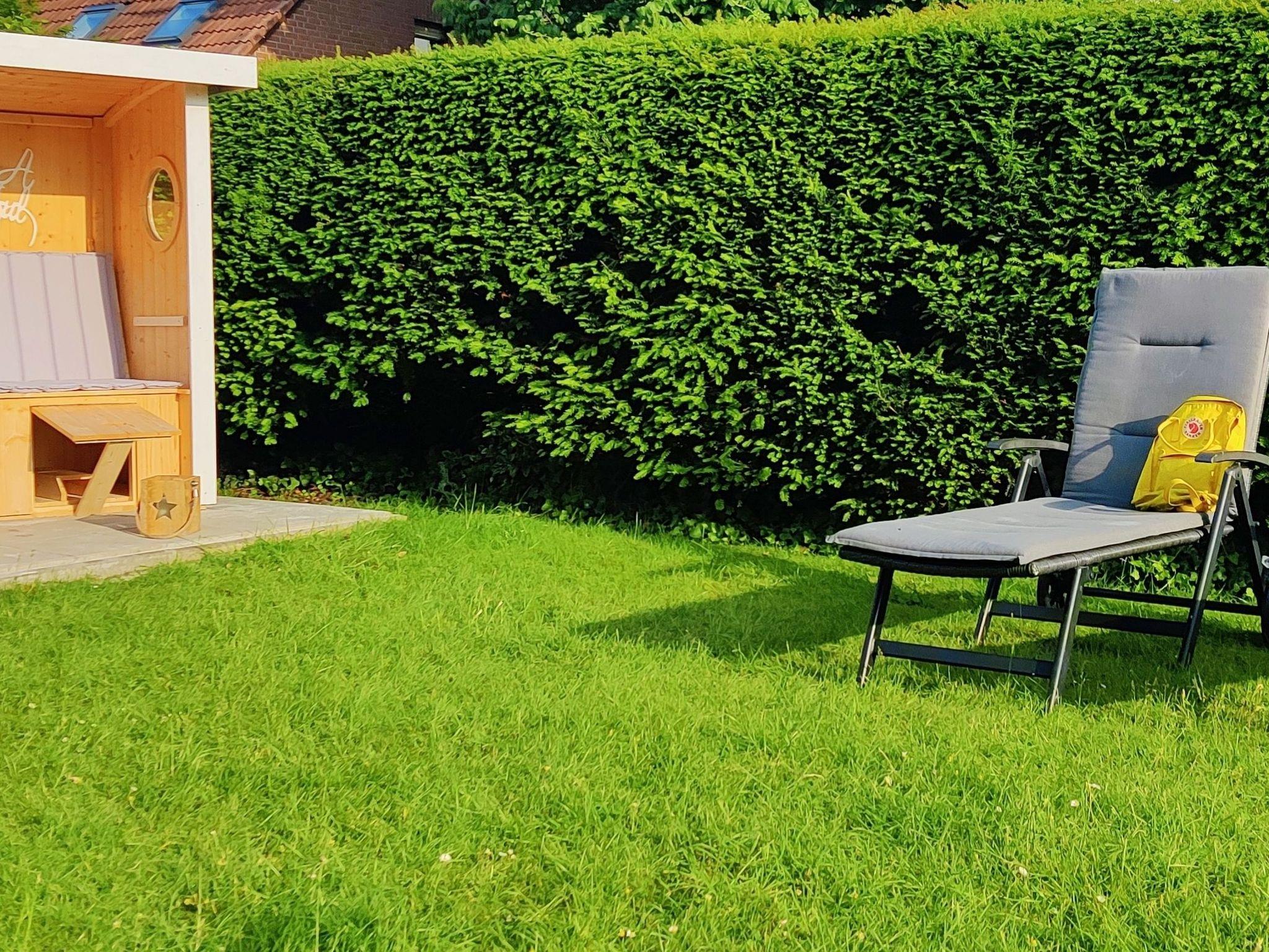 Der mit Gartenmöbeln, Sonnenliegen, Strandkorb und Grill ausgestattete Garten mit einer Terrasse in Süd-Westausrichtung lädt zum Verweilen ein.
