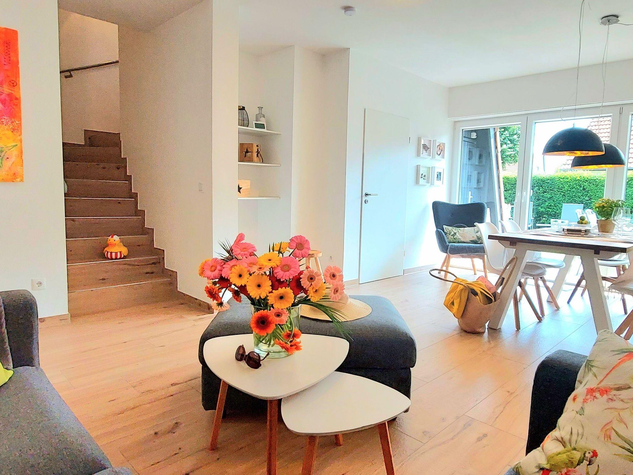 Im Erdgeschoss des Hauses empfängt sie ein heller Wohn-Essbereich mit anliegender Süd-Westterrasse und einem ca. 220 qm großen Garten, der bei schönem Wetter als zusätzlicher Raum genutzt werden kann. Eine räumlich abgetrennte, voll ausgestattete Küche mit Geschirrspülmaschine, Kühlschrank, Tiefkühlfach, Mikrowelle, Kaffeemaschine, Milchaufschäumer, Wasserkocher u.v.m. sowie einem Gäste-WC mit Dusche und Toilette.