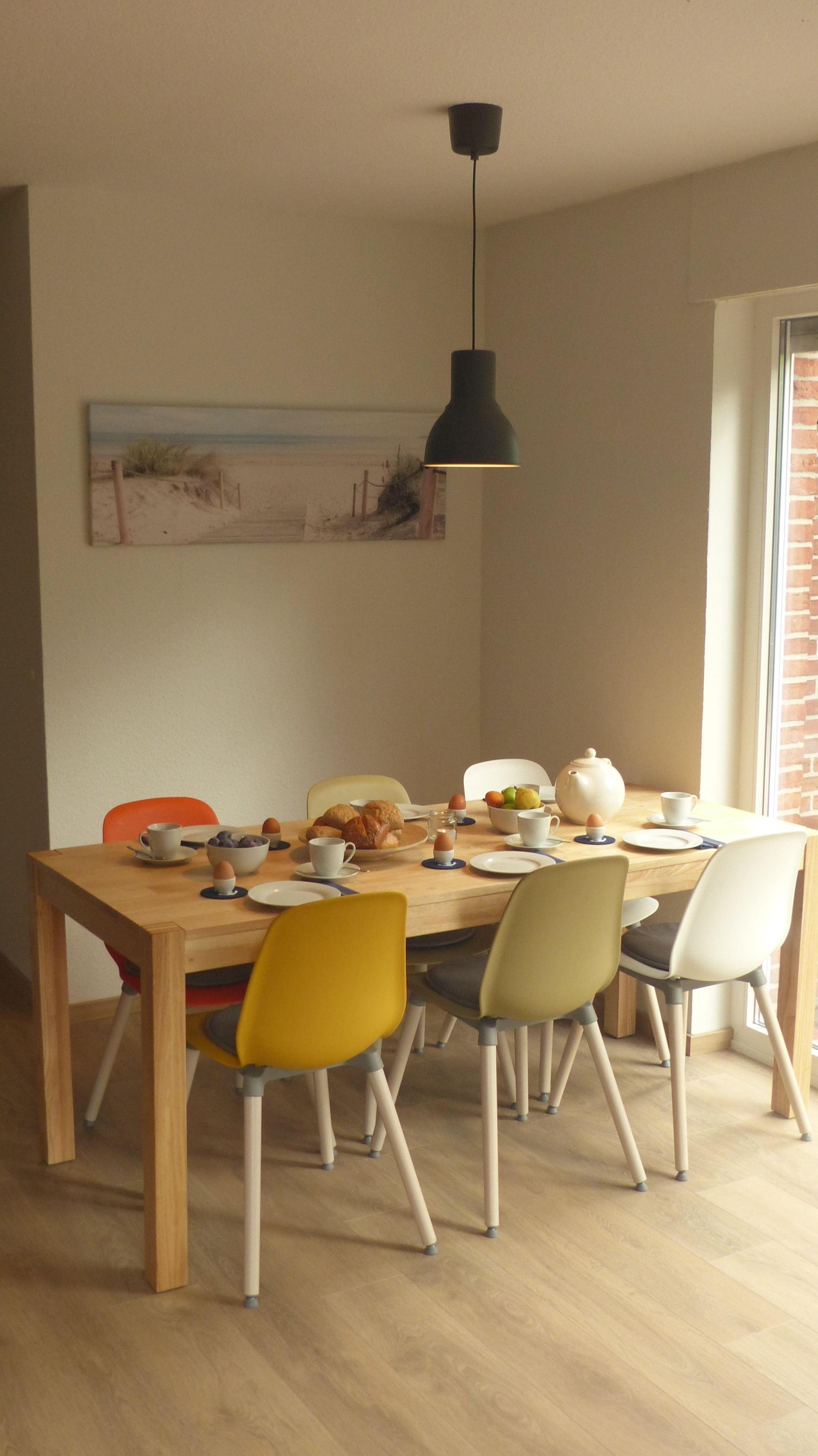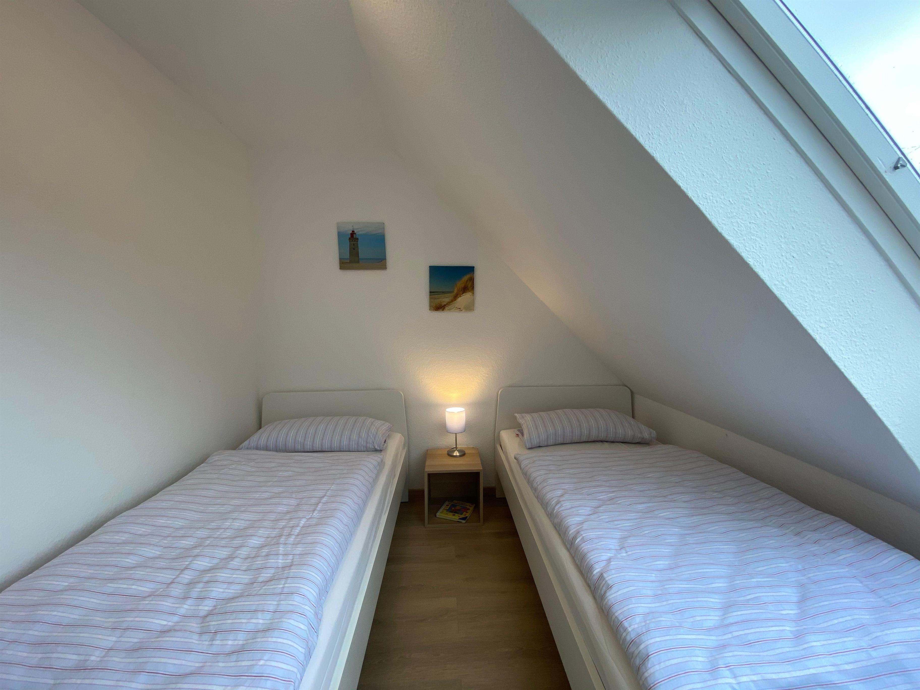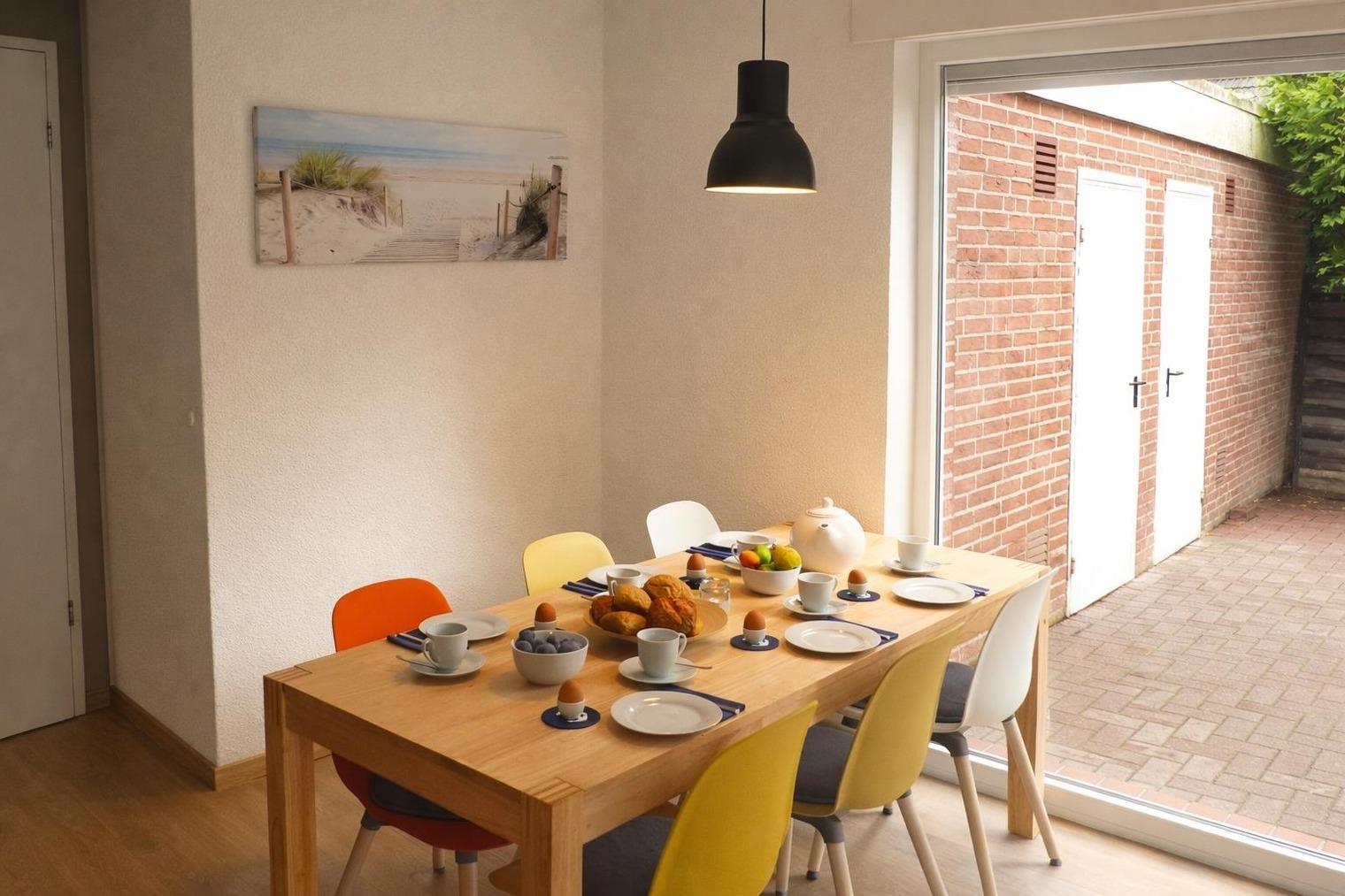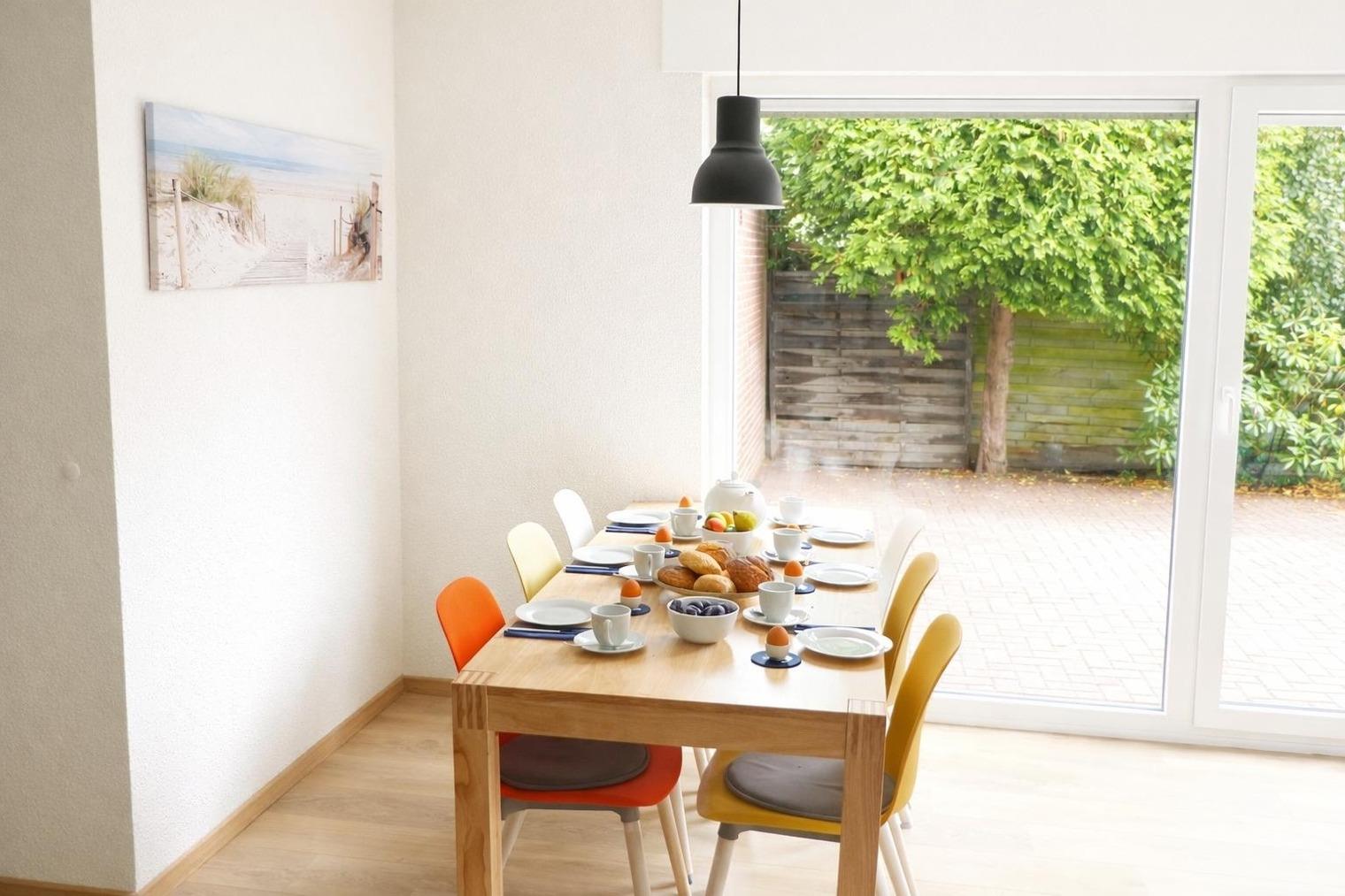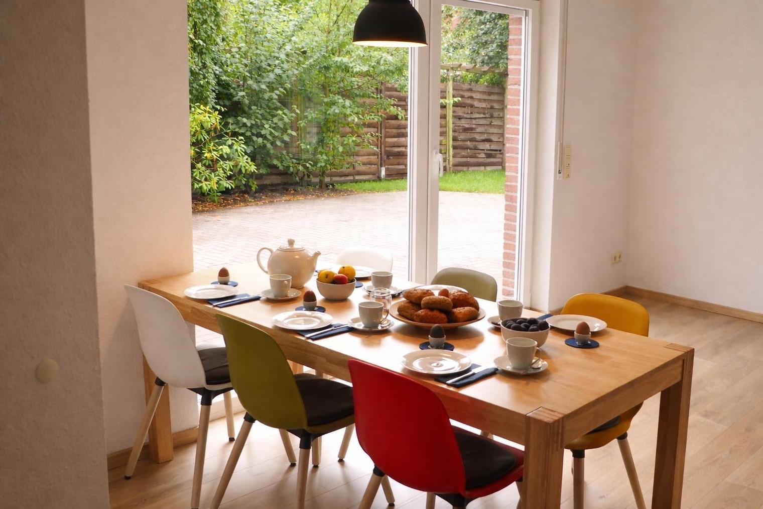 Im Erdgeschoss verfügt das Haus über ein großes, helles Wohnzimmer mit Sofalandschaft und 50 Zoll großem SAT-TV, Essbereich mit massivem Holzesstisch sowie einer separaten, sehr gut ausgestatteten Küche (mit Mikrowelle und Spülmaschine). Weiterhin befindet sich im EG ein neues Gäste-WC mit Handwaschbecken. Vom Wohnzimmer aus haben Sie Zugang zur sonnigen Terrasse sowie dem großen Garten. Im 1. OG finden Sie zwei Schlafzimmer (eins davon mit Doppelboxspringbett und das zweite mit zwei Einzelbetten) sowie ein helles und modernes Bad mit übergroßer Dusche. Im Dachgeschoss befindet sich ein Schlafstudio mit zwei weiteren Einzelbetten.