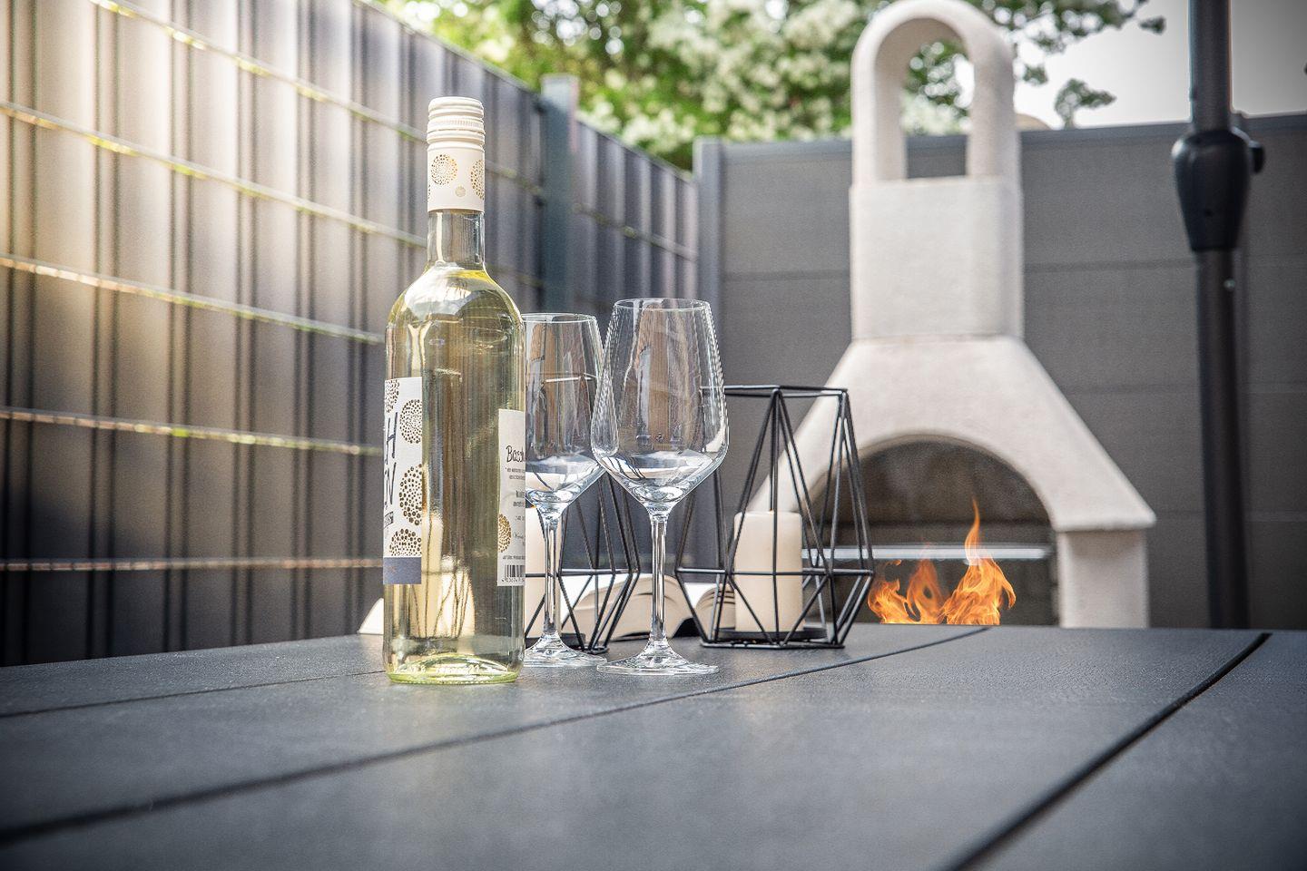 Der Außenbereich des Ferienhauses verfügt über eine möblierte Terrasse in Südausrichtung und lädt zur Erholung ein. Es