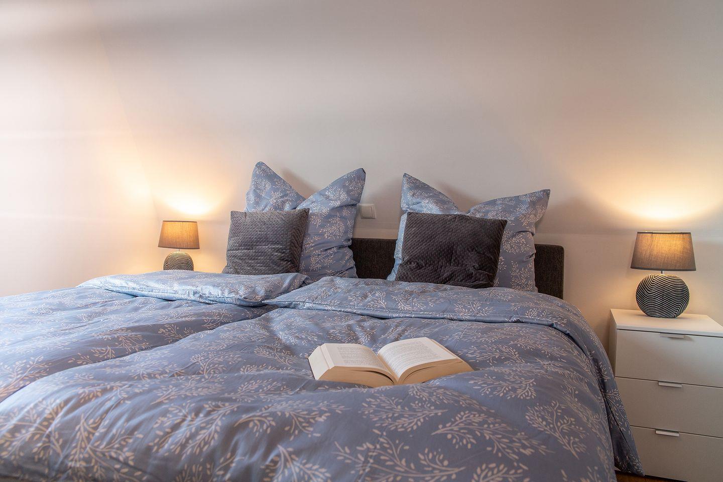 Schlafzimmer (1x Doppelbett, 1x2 Einzelbetten) inkl. TV und ein großzügiges Bad mit bodengleicher Dusche. Alle Fenster sind