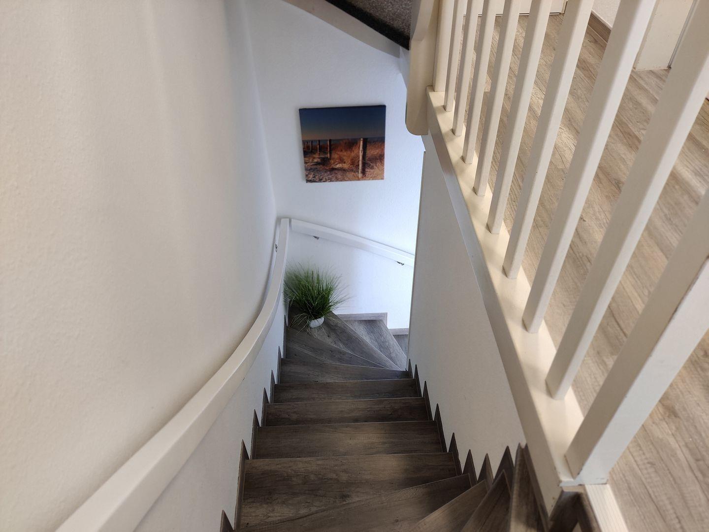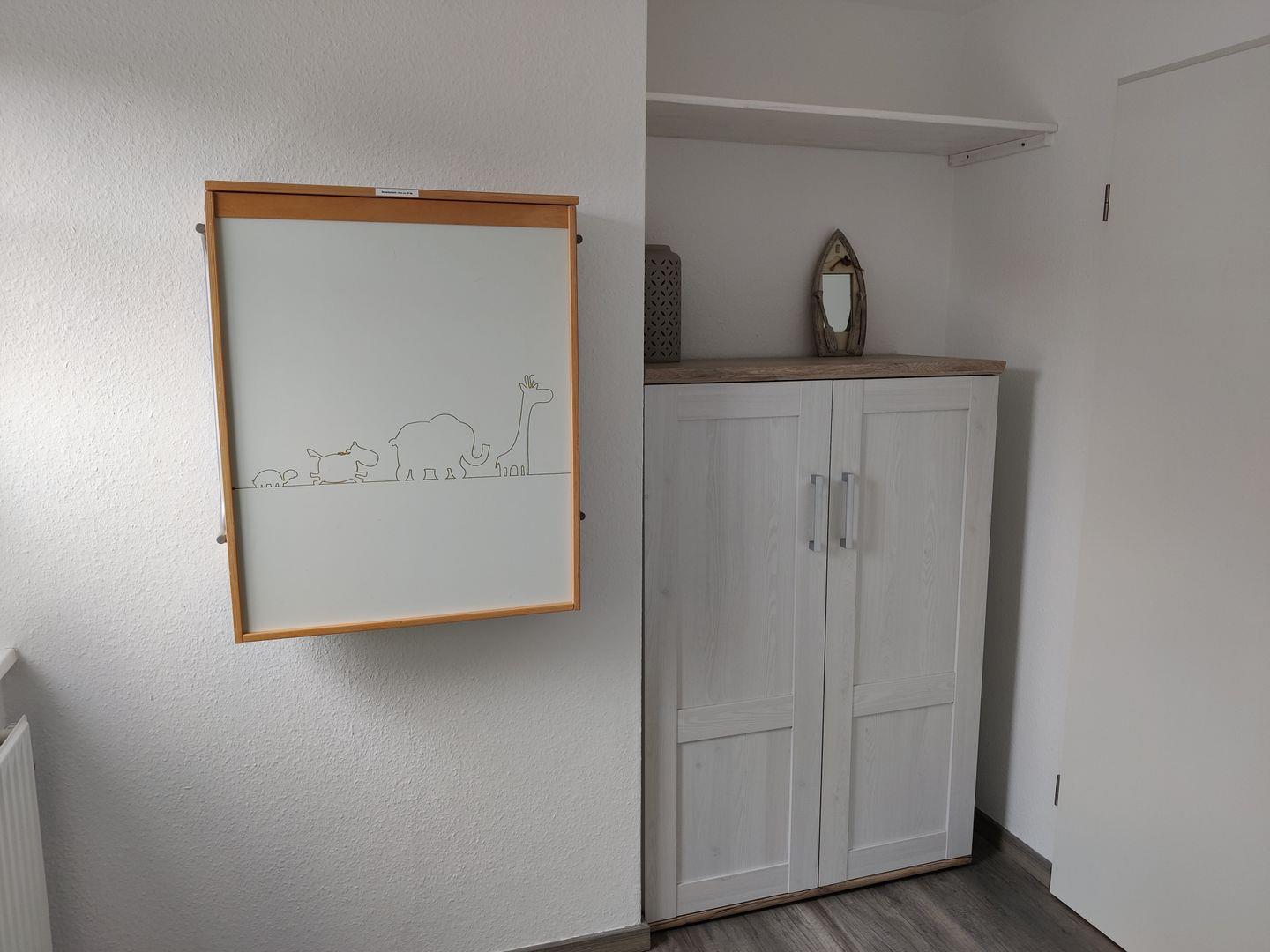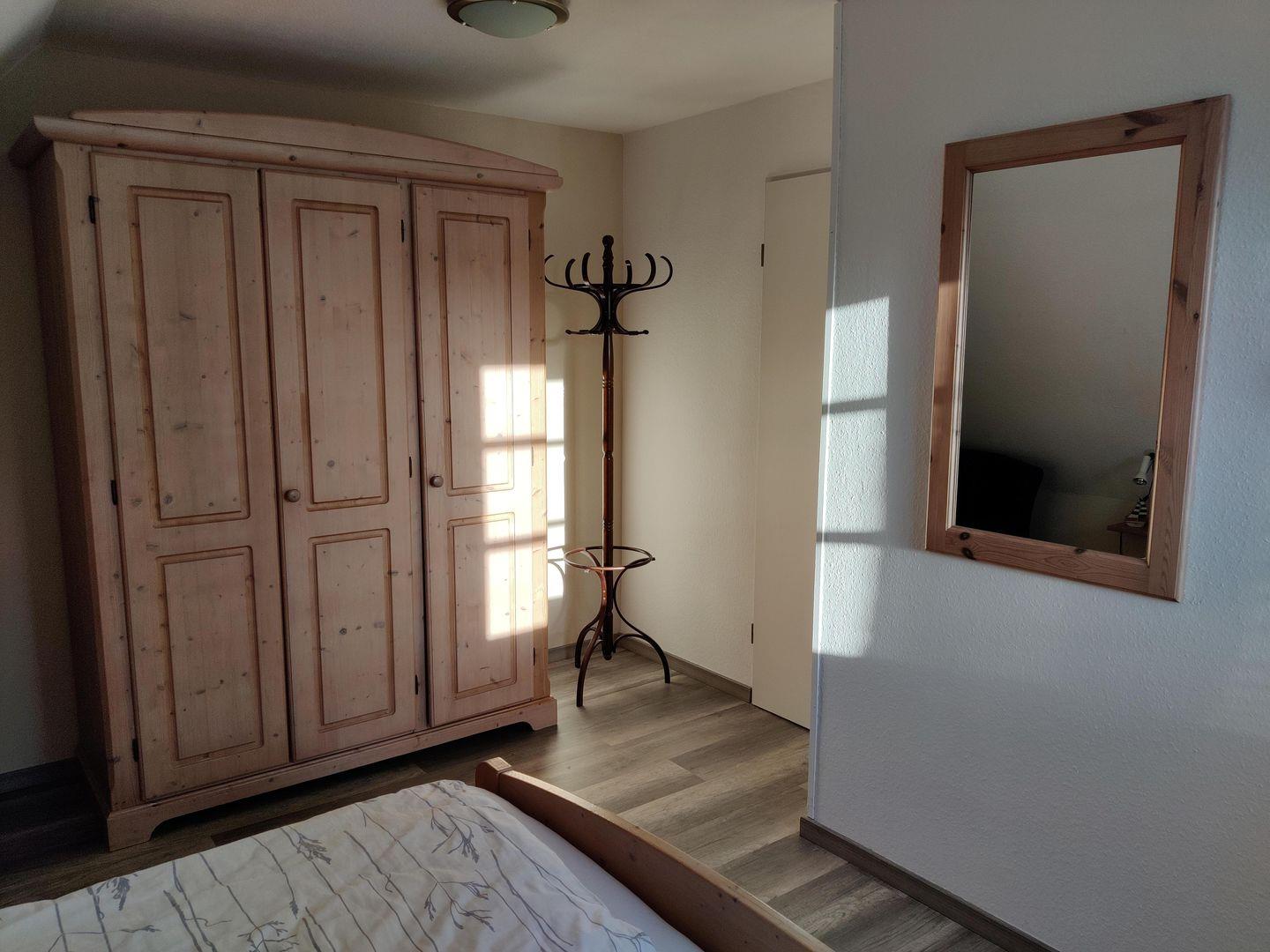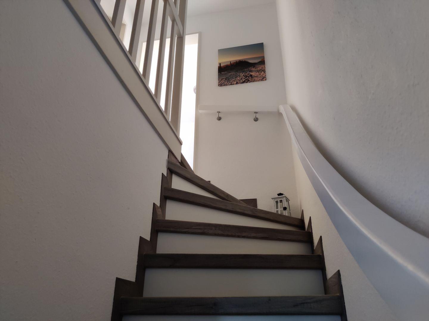 Im 1. Obergeschoss befinden sich zwei Schlafzimmer: eines mit einem komfortablen Doppelbett (180 × 200 cm) und Kleiderschrank, sowie ein weiteres Schlafzimmer mit zwei Einzelbetten (90 × 200 cm), Wickeltisch und Kommode – ideal für Familien mit kleinen Kindern. Das Badezimmer ist mit Dusche, WC und Waschmaschine ausgestattet.