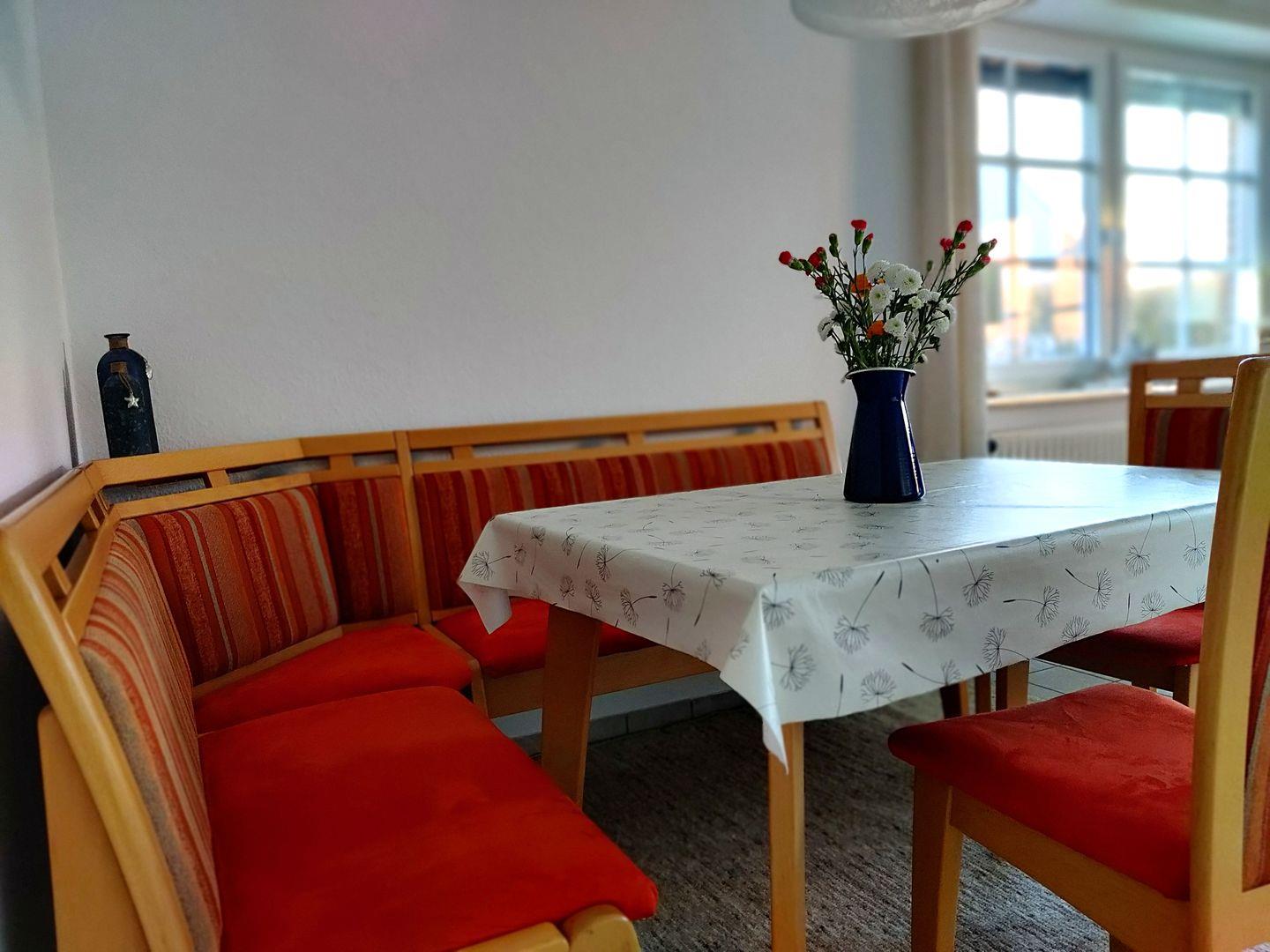 Im Erdgeschoss erwartet Sie eine voll ausgestattete Küche mit Elektroherd, Backofen, Geschirrspüler, Mikrowelle, Kaffeemaschine (Filterkaffee), Wasserkocher sowie einem Kühlschrank mit Gefrierfach. Selbstverständlich stehen ausreichend Geschirr, Besteck und Kochutensilien zur Verfügung. Der gemütliche Wohnbereich lädt mit einer komfortablen Couch, Sessel, Flachbild-TV und Radio zum Entspannen ein. Am ausziehbaren Esstisch mit Stühlen und Eckbank können Sie gemeinsame Mahlzeiten genießen. Kostenfreies WLAN ist im gesamten Haus verfügbar. Ergänzt wird das Erdgeschoss durch ein Gäste-WC sowie einen praktischen Abstellraum mit Staubsauger, Wäscheständer, Bügelbrett und Bügeleisen.