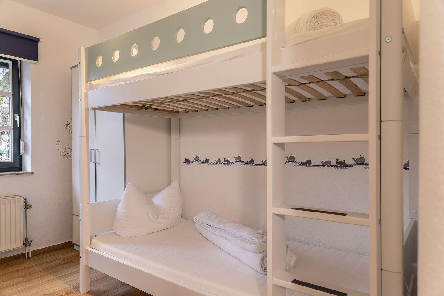 Komplett eingerichtete separate Küche mit Essplatz und Kinderhochstuhl, 1 Schlafzimmer mit Doppelbett, 1 Schlafzimmer mit Etagenbett (obere Etage nur für ein Kind geeignet), zustellbares Kinderreisebett.