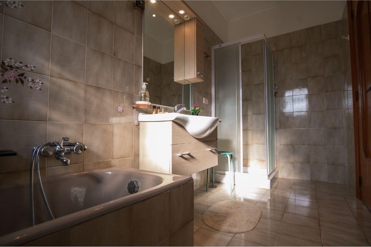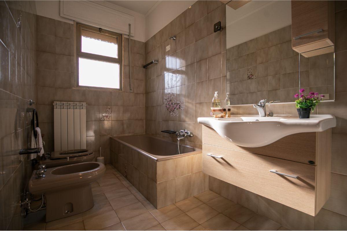 Die Villa del Mirto verfügt über zwei Badezimmer mit Fenstern: ein vollständiges Badezimmer mit Badewanne und Duschkabine sowie Toilettenartikeln, ein Willkommenspaket mit Shampoo und Duschgel, und ein kleineres Badezimmer nur mit Toilette und Waschbecken, wie auf den Fotos zu sehen ist. Außerdem gibt es einen Haartrockner und einen beleuchteten Spiegel.