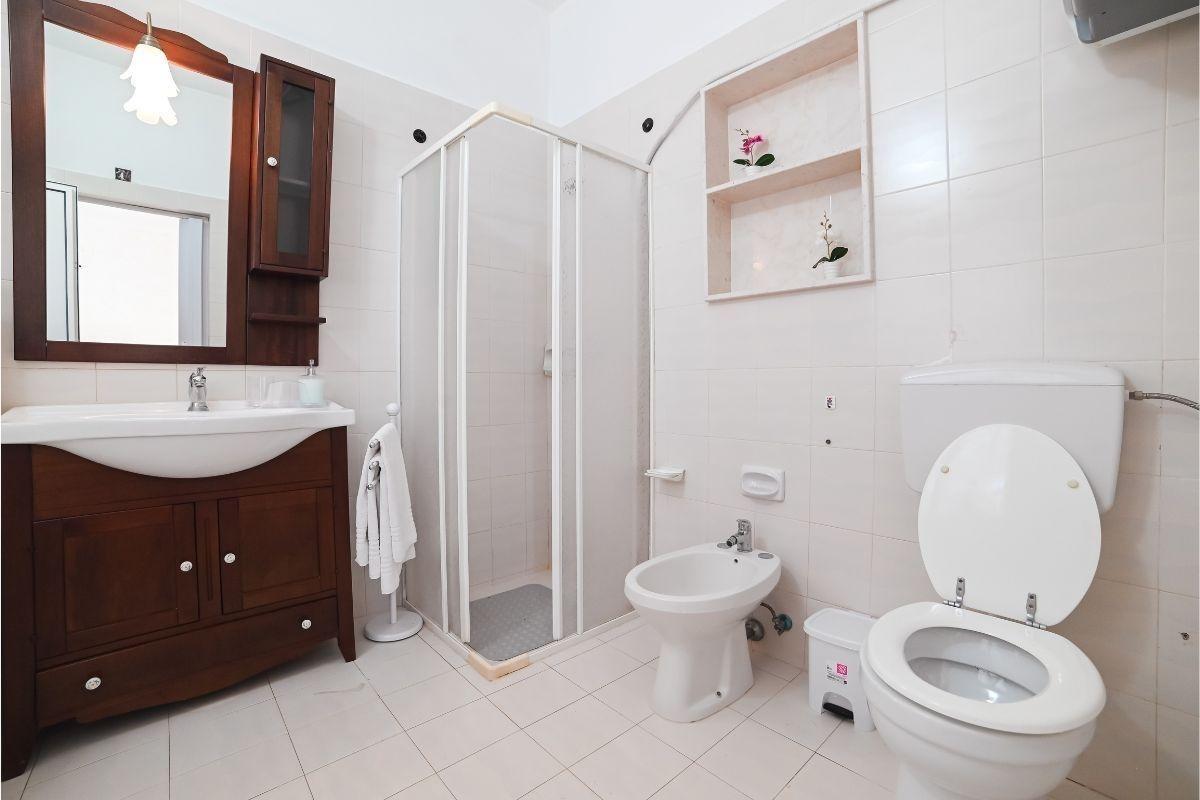 2) In der zweiten Unterkunft finden wir ein großes Doppelzimmer mit Queensize-Bett, Badezimmer mit Fenster und Dusche, WC, Willkommensset mit Shampoo und Duschbad.