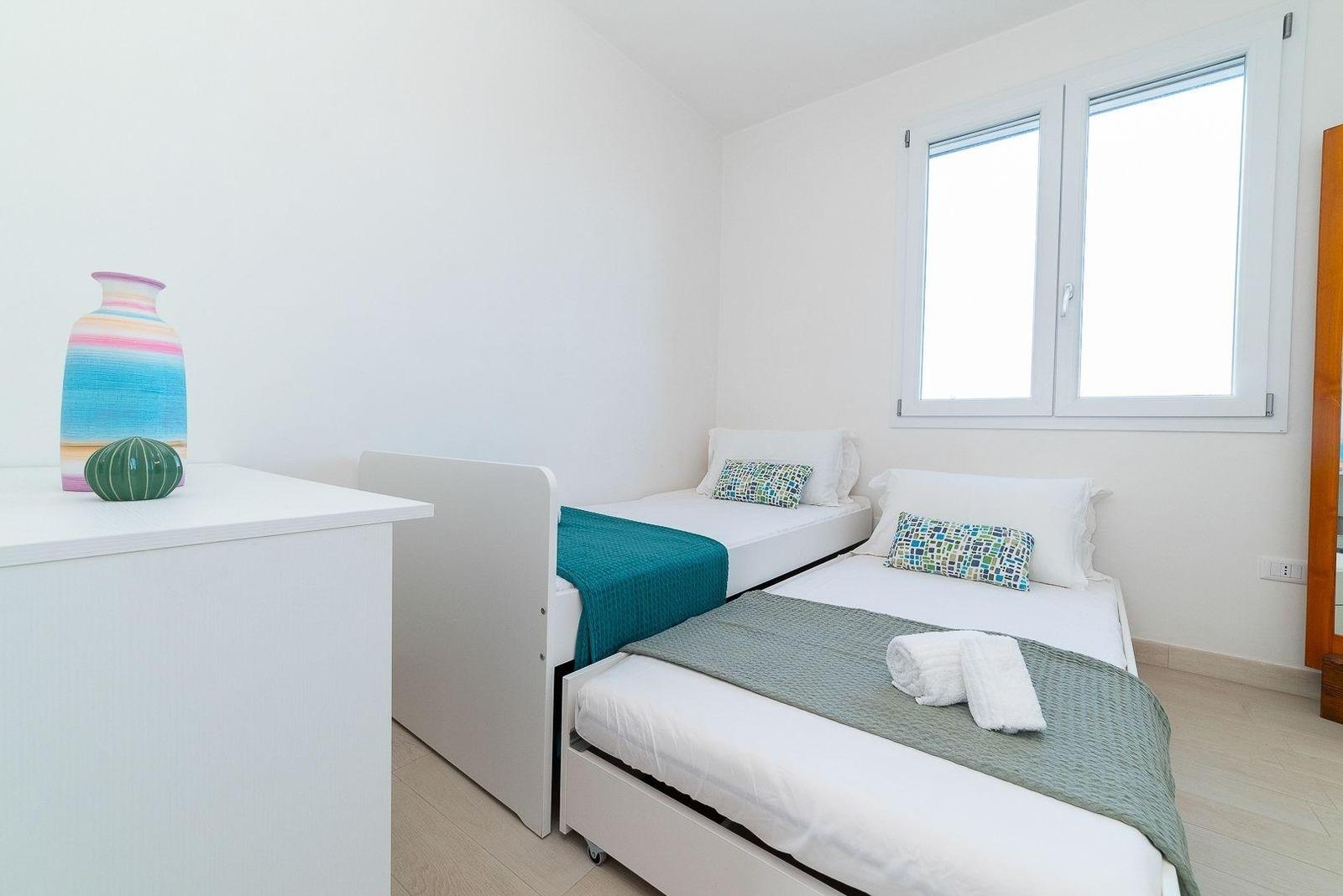 - Im ersten Stock finden wir 1 Doppelzimmer mit Kingsize-Bett und Kleiderschrank und 1 Schlafzimmer mit zwei Einzelbetten, immer mit angeschlossenem Kleiderschrank. Außerdem gibt es verschiedene maßgeschneiderte Fächer, in denen Sie all Ihre persönlichen Gegenstände unterbringen können.