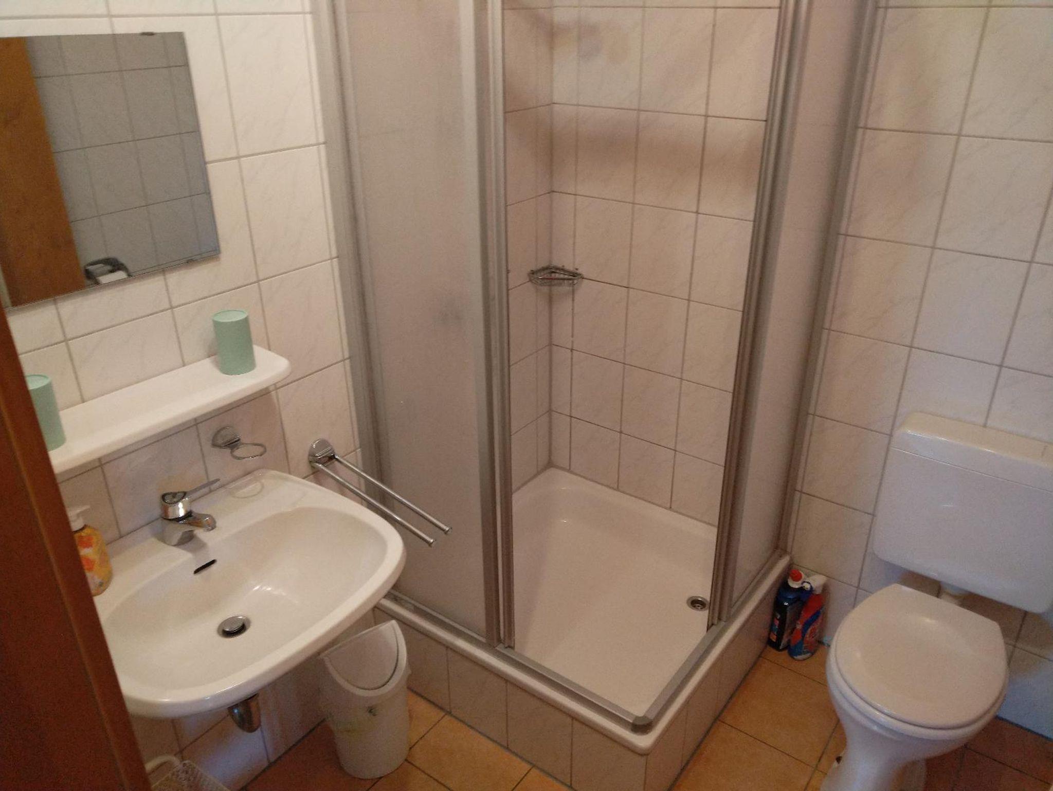 Badezimmer mit Dusche, WC und Föhn. Bettwäsche, Handtücher,