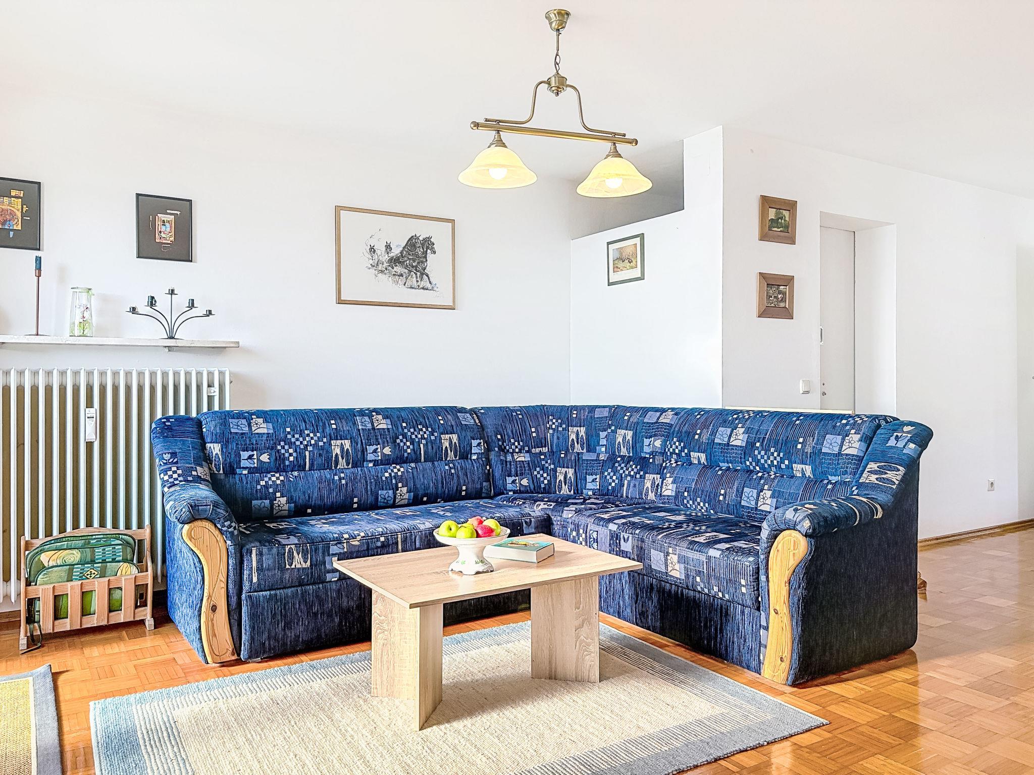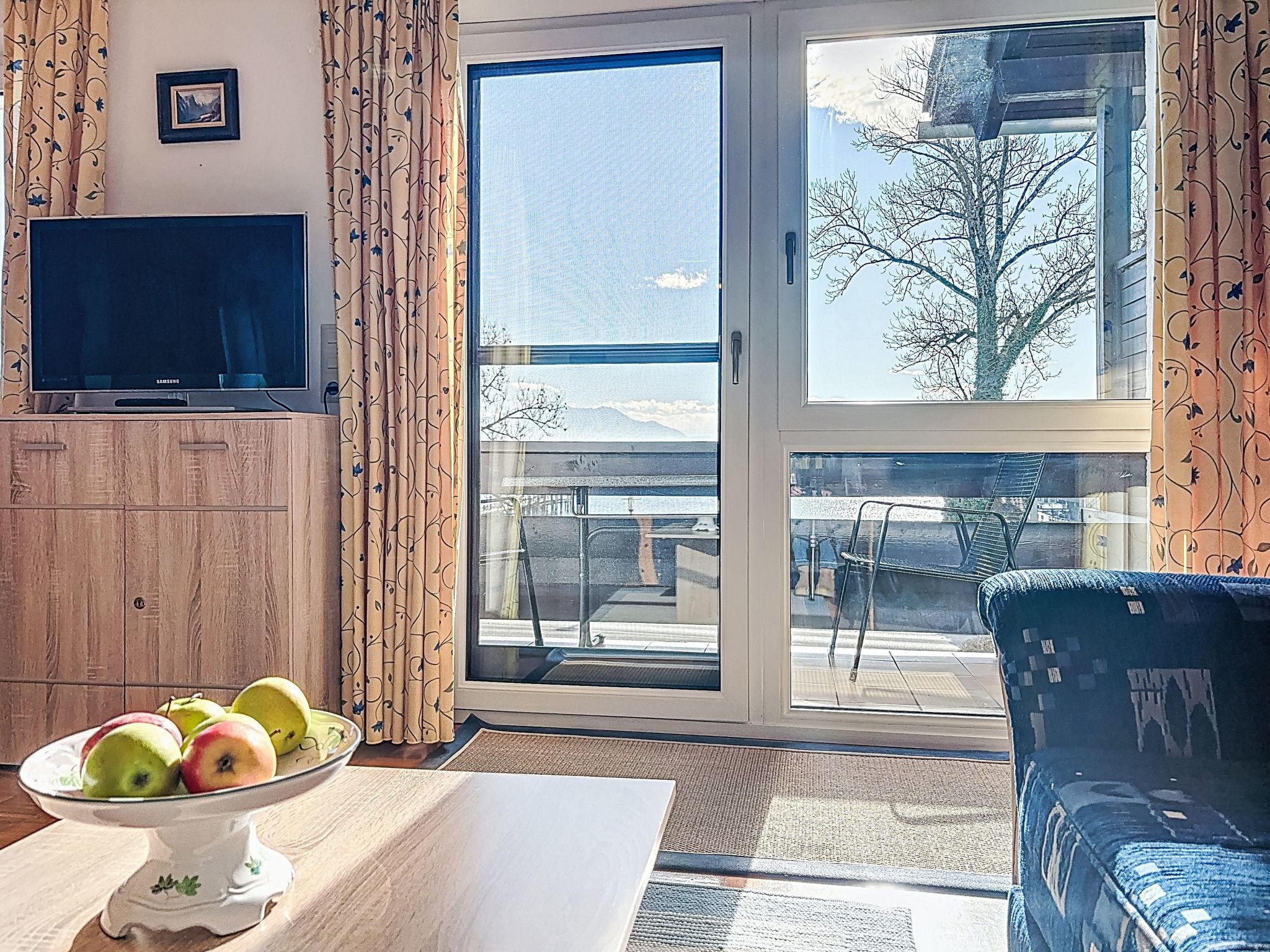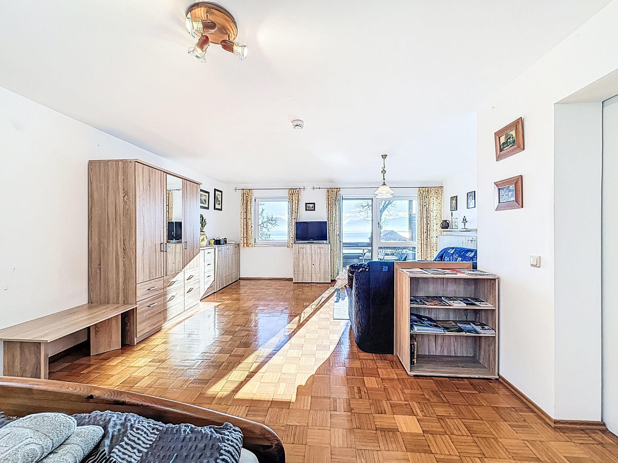 "Seeglück", 1-room apartment 56 m2 on 2nd floor, south facing position. Spacious and bright, rustic and cosy furnishings: large living/sleeping room with 1 double bed (180 cm, length 200 cm), satellite TV (flat screen). Exit to the balcony, south facing position. Small kitchen 6 m2 (oven, 4 ceramic glass hob hotplates, kettle, electric coffee machine) with dining table. Exit to the balcony, east facing position. Shower/WC. Heating. 2 balconies. Balcony furniture. Beautiful view of the lake. Parking (1 car) at the house. Please note: non-smokers only. Smoke alarm.