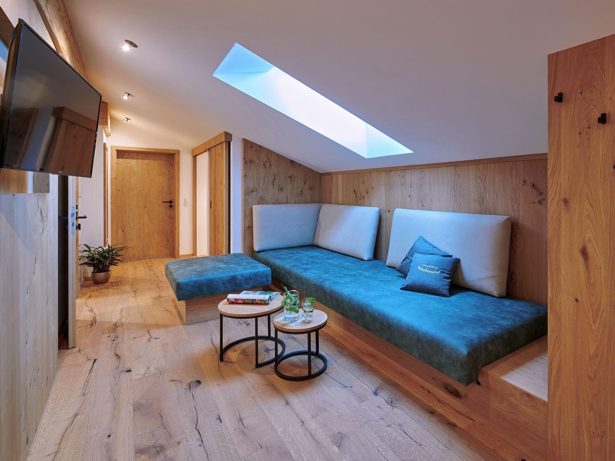 Mit vielerlei Annehmlichkeiten verwöhnt dich die großzügige 5-Sterne-Ferienwohnung Krautinsel, die sich über zwei Etagen erstreckt: Den Eltern steht ein separates Stockwerk als idealer Rückzugsort zur Verfügung. Die luxuriöse Wohnung verfügt über zwei separate Badezimmer jeweils mit bodengleicher Regendusche, so dass sich Eltern und Kinder morgens nicht in die Quere kommen. Darüber hinaus bietet das helle Eltern-Badezimmer eine komfortable freistehende Badewanne. Und vom Balkon aus genießt du einen traumhaften Blick ins Grüne und kannst perfekt die Seele baumeln lassen.