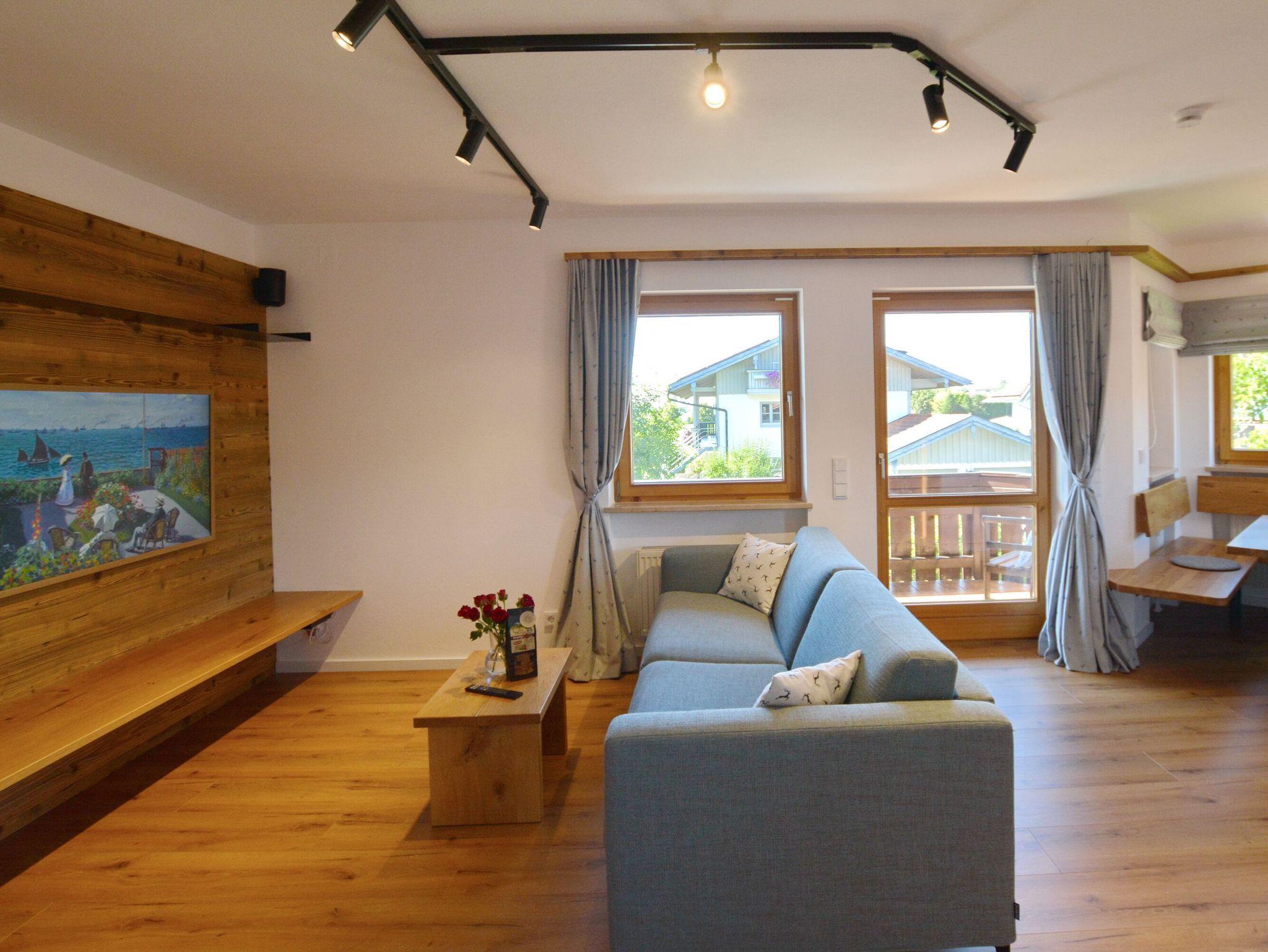 Genießen Sie entspannte Tage in einer stilvollen, hochwertig ausgestatteten Ferienwohnung mit dezentem Seeblick. Die Wohnung vereint traditionelle Gemütlichkeit mit moderner Technik und liegt nur wenige Gehminuten vom Chiemsee entfernt.
