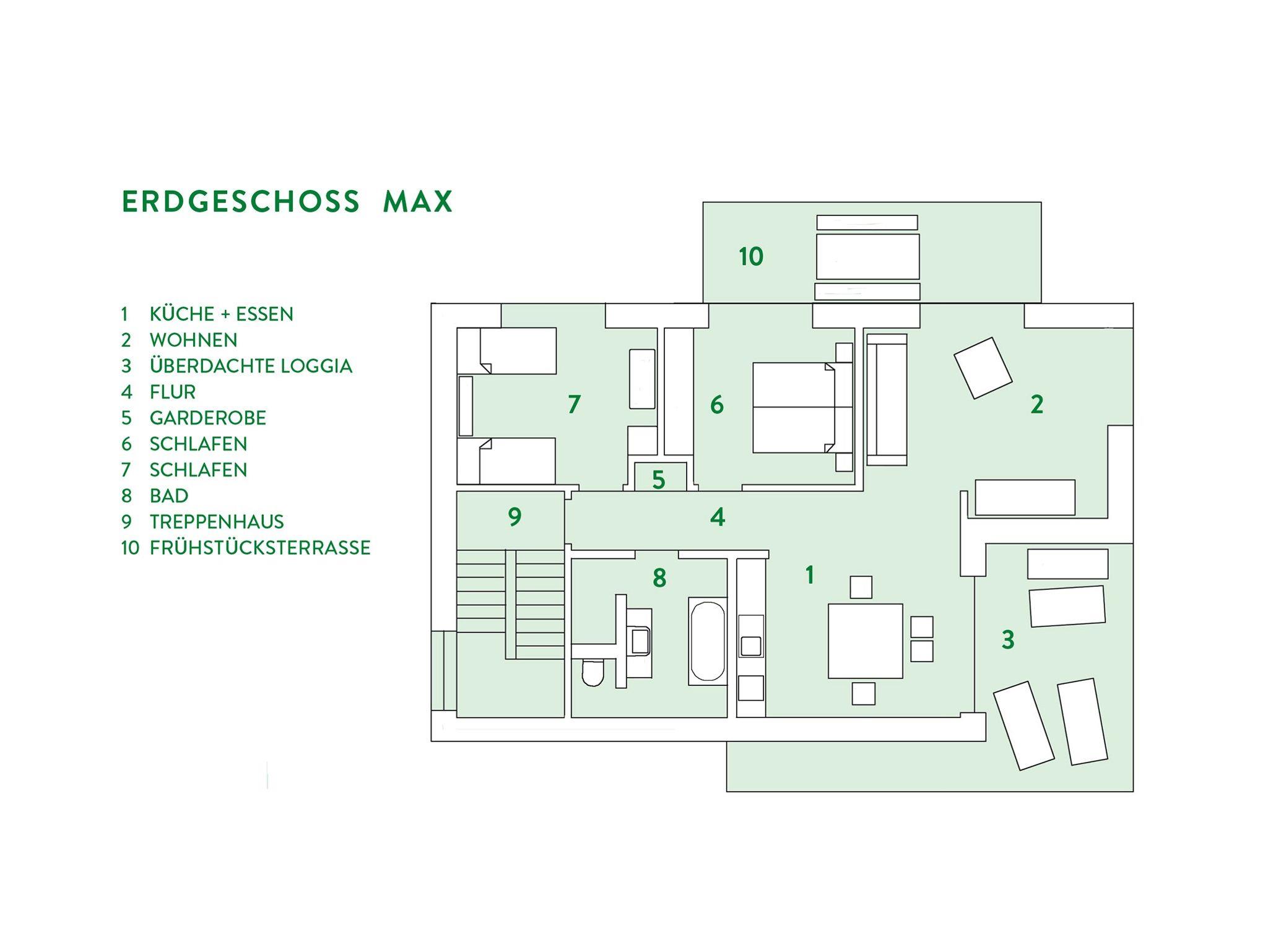Die Ferienwohnung MAX im Erdgeschoss ist ideal für bis zu 4 Personen. Sie verfügt über eine lichtdurchflutete Küche mit einem großzügigen Essbereich, der ins offene Wohnzimmer übergeht. Von hier hat man Zugang zur Frühstücksterrasse und zum Garten, mit Trampolin und großer Wiese zum Austoben (ideal für Kinder). Von der Küche aus gelangt man auf die überdachte Süd-Loggia, mit Essplatz und Outdoor-Loungesesseln. Hier können Sie bei jedem Wetter draußen sitzen. Der Wohnbereich verfügt über zwei gemütliche Sofas, Flat-TV, Bose-Sound-System und ein Panoramafenster mit Bergblick. Das Elternschlafzimmer mit Boxspringbett (180 x 200cm) und Einbauschrank ermöglicht ebenfalls den Zugang zur Ost-Terasse. Im Kinderzimmer gibt es ein Wandgemälde, das die heimischen Vögel und die Tiere des Waldes zeigt und zwei Einzelbetten (90 x 200cm). Das exklusive Bad ist mit Regendusche, Badewanne und hochwertigen Accessoires ausgestattet. Kosenloser W-LAN Zugang und Zimmersafe gehören ebenfalls zur Ausstattung.