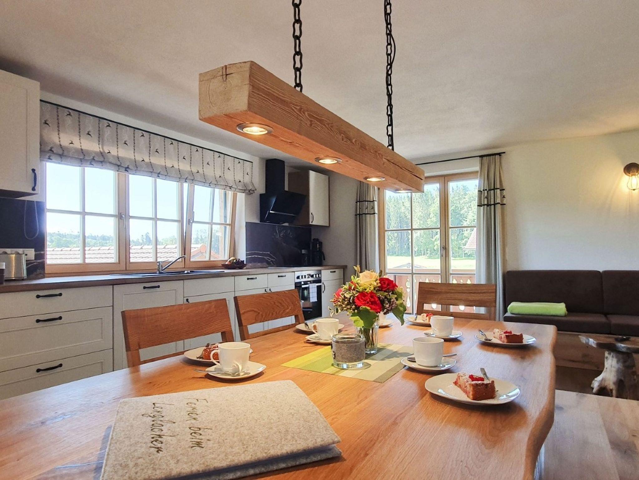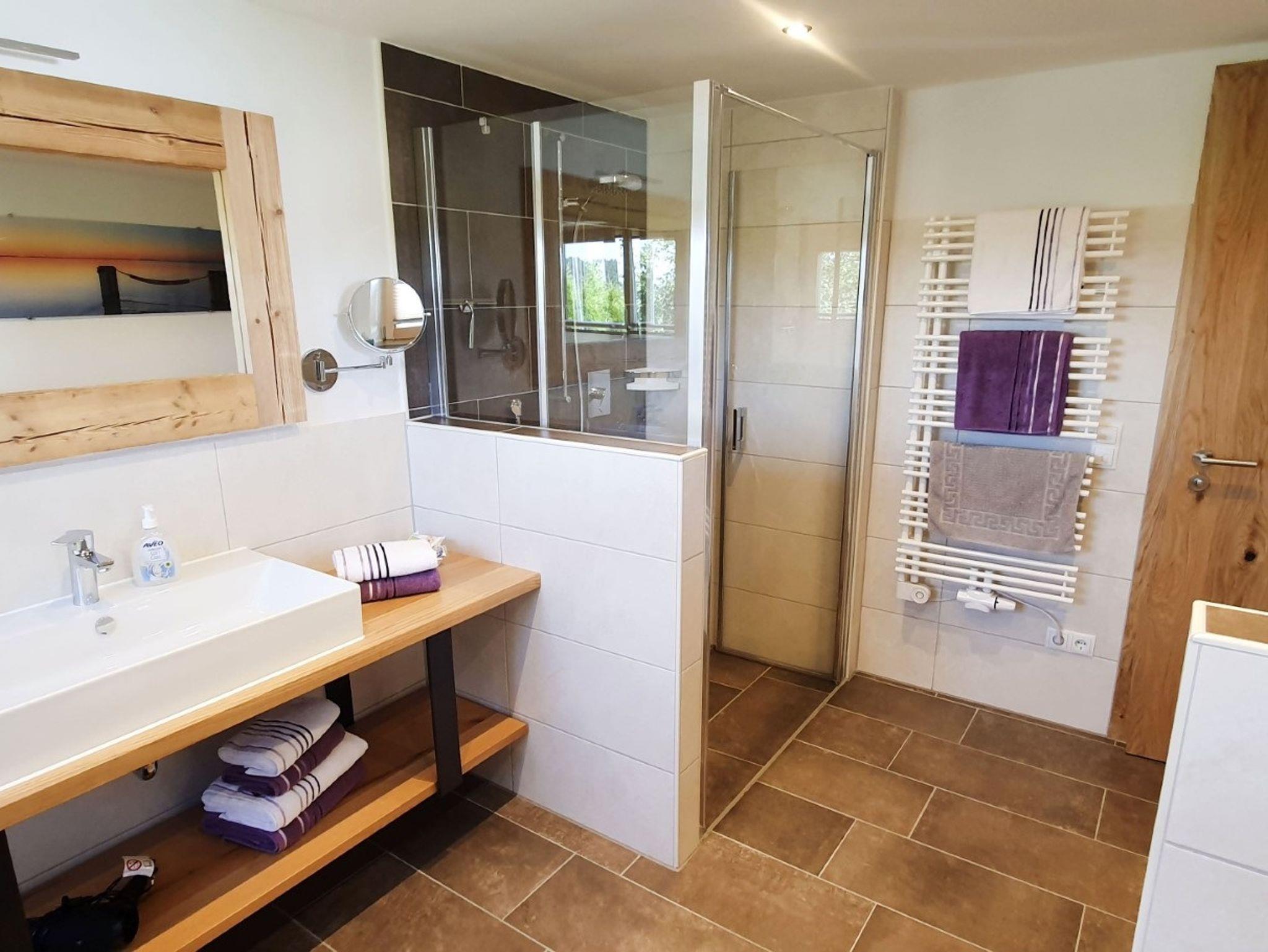 Im 1. Stock unseres neu renovierten Bauernhauses befindet sich unsere liebevoll eingerichtete, 80qm große Ferienwohnung mit großer Wohnküche, Essgarnitur, Couch mit Fernseher und Radio, großer Küchenzeile mit Kühlschrank, Tiefkühlfach, Kaffeemaschine Eierkocher, Toaster, Wasserkocher, Herd mit Bachofen und Spülmaschine. Das Elternschlafzimmer ist mit einem Doppelbett, extra Fernseher und hochwertigen Bettdecken und Kissen ausgestattet, welche Großteiles aus eigener Alpaka-Wolle hergestellt wurden und ideal geeignet sind für Allergiker. Im Kinderzimmer befindet sich ein Etagenbett und ein Einzelbett für insgesamt 3 Personen. Im Bad befindet sich natürlich neben Dusche und WC auch ein Schminkspiegel und Fön. Das Babybett und den Hochstuhl können Sie gerne nutzen. Der eigene Balkon der Ferienwohnung ist nach Süden und Osten ausgerichtet und bietet mit den Balkonmöbeln Platz zum Entspannen.