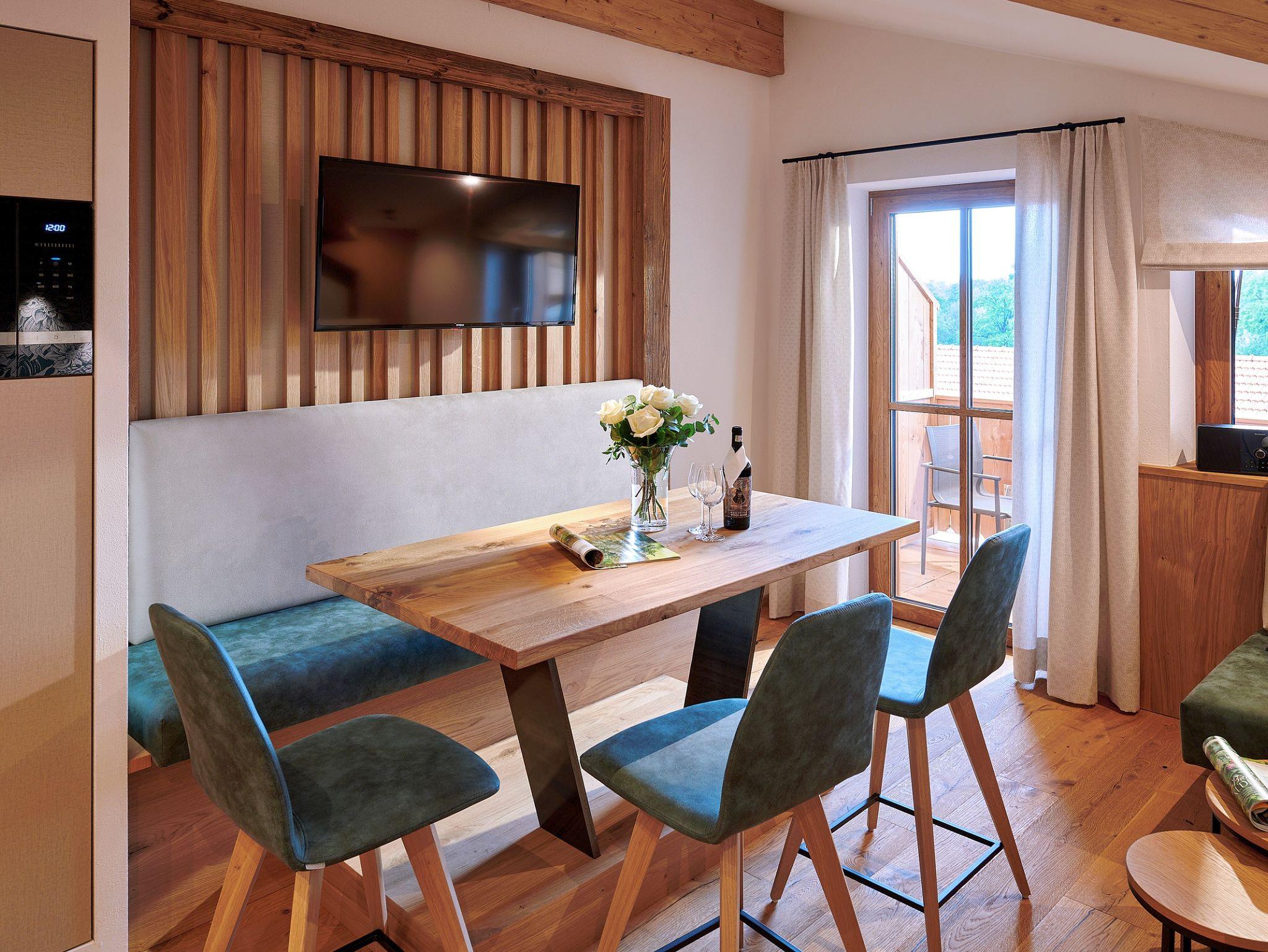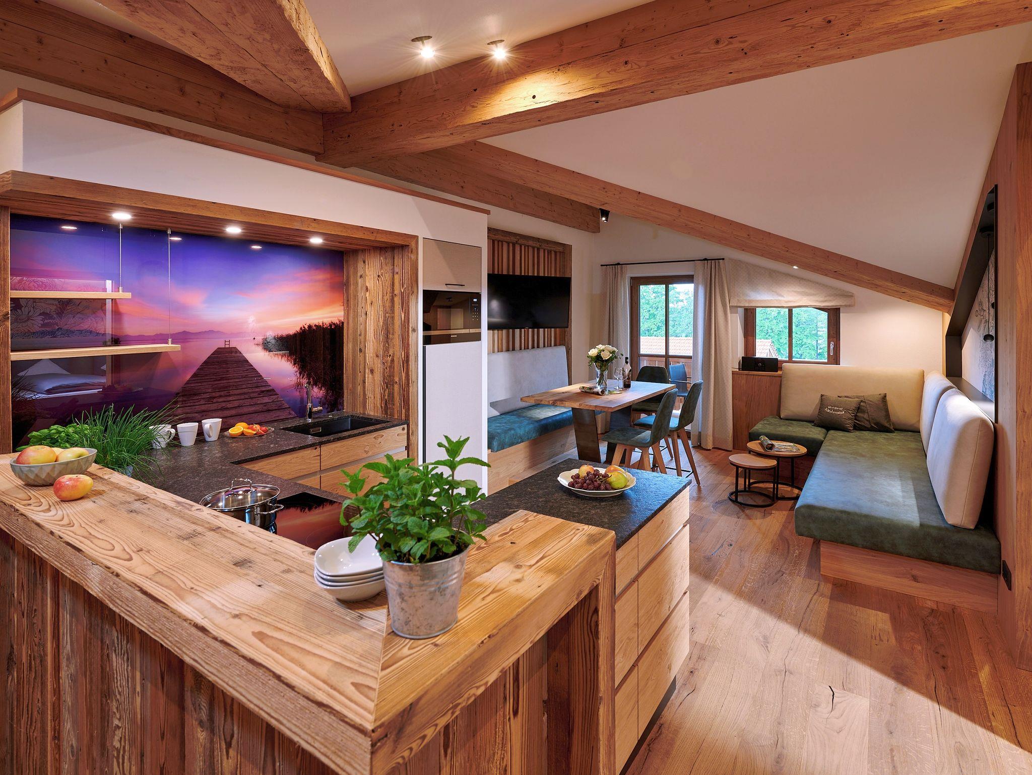 Die neue, offen gestaltete 5-Sterne-Luxus-Ferienwohnung Badesteg im Dachgeschoss umfängt dich mit ihrem einladenden Ambiente. In deinem liebevoll und durchdacht gestalteten Urlaubsdomizil verbringst du unvergessliche Urlaubstage und kannst neue Energie tanken. Die dezenten Lichtelemente, die rustikale Echtholzausstattung und perfekt aufeinander abgestimmte Farben sorgen für echtes Wohlfühlerlebnis. Hierzu trägt auch das moderne Badezimmer mit begehbarer Regendusche bei. Auf dem großen West-Balkon genießt du das atemberaubende Panorama der Chiemgauer Bergwelt und kannst Pläne für den nächsten Urlaubstag schmieden.