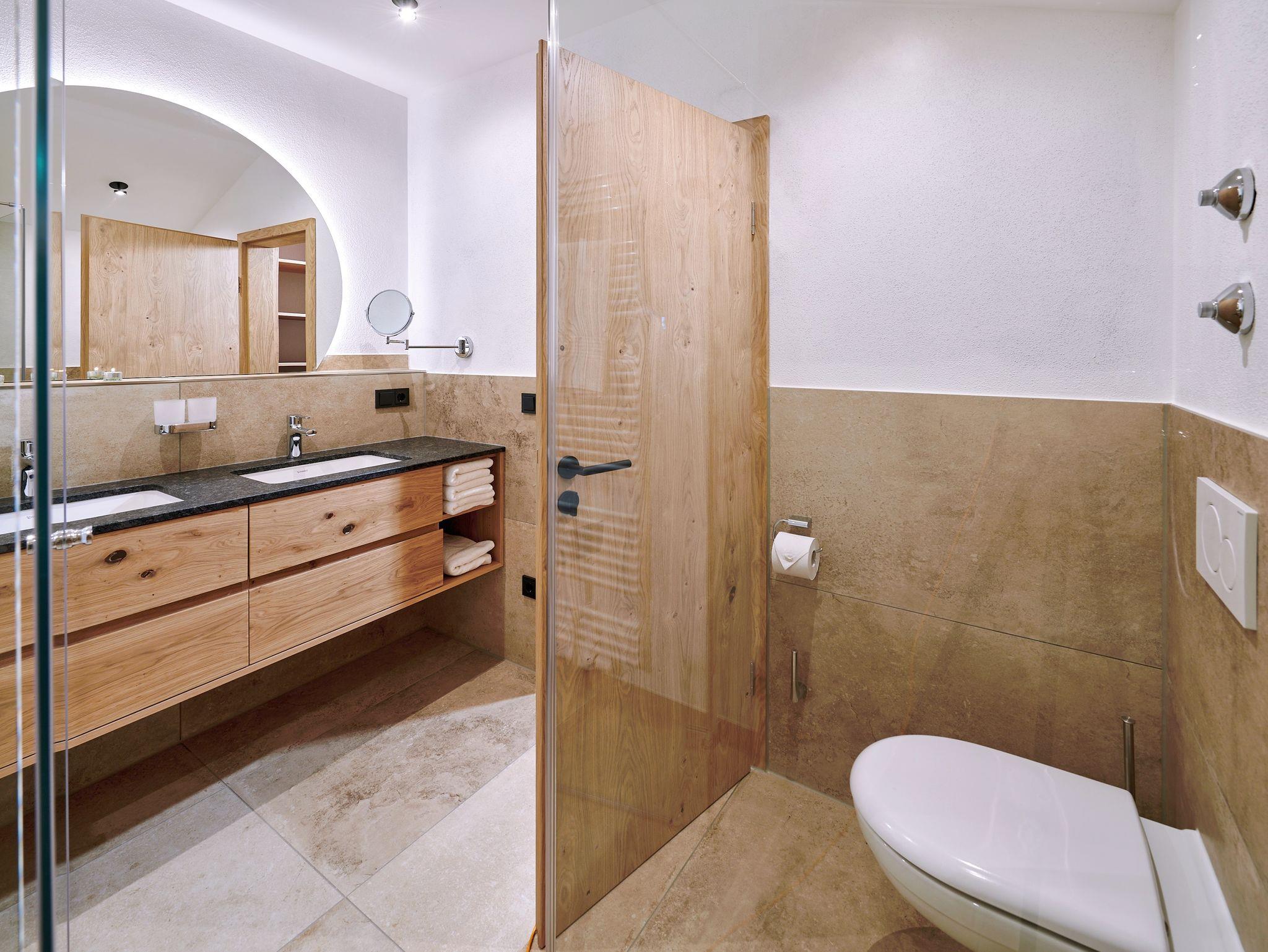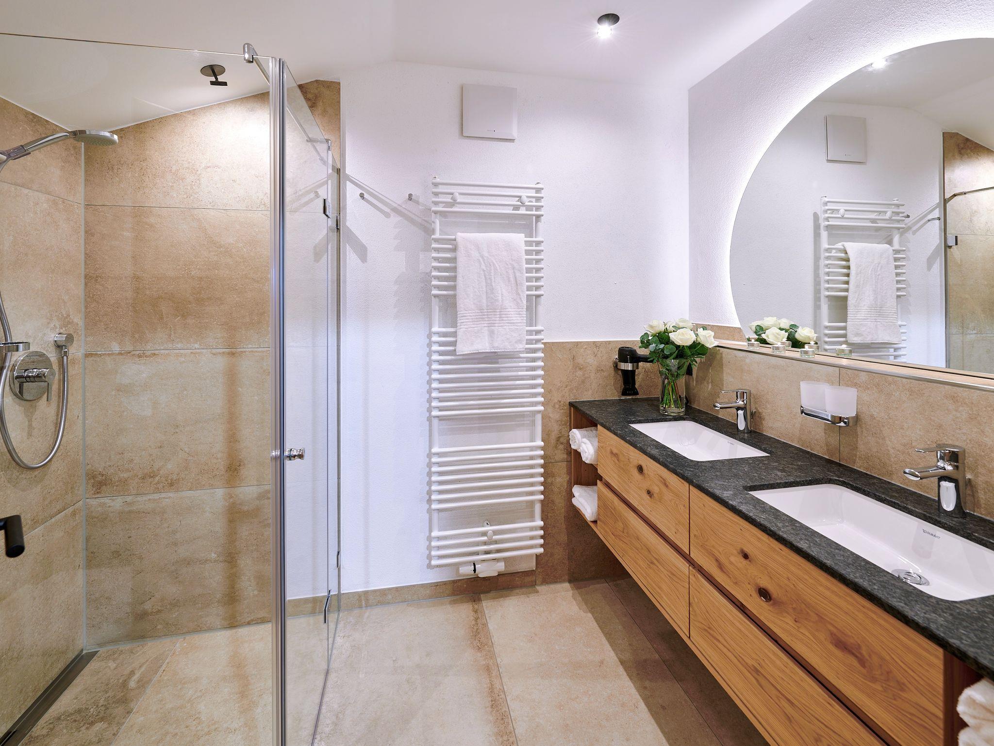 • 1 Badezimmer mit begehbarer bodengleicher Regendusche, Doppelwaschtisch, WC, Föhn, beheizbarem Handtuchtrockner und Schminkspiegel