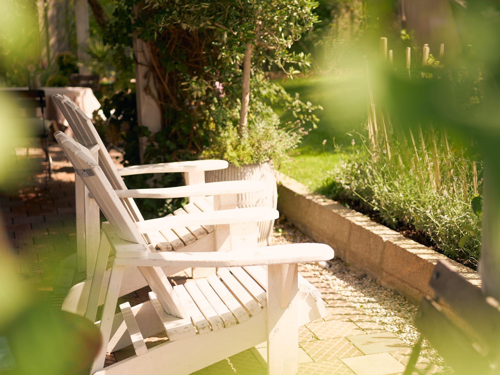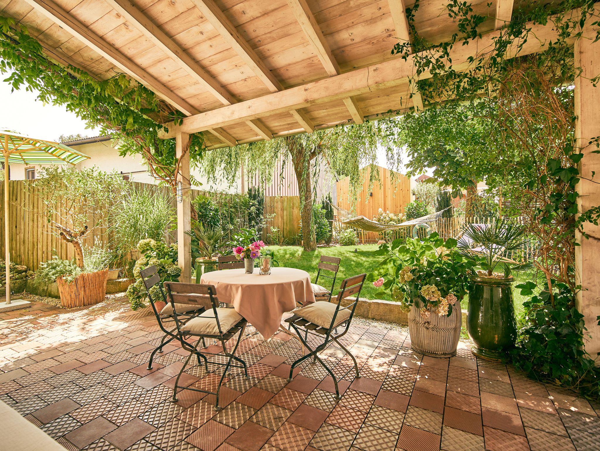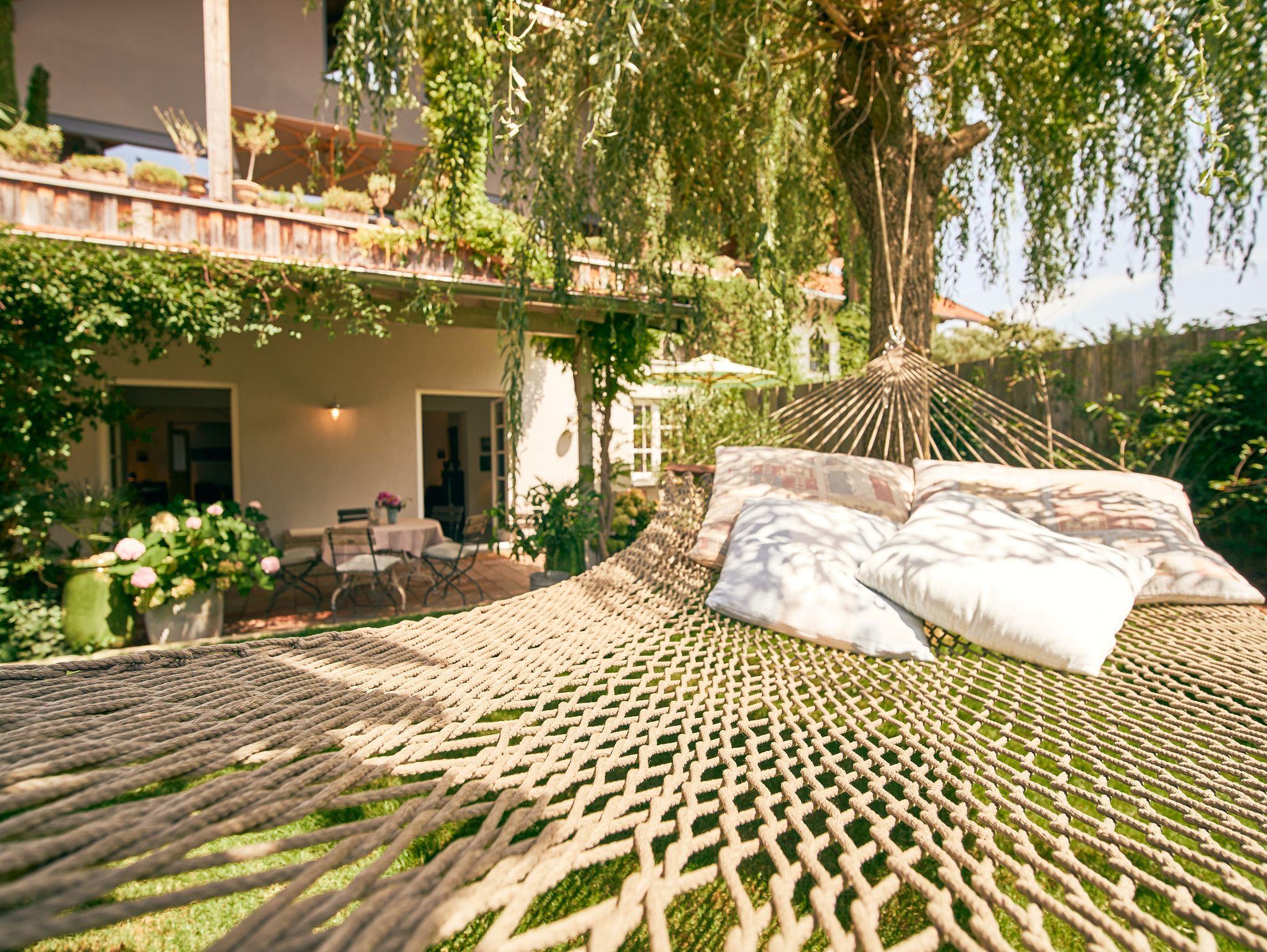 30qm Terrasse mit Garten, Hängematte, Liegestühlen