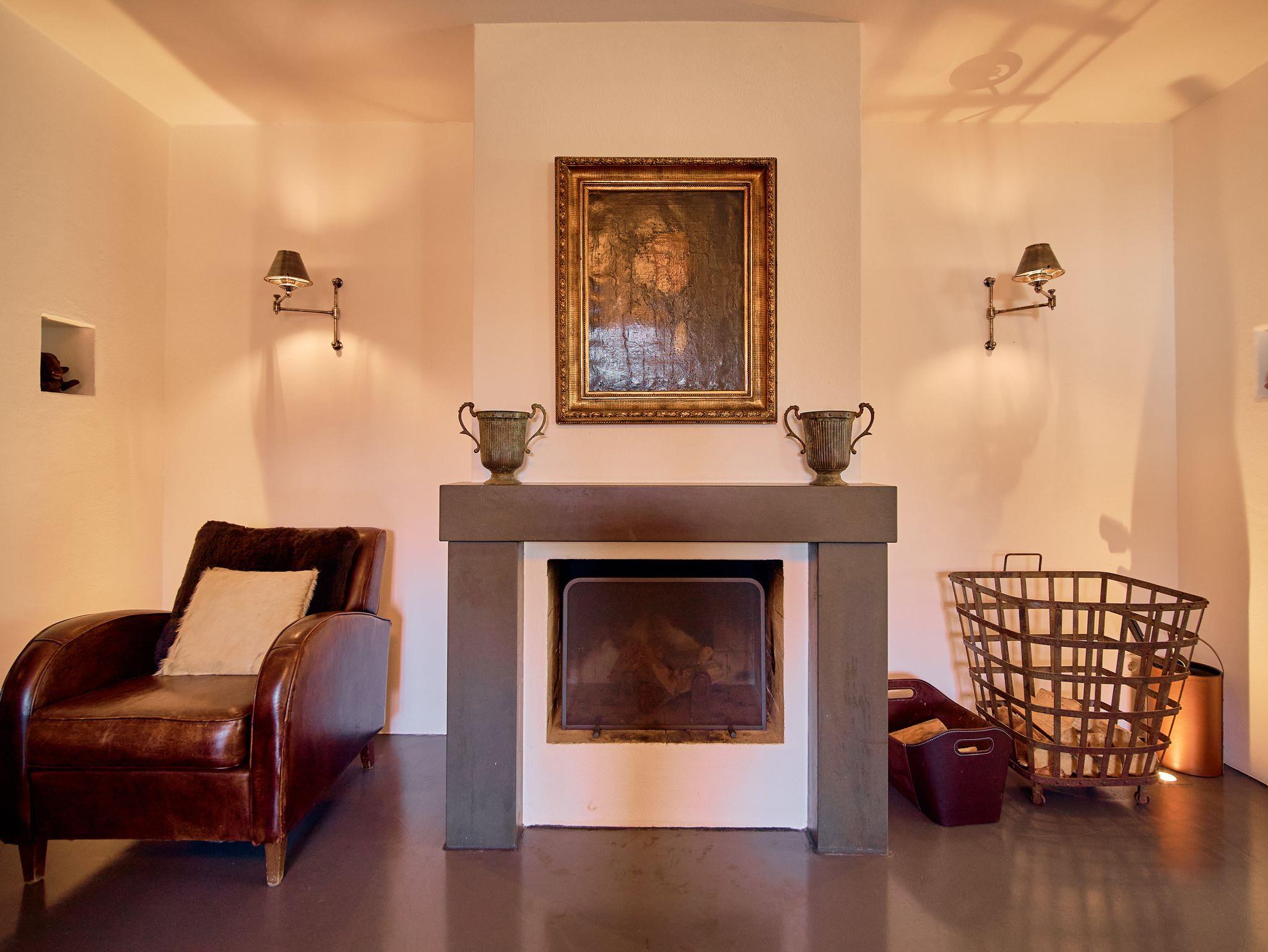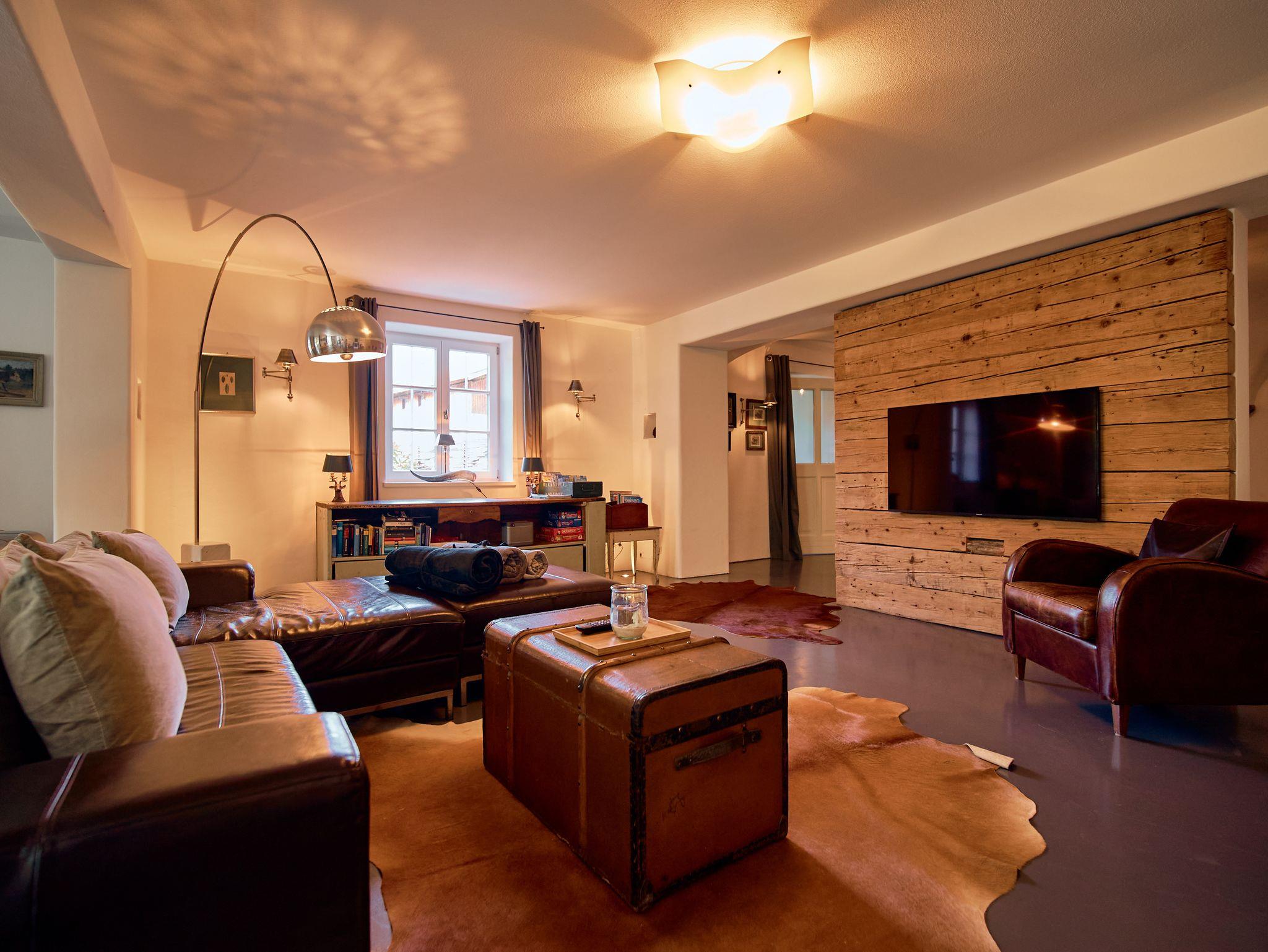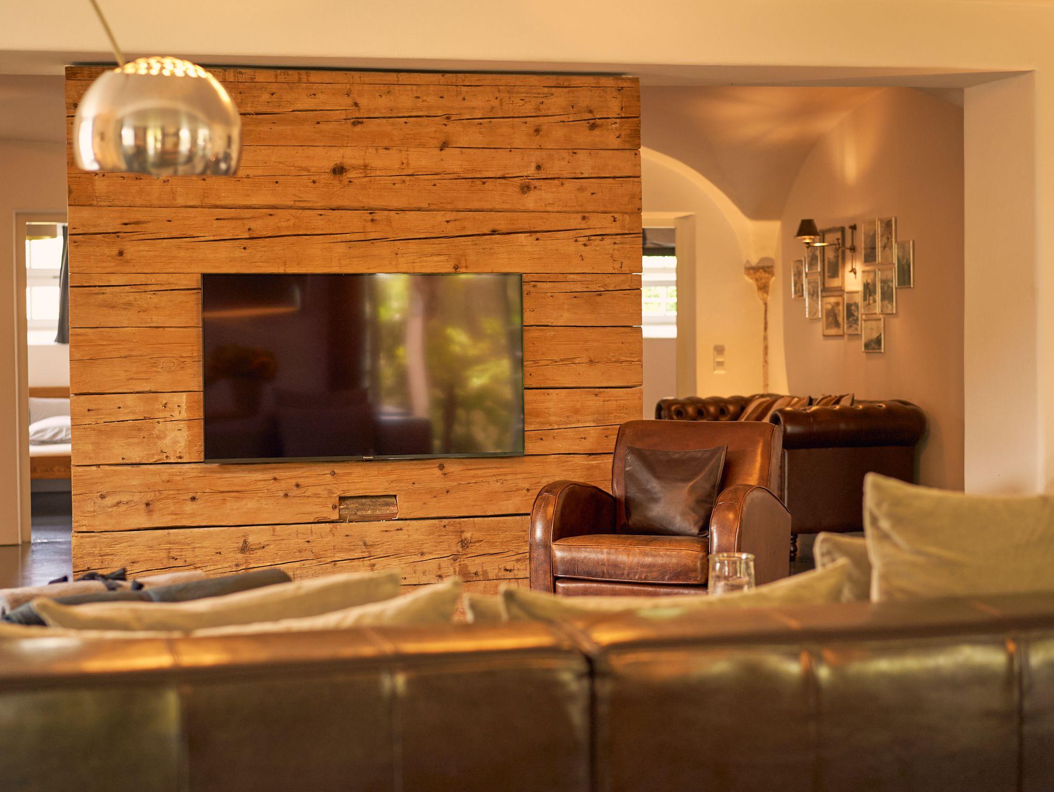 1 großer Wohnbereich: Sofa, Sessel, offener Kamin und TV