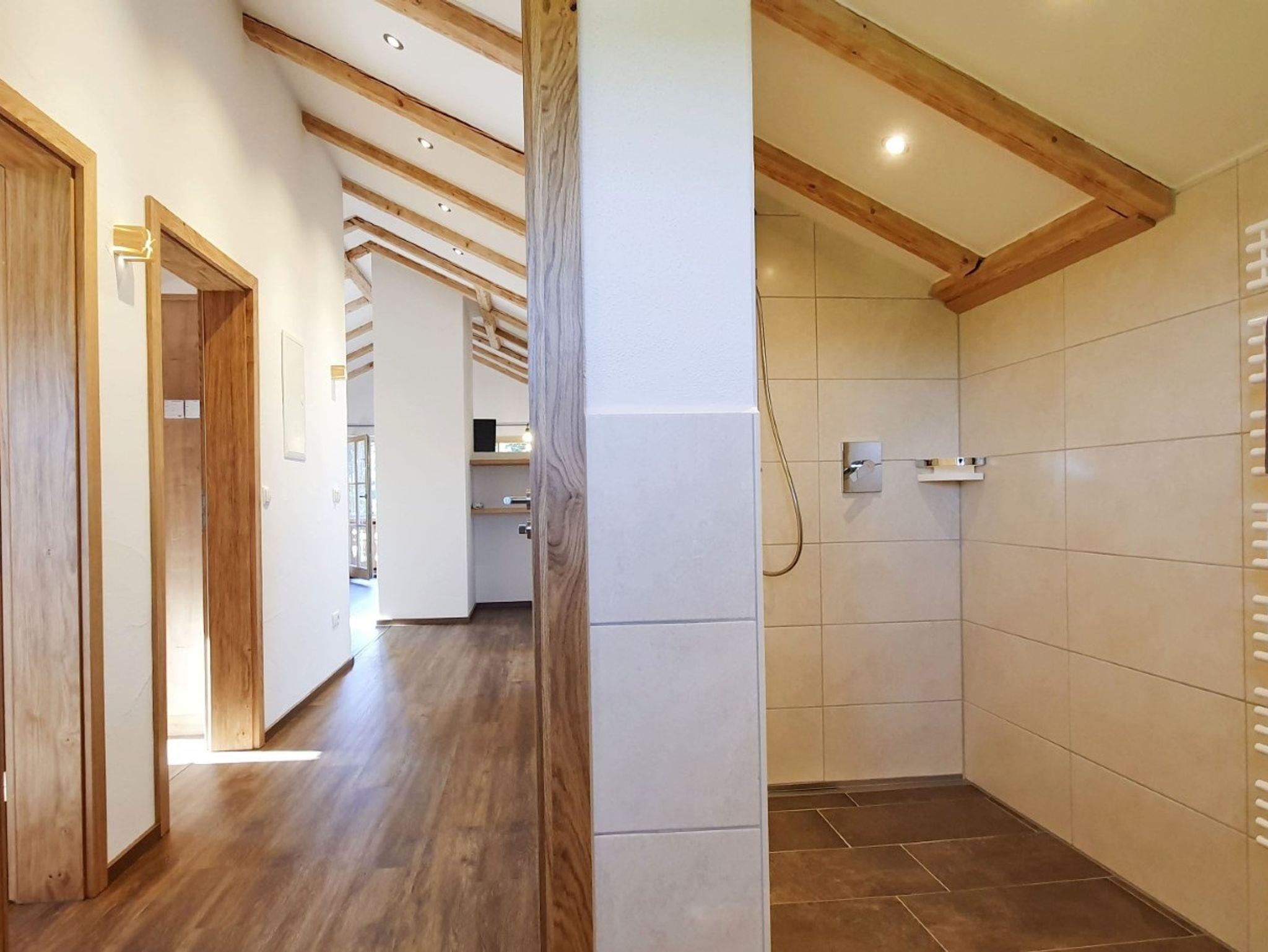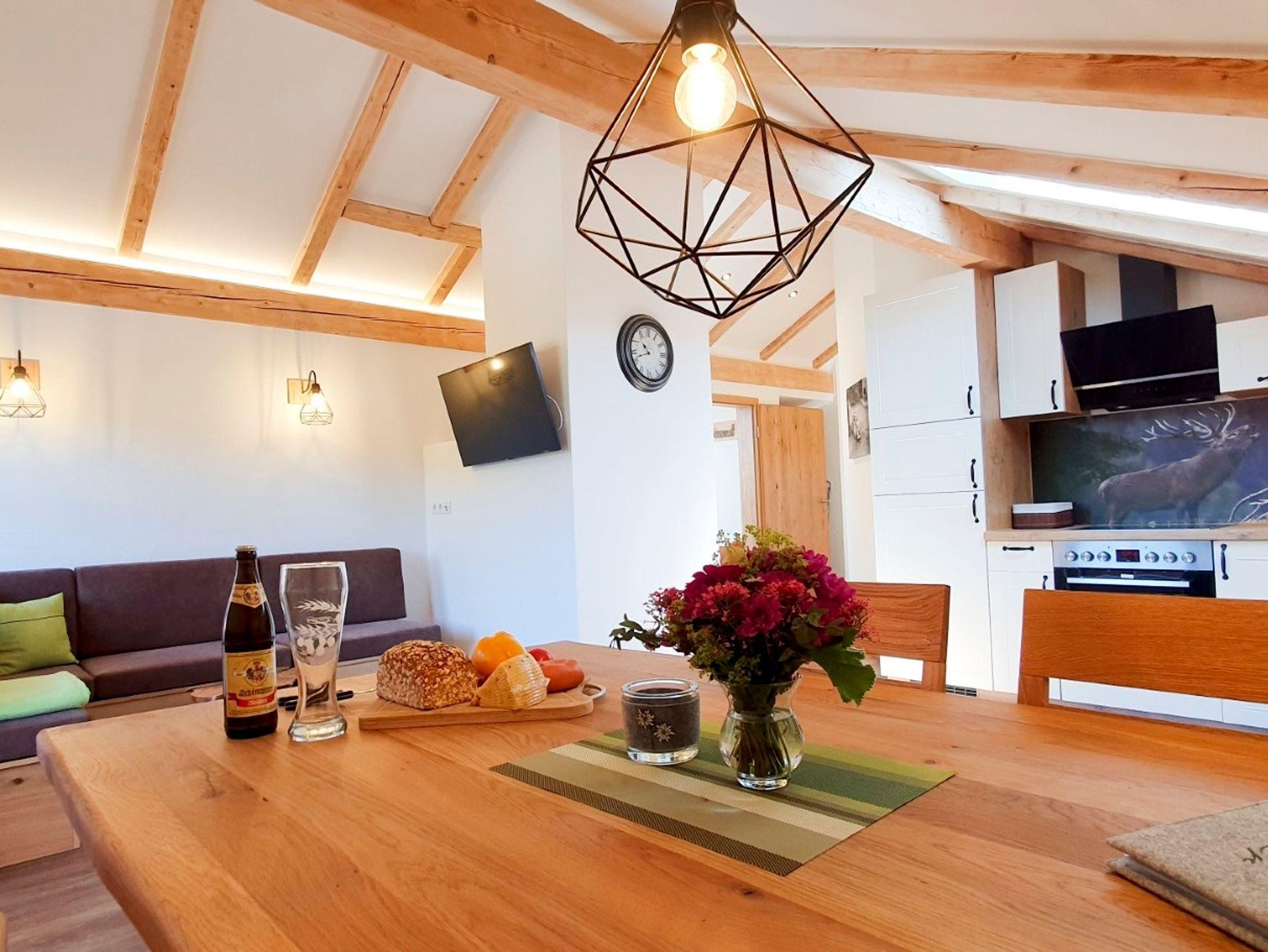 Im Dachgeschoss unseres neu renovierten Bauernhauses befindet sich die ca. 60m² große, liebevoll eingerichtete Ferienwohnung mit großer Wohnküche (mit Essecke, Couch, Fernseher, Radio, Küchenzeile mit Kühlschrank, Tiefkühlfach, Kaffeemaschine, Eierkocher, Wasserkocher, Toaster, Herd, Backofen und Spülmaschine). Das Elternschlafzimmer ist mit einem Doppelbett, extra Fernseher und hochwertigen Bettdecken und Kissen ausgestattet, welche Großteiles aus eigener Alpaka-Wolle hergestellt wurden und ideal geeignet sind für Allergiker. Im Kinderzimmer befinden sich zwei Einzelbetten. Im Bad befindet sich eine große Dusche, WC und auch ein Schminkspiegel und Fön sind vorhanden. Auch ein Babybett und einen Hochstuhl können Sie bei uns nutzen. Der eigene Balkon der Ferienwohnung ist nach Süden ausgerichtet und bietet mit den Balkonmöbeln Platz zum Entspannen.