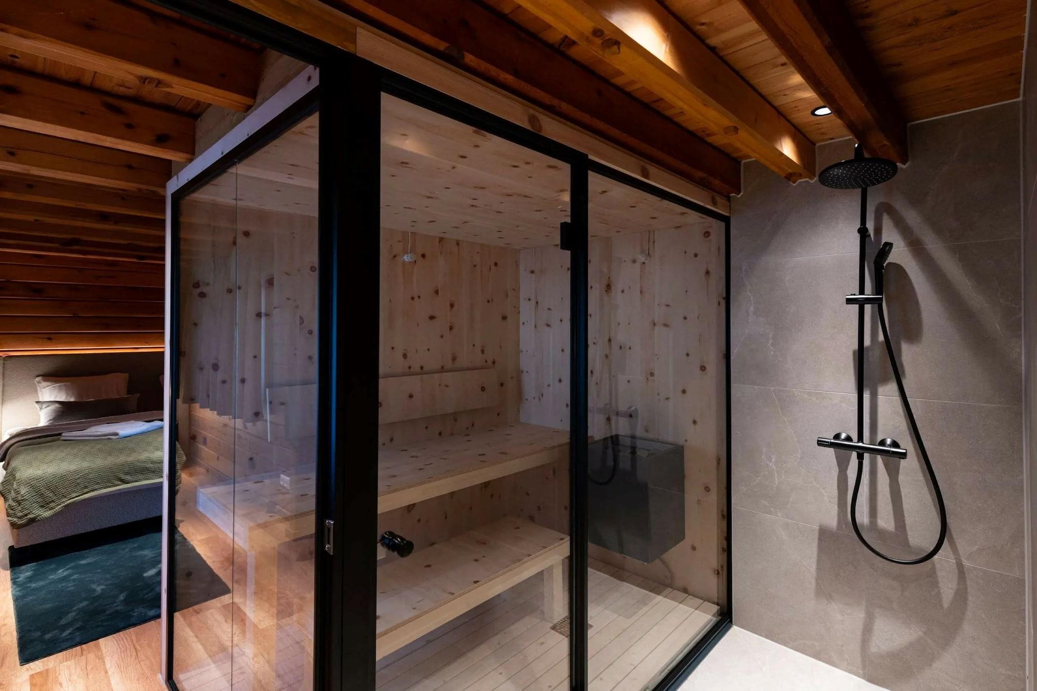Stueetage: (åbent køkken(spisebord, elkedel, brødrister, komfur(Komfur med fire kogeplader, glaskeramisk), kaffemaskine, ovn, opvaskemaskine , køleskab), stue / spisestue(dobbeltsovesofa, Fjernsyn, pejs, sofahjørne), soveværelse(dobbeltseng(boxmadras, 180 x 200 cm)), badeværelse(bruser, sauna, håndvask, toilet, føntørrer), toilet) terrasse, havemøbler, solstole, parkering, Vaskeripakke inkl.