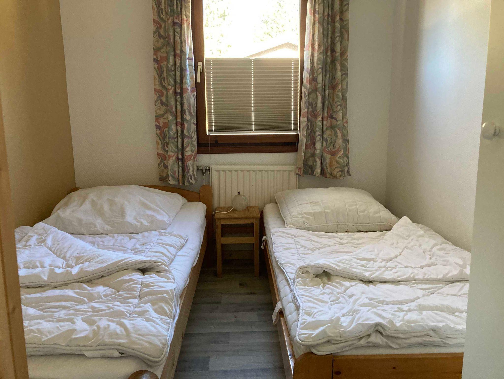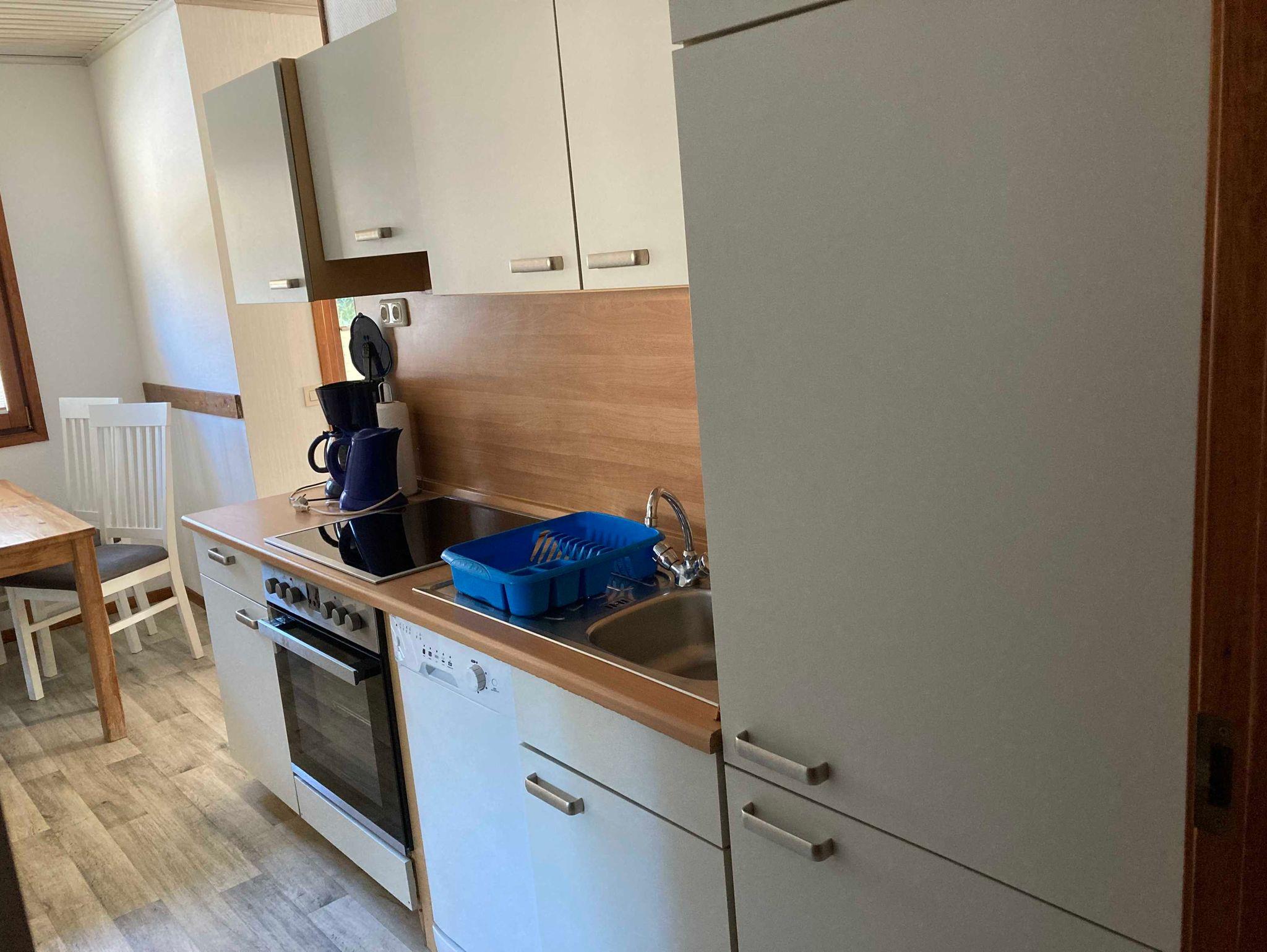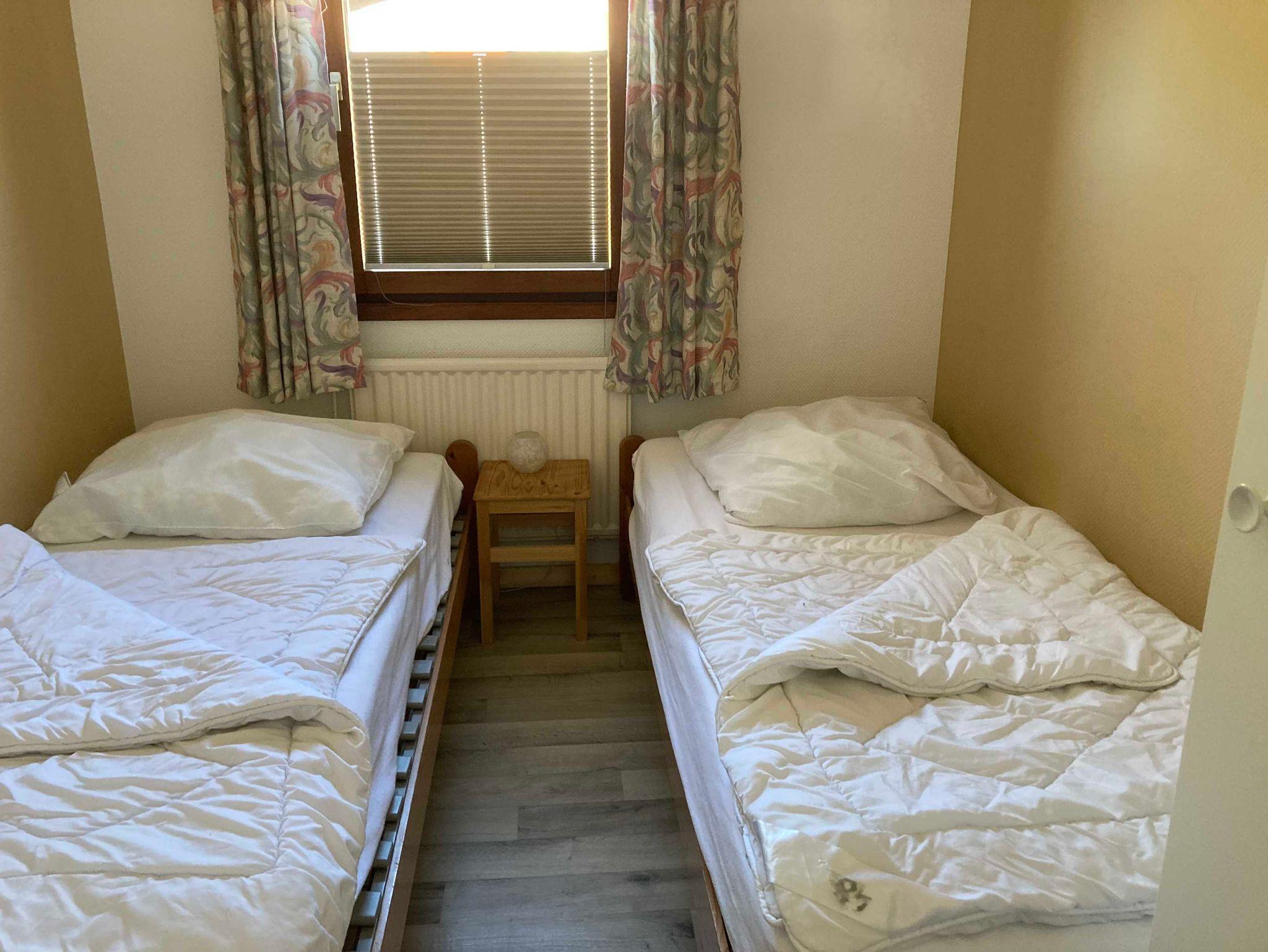In diesem Ferienhaus befinden sich ein Wohnzimmer mit Kaminofen, eine Küche (4-Plattenherd, Backofen, Wasserkocher) mit Essbereich, zwei Schlafzimmer mit zwei Einzelbetten, ein Schlafzimmer mit einem 1,20 m breiten Bett und ein Bad mit Dusche. Am Ferienhaus befindet sich noch eine überdachte Terrasse.