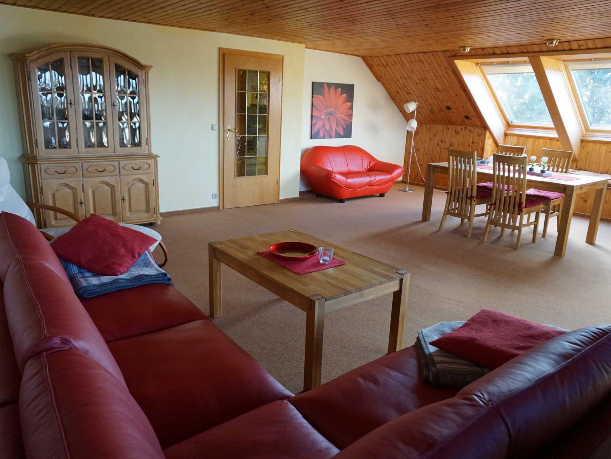 - ein gemütlich und geschmackvoll eingerichtetes Wohnzimmer im Obergeschoss mit Panoramablick