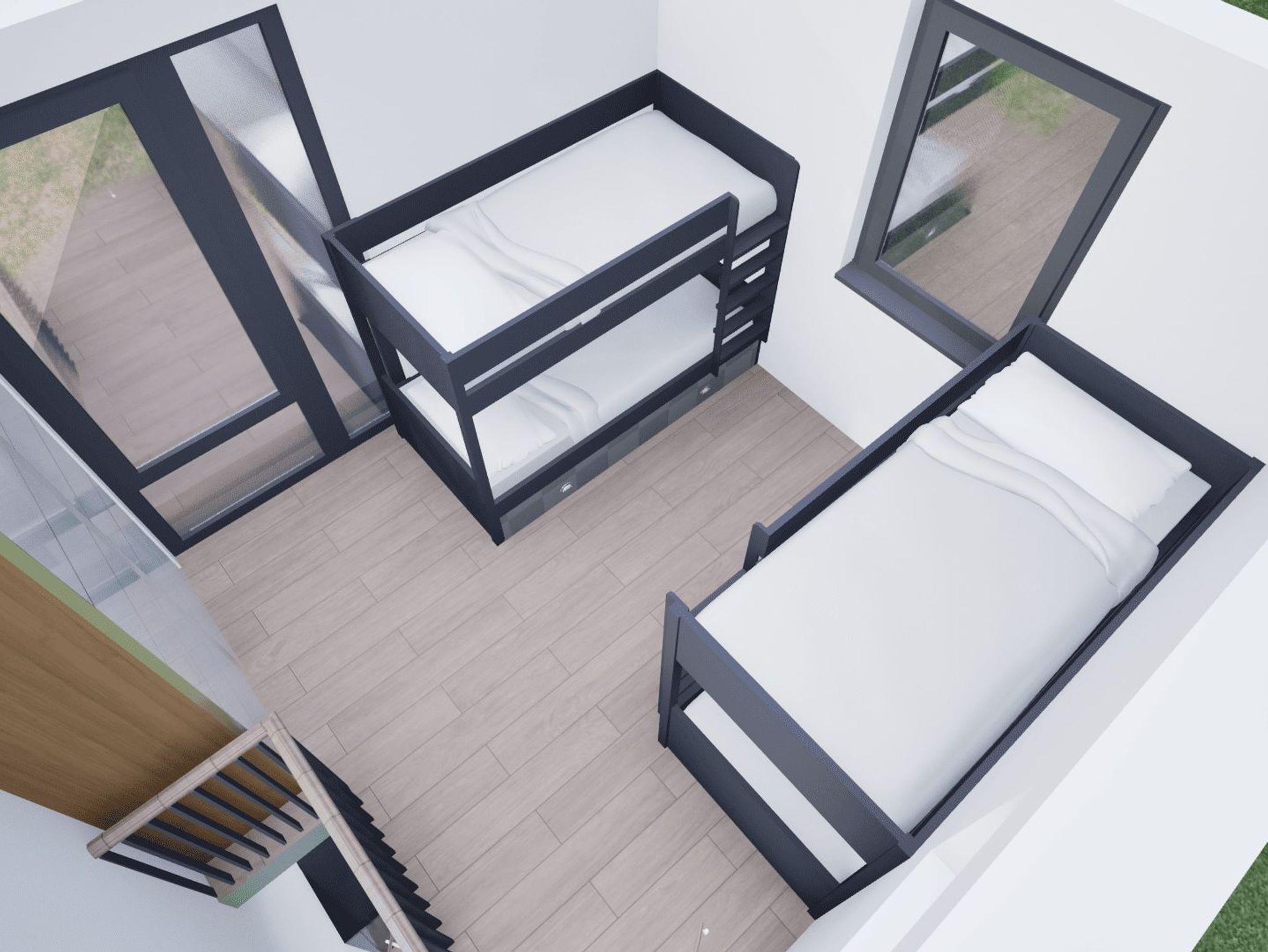 Das Tiny Haus Dorfmitte bietet Platz für bis zu sechs Personen und überzeugt durch einen modernen Urban-Einrichtungsstil. Im Erdgeschoss befindet sich ein Schlafzimmer mit einem Doppelbett inklusive Stauraum, Nachttischen und Kleidergarderobe. Im Obergeschoss stehen zwei Stockbetten mit Nachttischen und Kleiderschrank bereit. Bettwäsche ist für alle Schlafplätze vorhanden.
