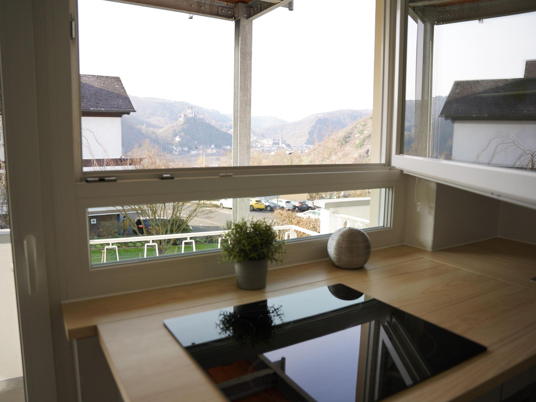 12 komfortable ***Ferienwohnungen, Wohn-Essraum mit komplett ausgestatteten Küchenzeilen (mit Spülmaschine), 1 , 2 oder 3 separate Schlafzimmer. Ruhige, idyllische Lage mit herrlichem Panoramablick auf Cochem und die Mosellandschaft, aber trotzdem stadtnah und optimaler Ausgangspunkt für Wanderungen im nahe gelegenen Wald. Freizeitraum mit Tischkicker, Billard und Tischtennis sowie eine Sauna.