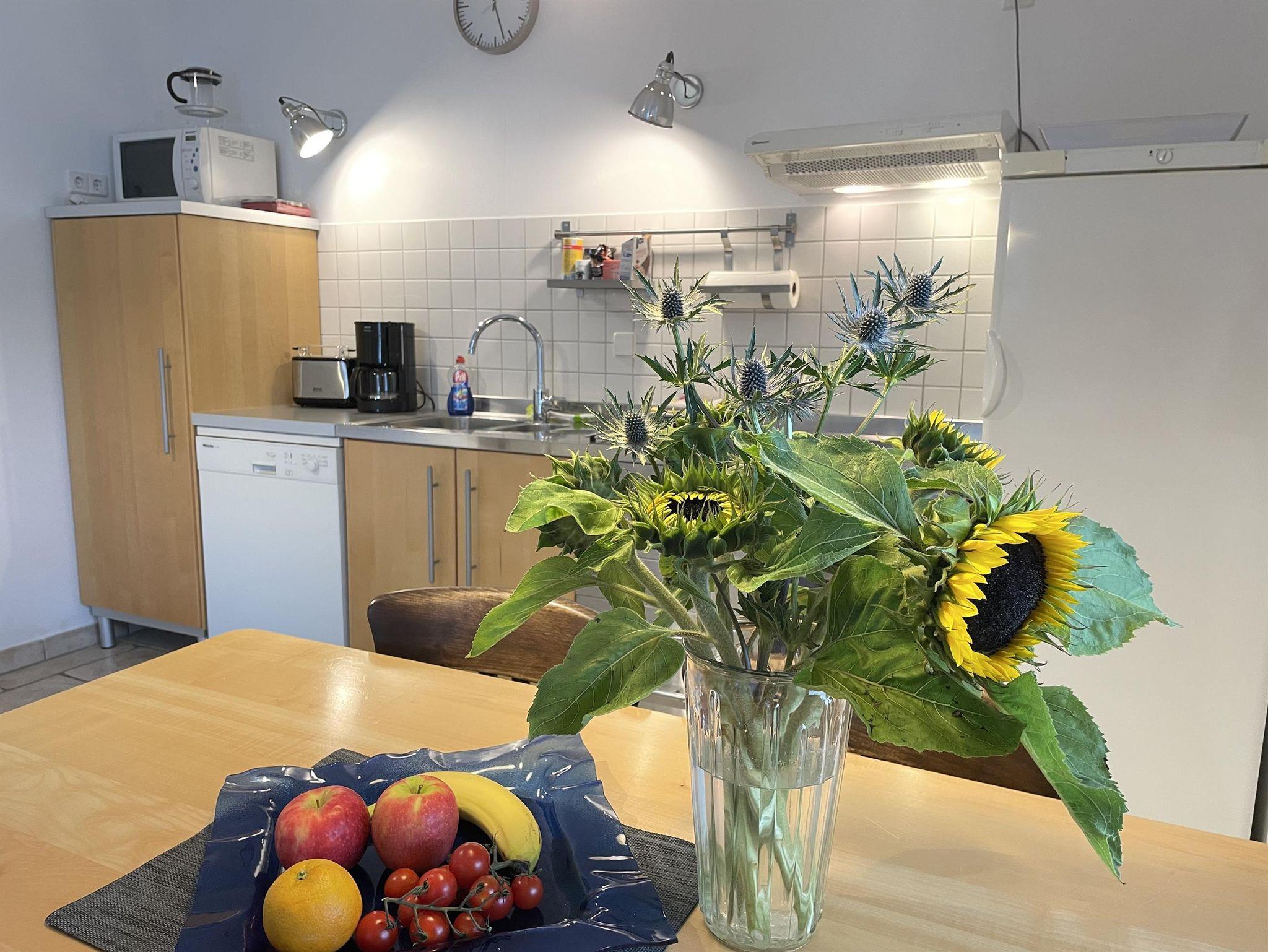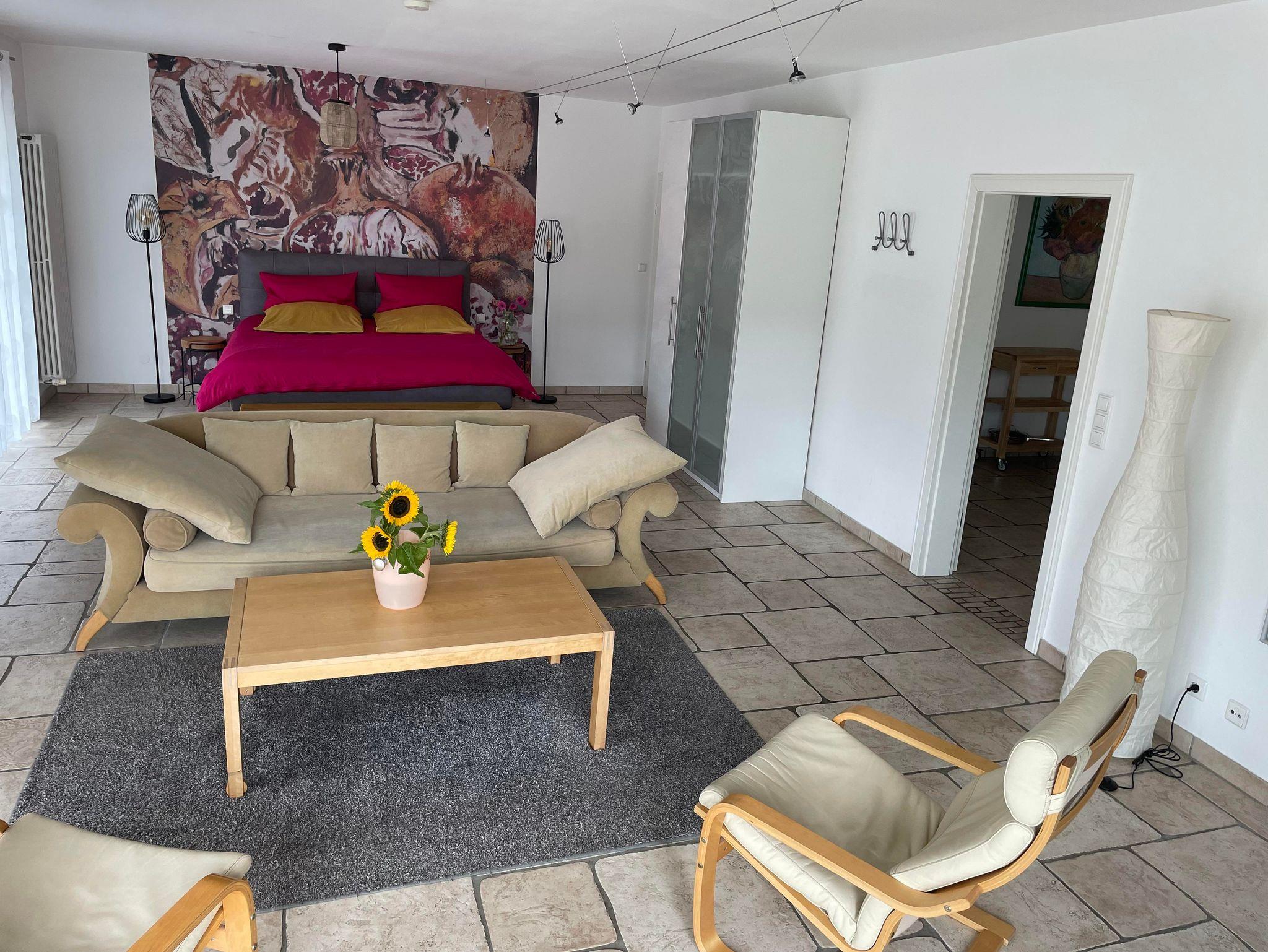 Die neu eingerichtete 70 qm Ferienwohnung besteht aus einem großen Wohn-/Schlafraum mit gemütlichem Kamin, einer voll ausgestatteten Küche und Badezimmer mit Dusche/WC. Direkt vor der Ferienwohnung befindet sich eine 100 m² große Freiterasse mit Gartenmöbeln zur alleinigen Nutzung.