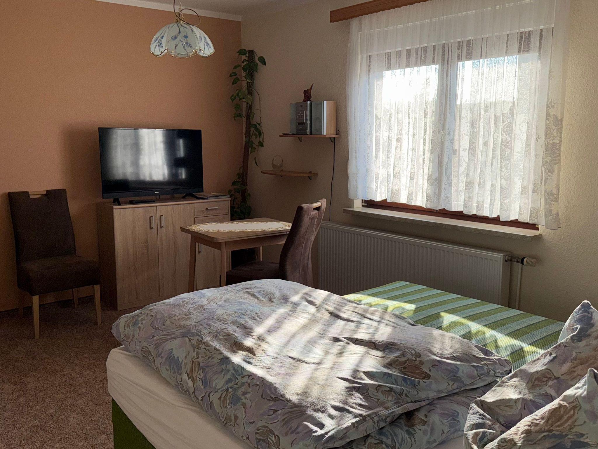 Bettwäsche vorhanden, Doppelbett, Fernseher/TV, Handtücher vorhanden, Kühlschrank, Nichtraucherzimmer, Sitzgruppe, WLAN (WiFi), WLAN im Zimmer. Lage: Haupthaus, Souterrain Doppelzimmer. Sanitär Leistung: WC und Dusche