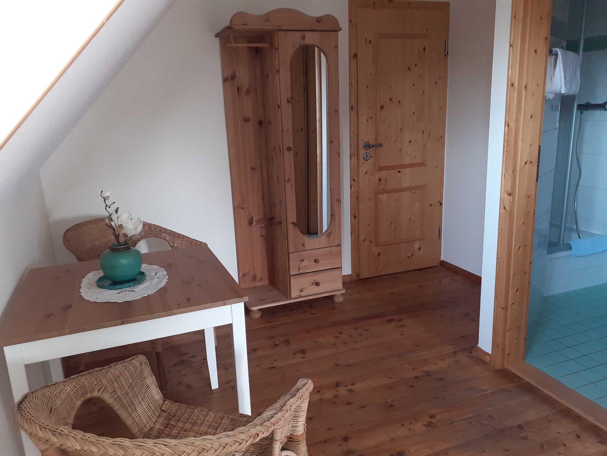 Im Zimmer befindet sich ein großer Kleiderschrank, eine Sitzgelegenheit sowie eine Garderobe.