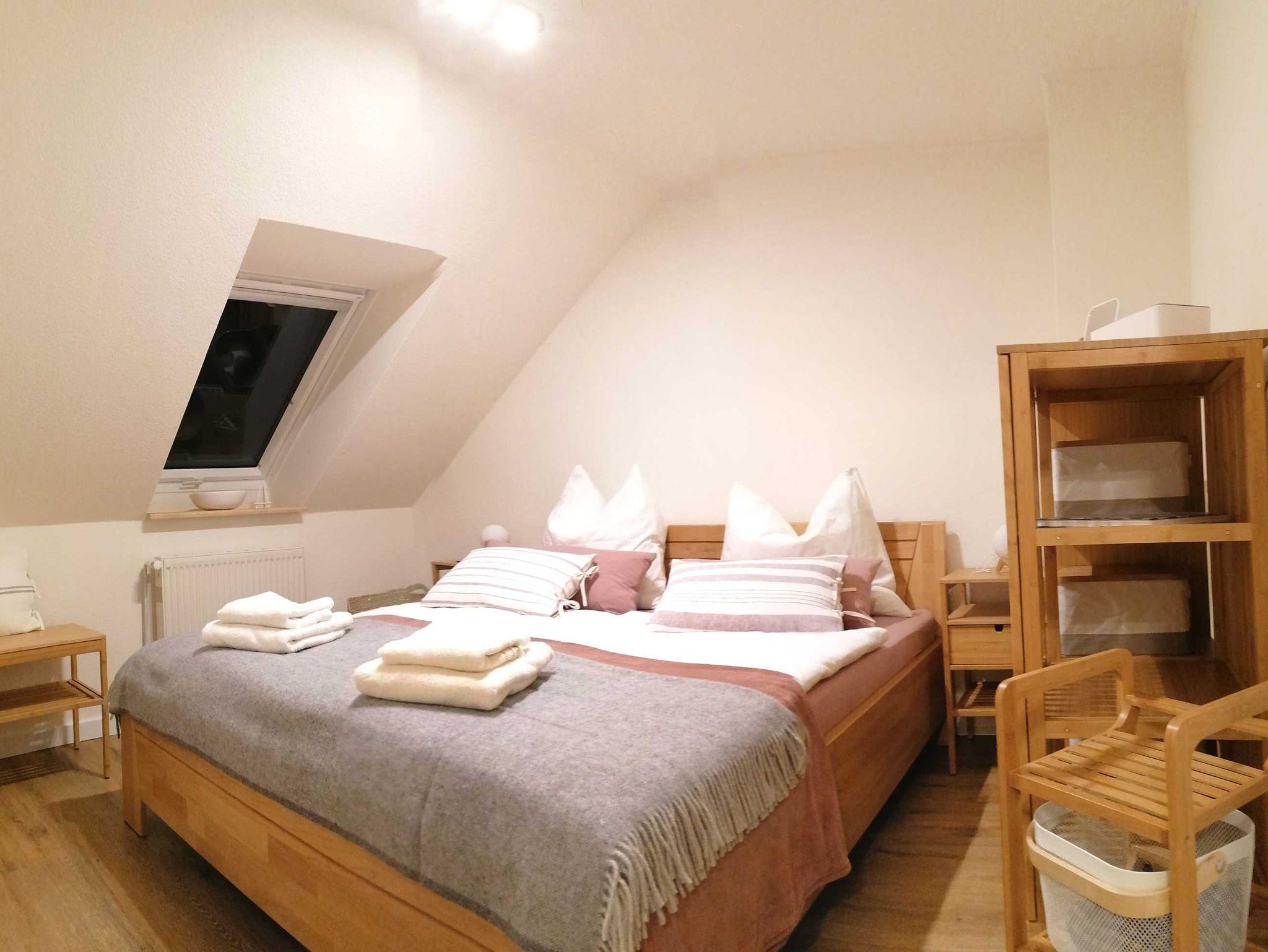 Unsere 74 m² Nichtraucher-Ferienwohnung befindet sich in der ersten Etage unseres Hauses und hat 1 Wohnzimmer, 1 Küche und 2 Schlafzimmer (SZ 1 mit einem Doppelbett und SZ 2 mit 2 Einzelbetten, sowie ein Badezimmer mit Dusche und WC..