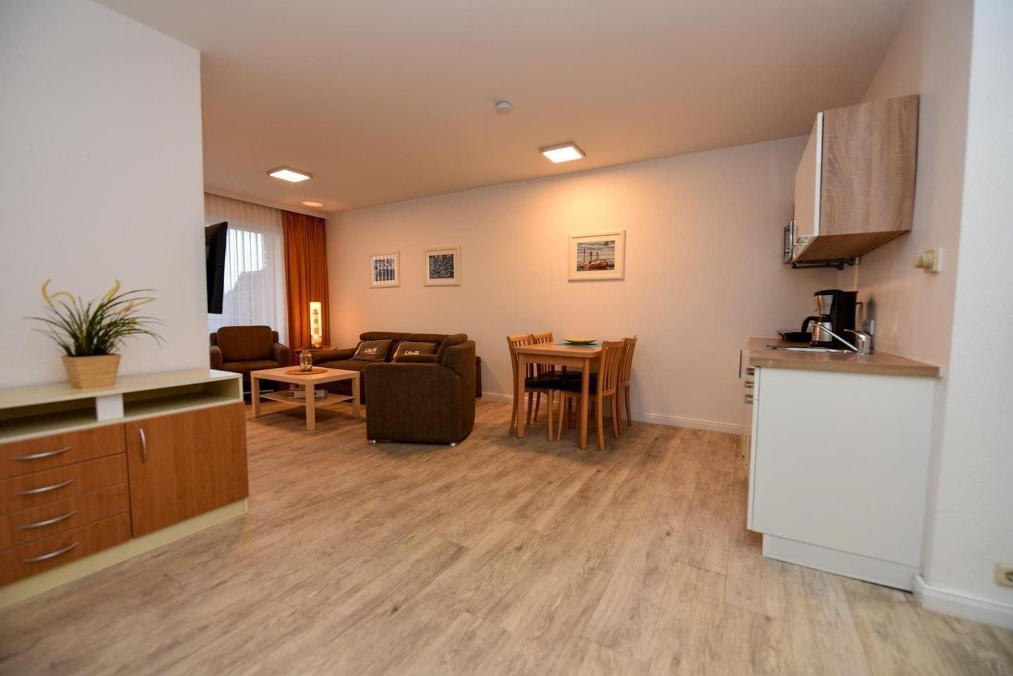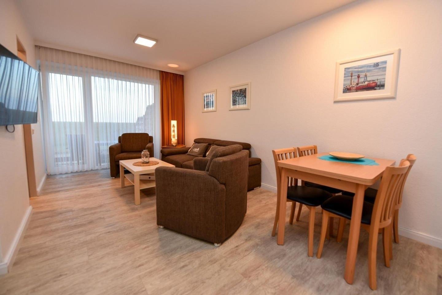 3-Zimmer Appartement im Haus "Nige Wark", bestehend aus einem Kinderzimmer mit Etagenbett und einem Schlafzimmer mit Doppelbett. Im Wohnzimmer befindet sich eine Couch, zwei Sesseln und ein Flat- TV sowie eine integrierte Küchenzeile die u.a. mit Spülmaschine, Mikrowelle und Kühlschrank mit Gefrierfach ausgestattet ist. Das Appartement verfügt über 2 Badezimmer die jeweils mit einer Dusche und WC ausgestattet sind. Größe ca. 50qm. Die Wohnung liegt im Erdgeschoß und hat eine Terrasse zur Seeseite.