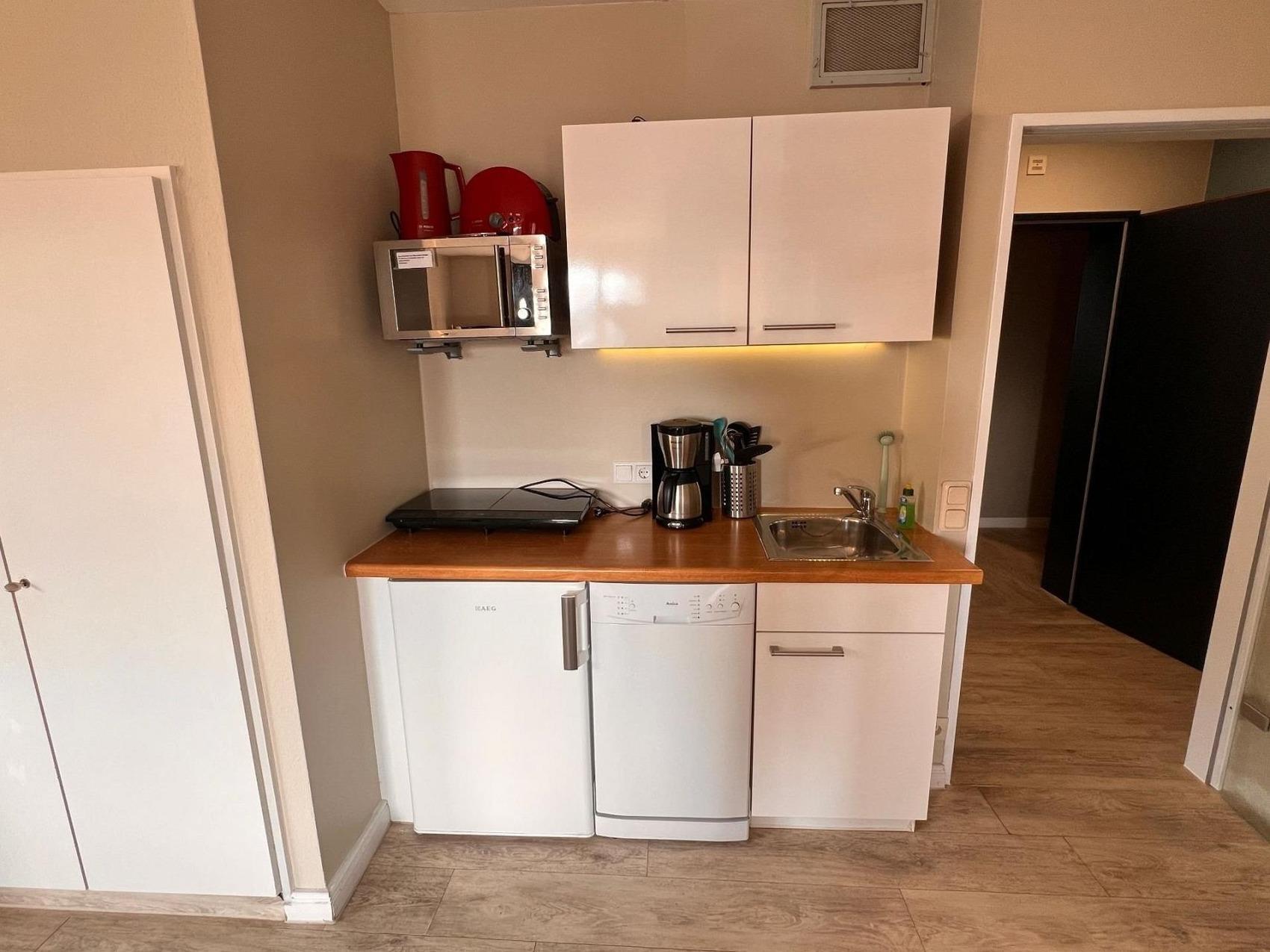 Die im Wohnraum integrierte Küchenzeile ist modern ausgestattet mit Spülmaschine, Mikrowelle sowie Kühlschrank mit Gefrierfach und bietet alles für einen komfortablen Aufenthalt.