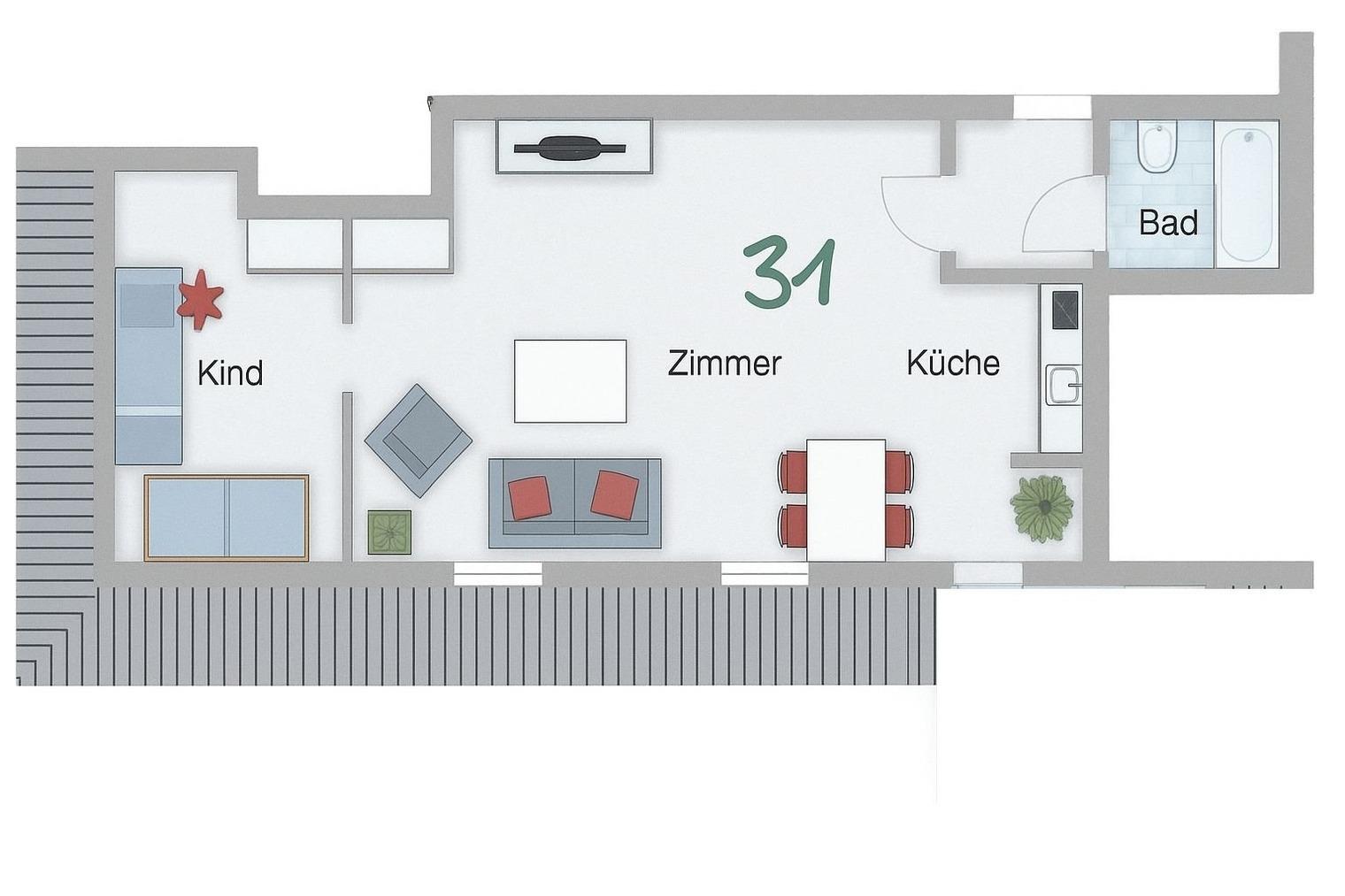 2-Zimmer Appartement im Haus "Nige Wark", bestehend aus einem Schlafzimmer mit zwei Einzelbetten und einem Wohnzimmer. Im Wohnzimmer befindet sich ein gemütliches Zweisitzer-Sofa mit zwei Sesseln und ein Flat- TV sowie die integrierte Küchenzeile mit Spülmaschine, Mikrowelle und Kühlschrank mit Gefrierfach. Der ausziehbare Esstisch bietet genügend Platz für alle. Zusätzlich verfügt das Appartement über ein Schrankbett. Das Badezimmer ist mit einer Dusche und WC ausgestattet.